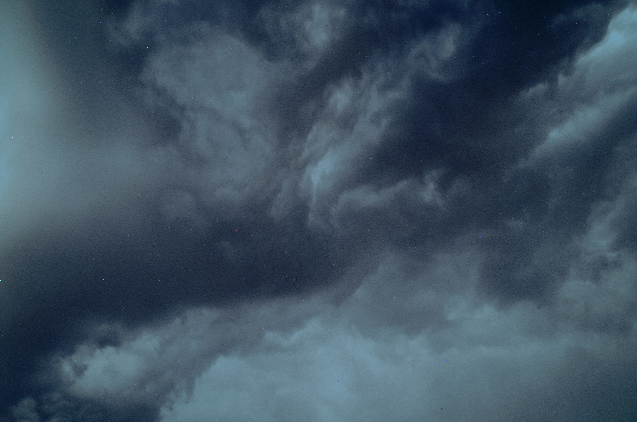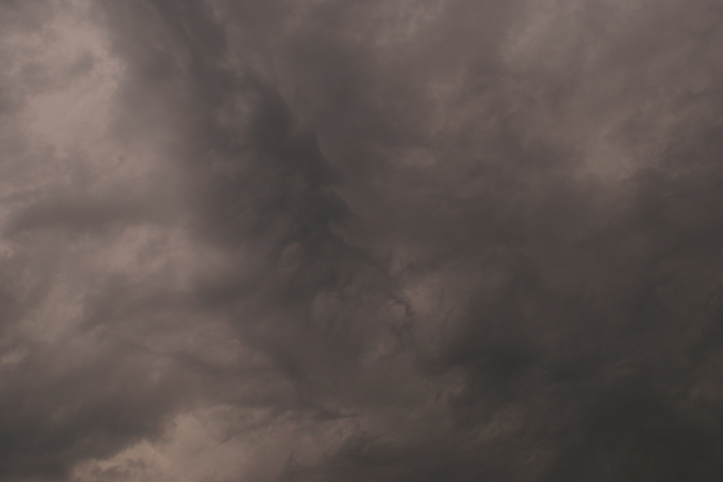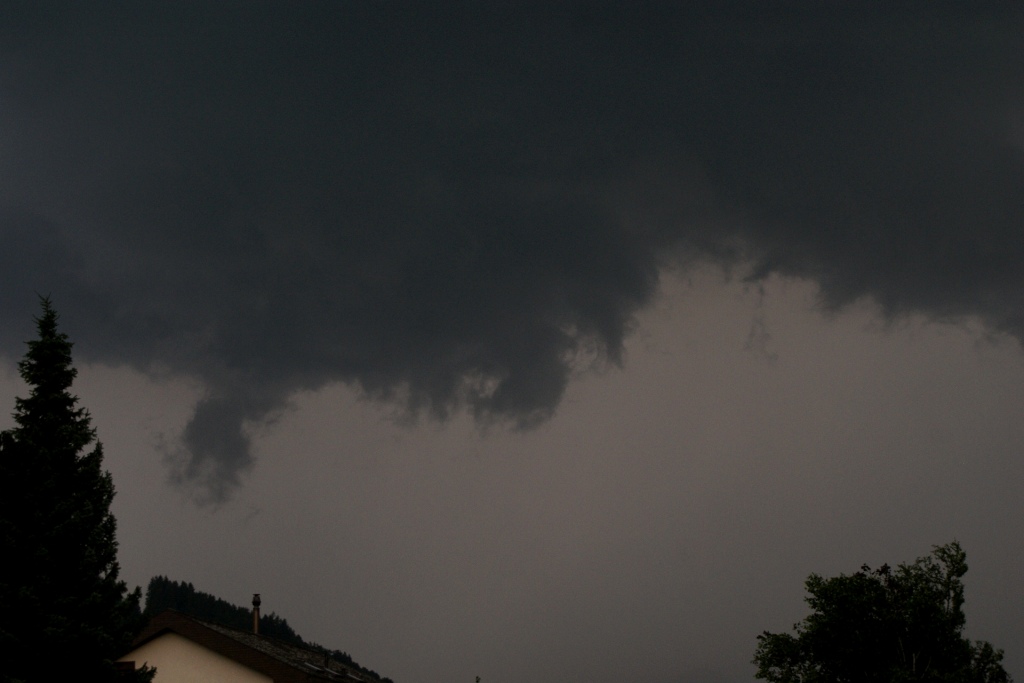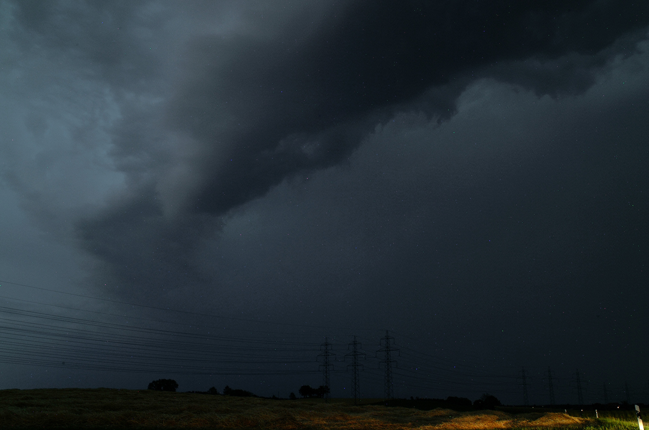 Gegen Süden zuvor leicht grünliche Färbung der Wolken, gegen Westen ansatzweise Shelfstrukturen und hier gegen Osten (Bild) eine Böenfront