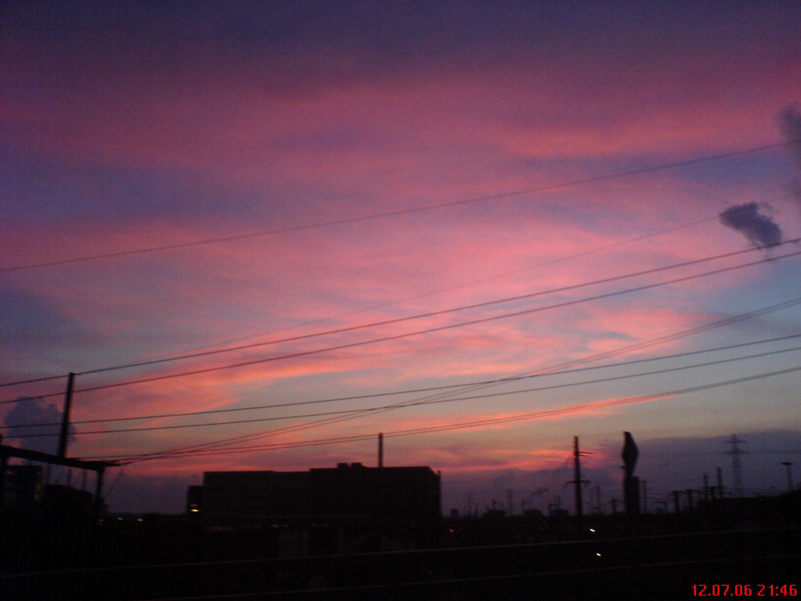 Die Uebereste des Eisschirmes, bzw. die Cirren Richtung Westen, werden von der untergehenden Sonne beschienen und sorgen für einen wunderschönen FCB Himmel in den Farben rot, blau, ein bischen Fantasie muss dabei sein.