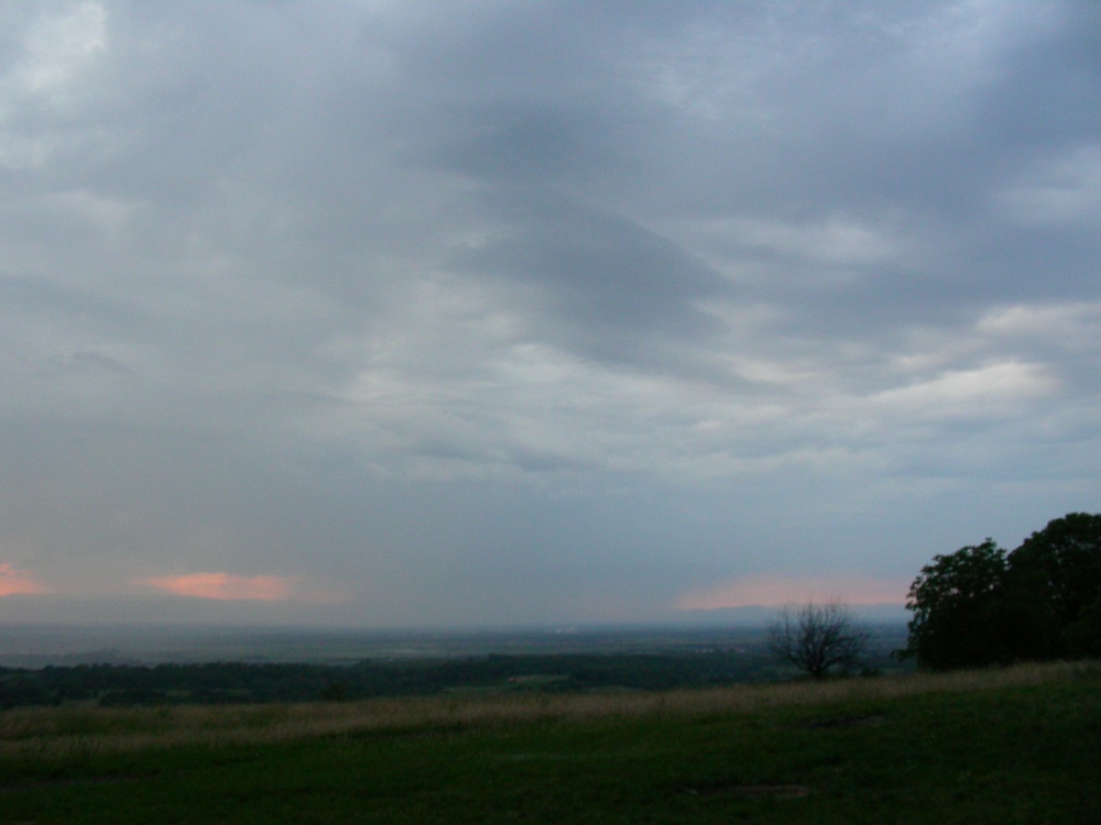 Ich postierte mich schließlich auf einem Berg bei Müllheim. Leider war von den Zellen recht wenig zu sehen, aufgrund der mittelhohen Bewölkung konnte ich weder die Schirme noch die Aufwindbasen erkennen. Hier ein Blick in Richtung Vogesen: