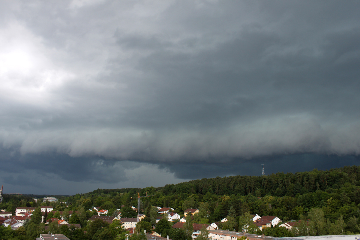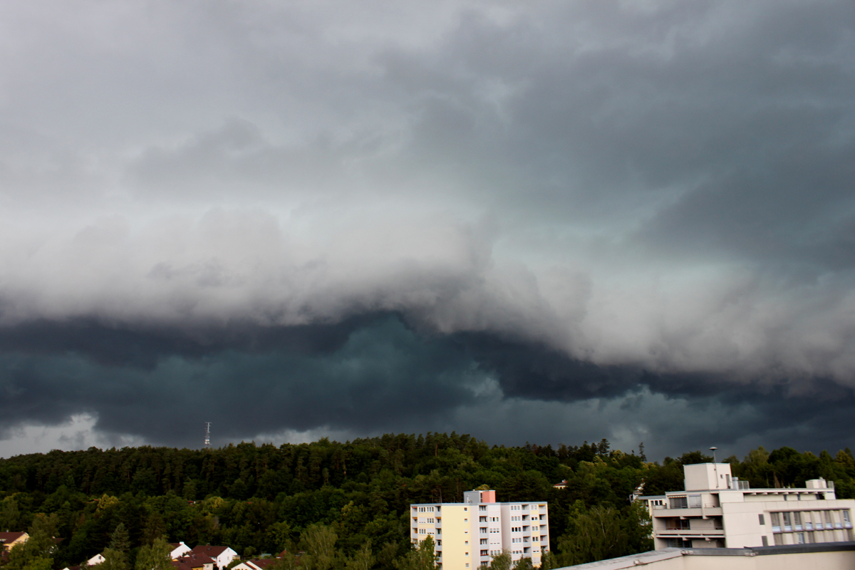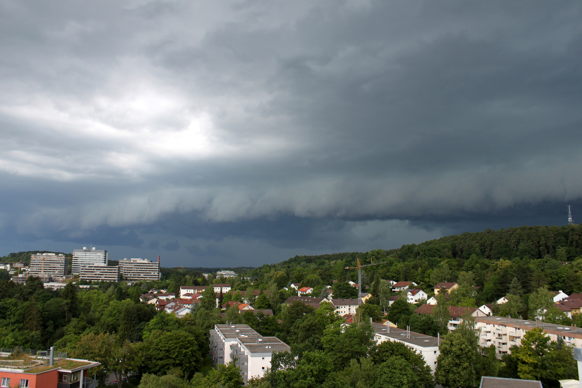 Es war soweit und endlich hat es mal geklappt! Schon als die Linie noch in Frankreich war, sah es eig. nicht schlecht aus. Als es dann aber präfrontal im Rheingraben ausgelöste und das Ganze noch über den Schwarzwald zu mir musste, war ich erneut eher pessimistisch. Gottseidank diesmal zu unrecht! Die Linie brach zwar auf, es bildeten sich aber kräftige, isoliertere Zellen welche auch die Schwarzwaldüberquerung gut überlebten. Eine dieser Zellen hielt auf meine Region zu. Anfangs konnte ich einen leichten S-drift auf dem Radar erkennen woraufhin ich mir überlegte ins Auto zu sitzen und weiter nach S zu fahren. Allerdings steuerte sie dann doch eher voll auf mich zu. Es formierte sich sogar eine - wieder total geschlossene - Linie auf der Leeseite des Schwarzwalds. Von da an war ich permanent auf dem Dach um die heranrollende Linie beobachten zu können. Bereits relativ früh zeigte sich, dass es vllt gröber kommen könnte und man sah bereits Strukturen einer shelf cloud: