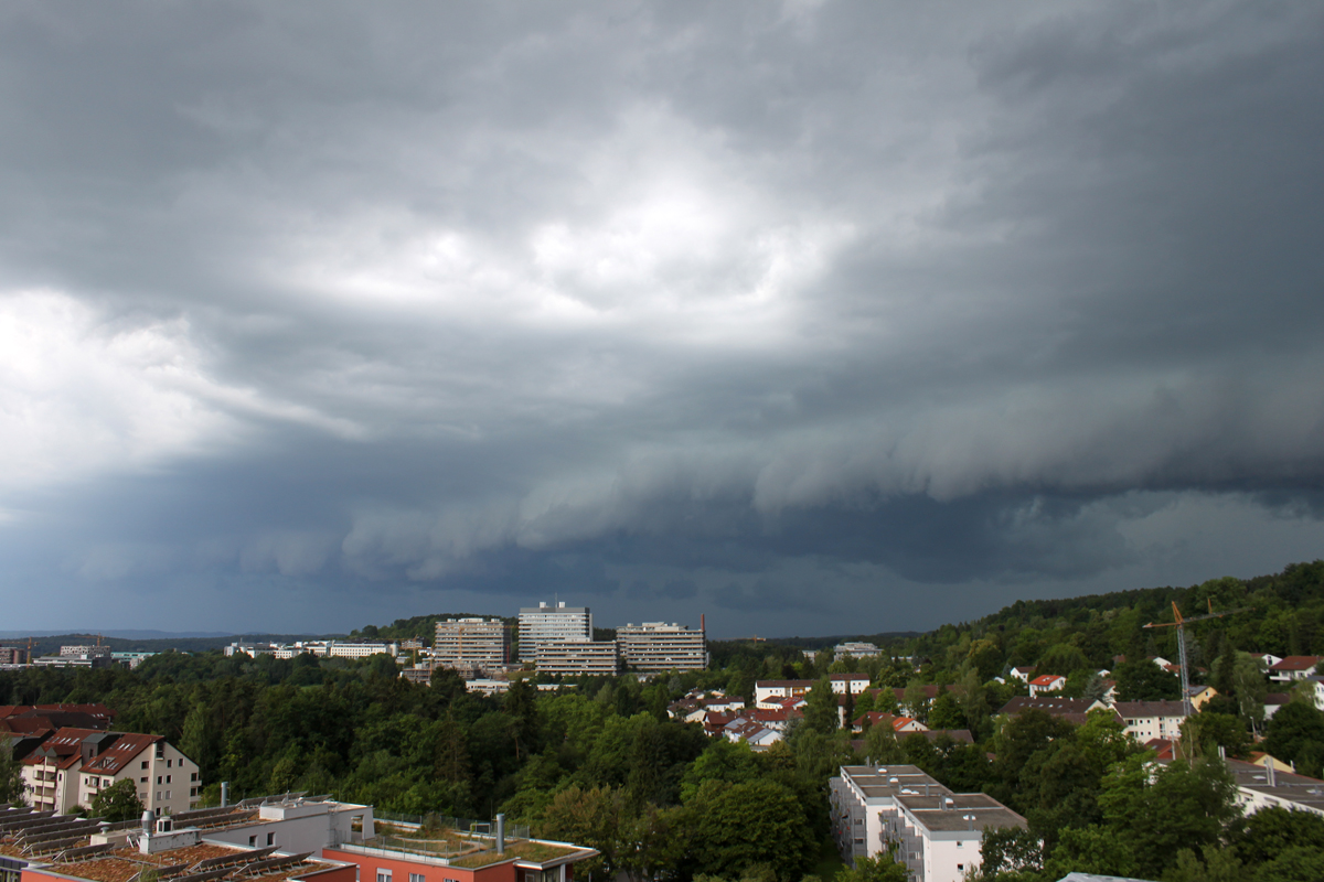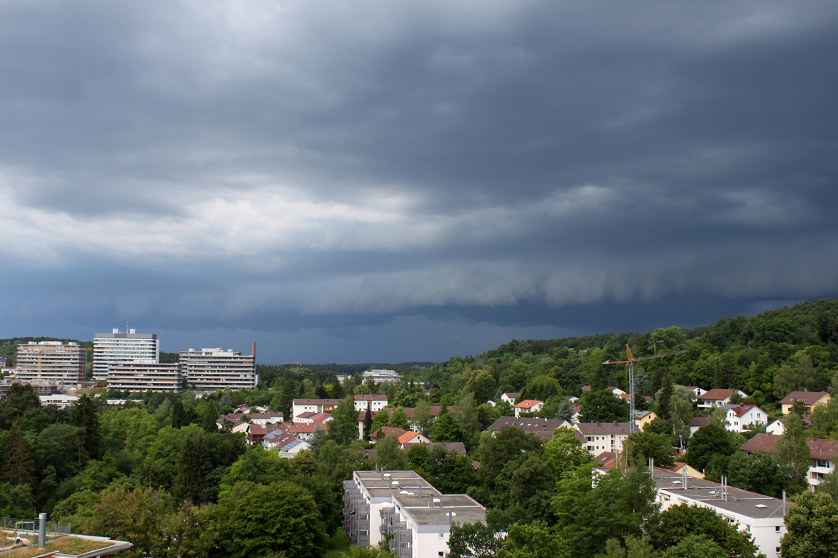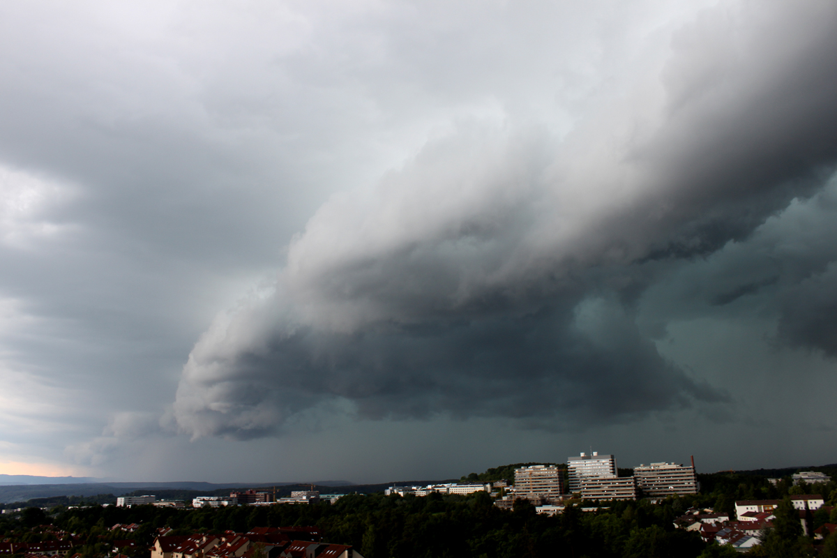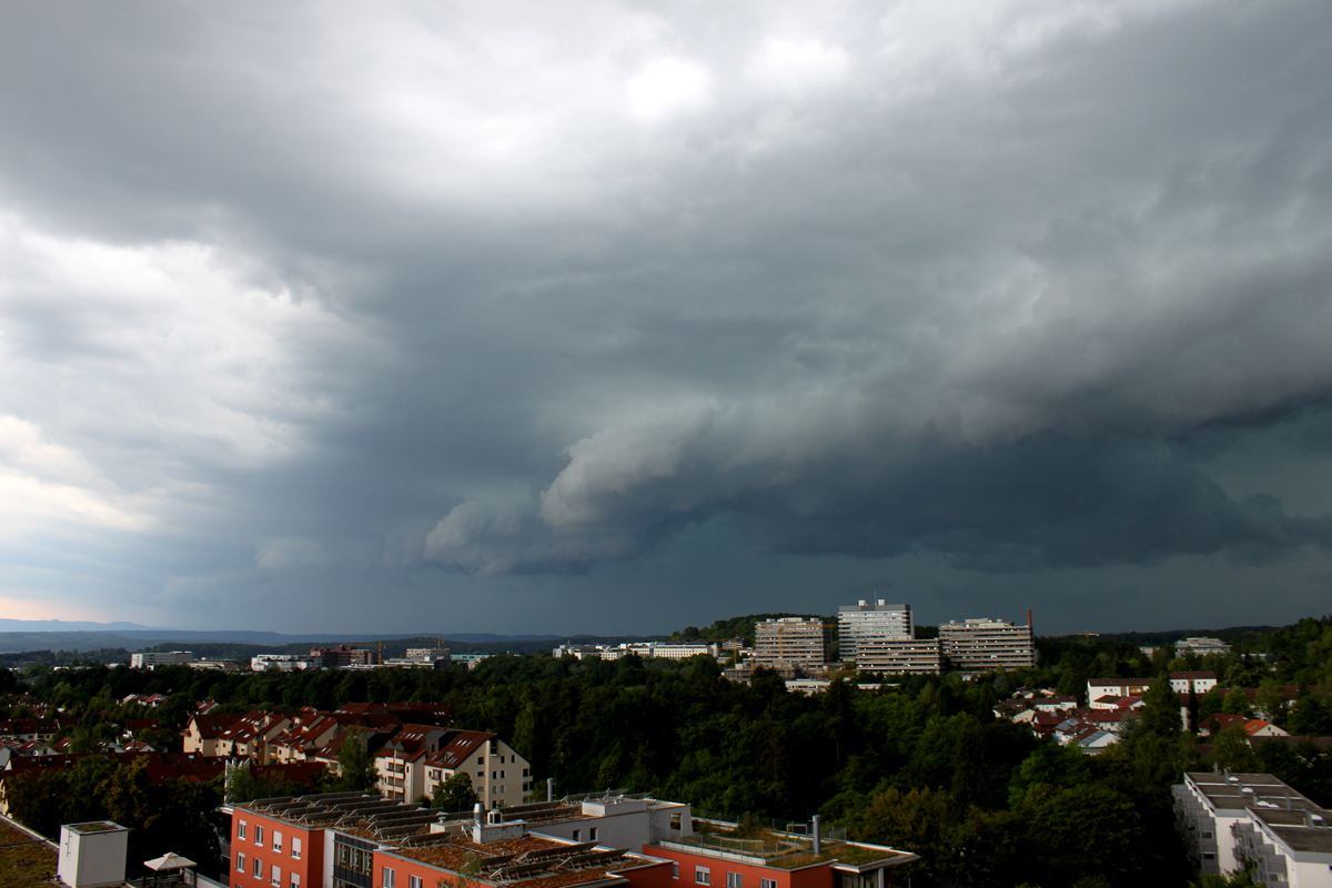 Es war soweit und endlich hat es mal geklappt! Schon als die Linie noch in Frankreich war, sah es eig. nicht schlecht aus. Als es dann aber präfrontal im Rheingraben ausgelöste und das Ganze noch über den Schwarzwald zu mir musste, war ich erneut eher pessimistisch. Gottseidank diesmal zu unrecht! Die Linie brach zwar auf, es bildeten sich aber kräftige, isoliertere Zellen welche auch die Schwarzwaldüberquerung gut überlebten. Eine dieser Zellen hielt auf meine Region zu. Anfangs konnte ich einen leichten S-drift auf dem Radar erkennen woraufhin ich mir überlegte ins Auto zu sitzen und weiter nach S zu fahren. Allerdings steuerte sie dann doch eher voll auf mich zu. Es formierte sich sogar eine - wieder total geschlossene - Linie auf der Leeseite des Schwarzwalds. Von da an war ich permanent auf dem Dach um die heranrollende Linie beobachten zu können. Bereits relativ früh zeigte sich, dass es vllt gröber kommen könnte und man sah bereits Strukturen einer shelf cloud: