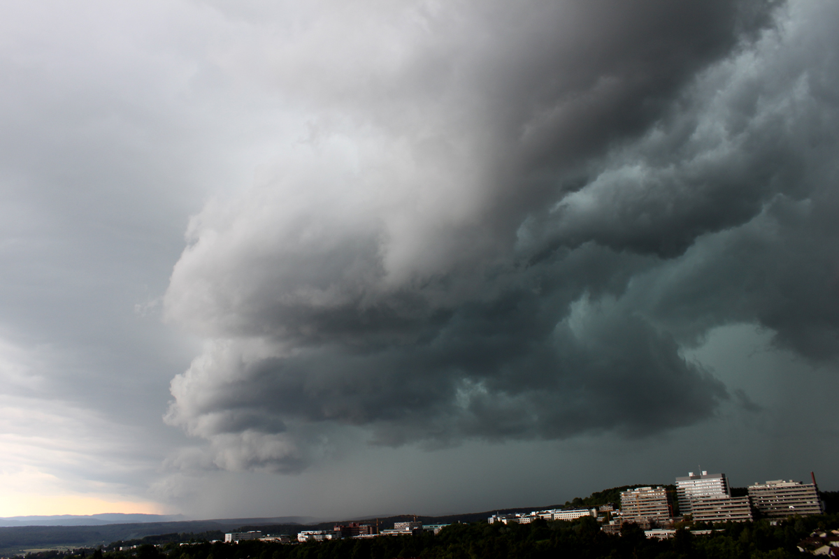 Das Unwetter wird bis in die Nacht hinein andauern. Morgen Donnerstag werden die Reste der Kaltfront noch über den zentralen und östlichen Alpen verweilen. Die Kaltfront, ist die Folge eines Tiefdruckgebiets über dem Nordatlantik. Sie trifft auf die warme Luft in der Schweiz.