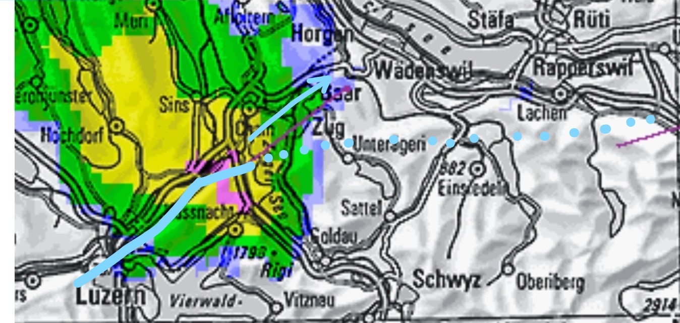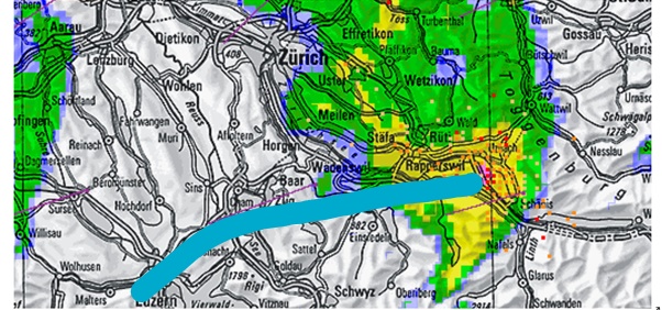 Es war bereits nach 16.00 Uhr am Samstag, 24.07.2021 als ich mich an meinem gewohnten Spotterplatz am Waldrand oberhalb des Bahnhof Urdorf Weihermatt einfand. Damit hatte ich die ersten beiden Durchgänge, die von hier aus sichtbar waren, bereits verpasst. Die folgenden Zellen auf der von Willi mal so genannten "Voralpen-Kegelbahn" ergaben von hier aus keine brauchbaren Bilder – es war einfach nur dunkel in Blickrichtung S/SW.