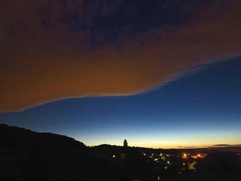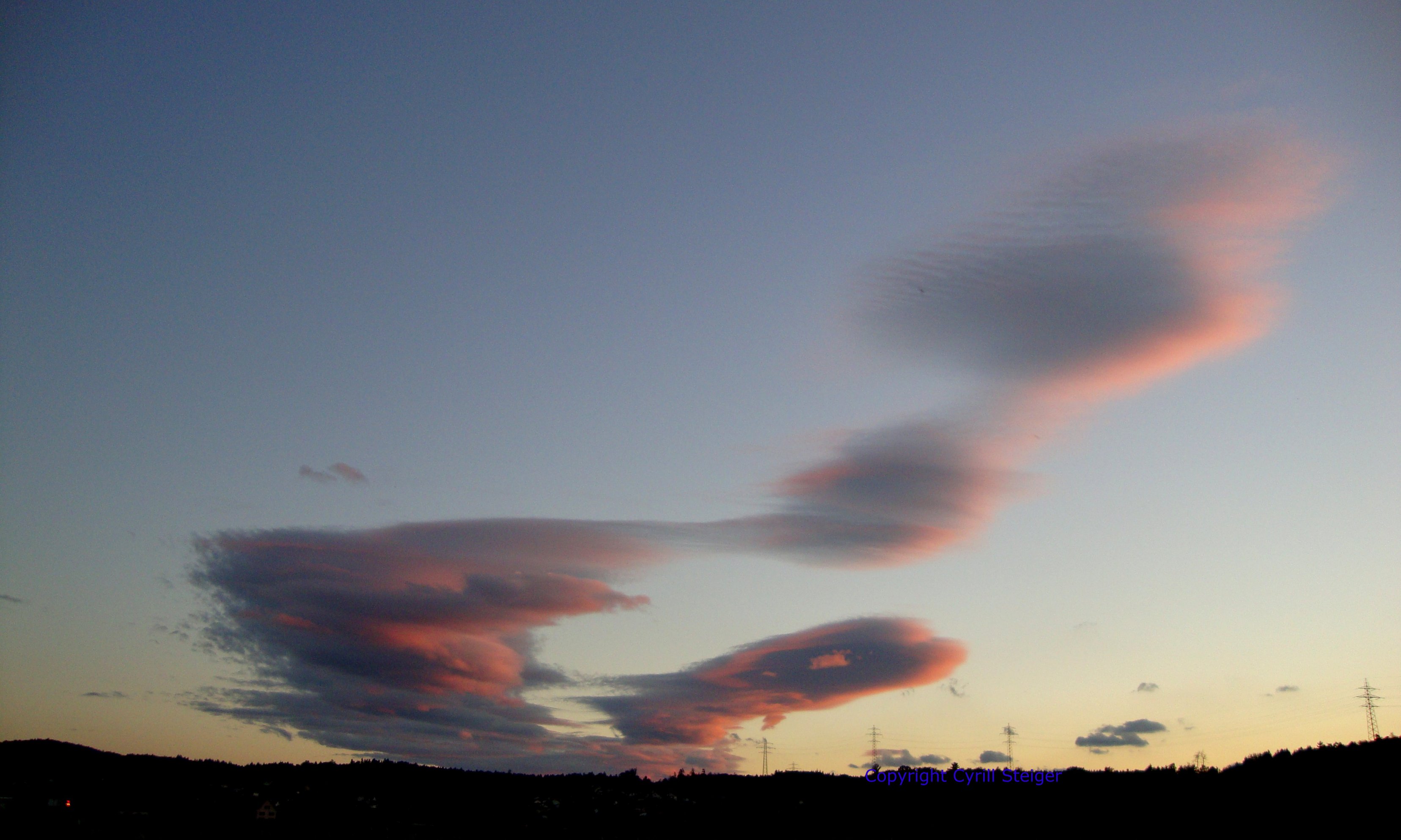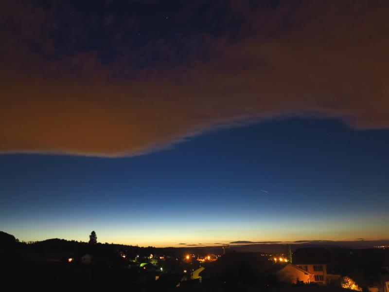 Hier noch zwei Bilder von heute Abend in Hallwil. Intensive Dämmerungsfarben und vom Stadtlicht beschienene Linsenwolken (im Bild oben).