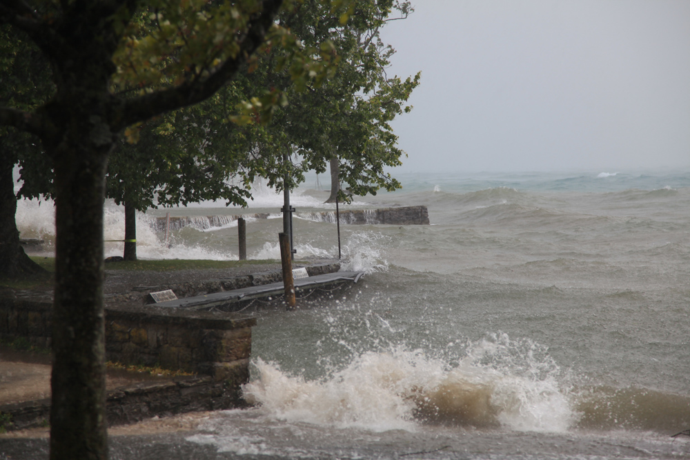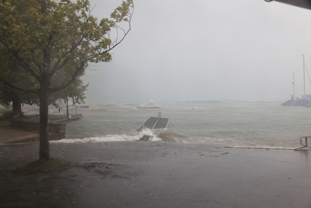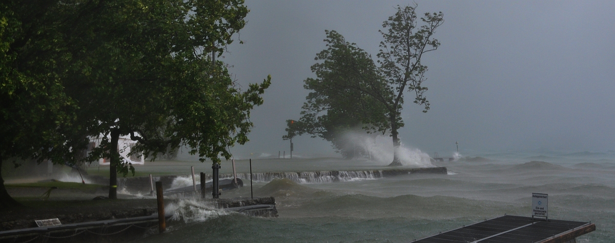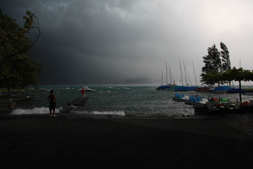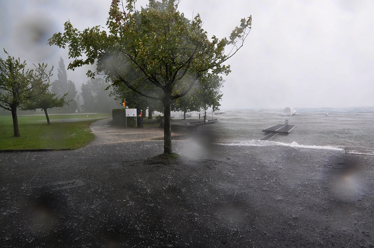 Zurück in Neuhaus ging es gleich los: Kräftige Windböen (es wurde von 90km/h berichtet), meerartiger Wellengang und Starkniederschlag. Philippe, Melanie und ich kauerten unter einem Vordach, während Säschu das Spektakel im Auto genoss. Ich muss noch mal sagen, es war einfach genial! Nach etwa 5-10 Minuten setzte auch noch kleinkörniger Hagel ein (ca. 0.5 - 1 cm).