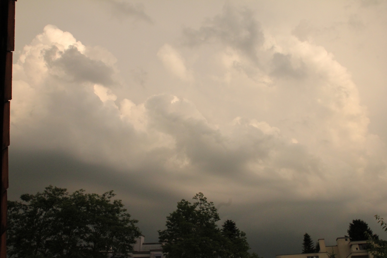 Ja, nun knackige Quellungen Richtung Süden von hier aus gesehen und schöne Castellanus / Cu con im Norden. Ev. triggert der Outflow der zerfallenden Voralpenzellen mit dem Nordwind noch was. Heute scheinen die Zugbahnen ohnehin stark outflowgetrieben zu sein.