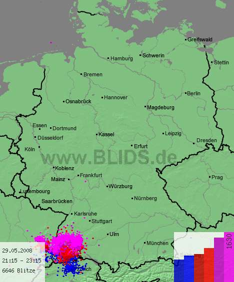 Ich hatte heute abend diesen blöden Termin. Hätte sonst die Zelle wie angekündigt im Raum Eglisau/Schaffhausen abgefangen. So musste ich ihr hinterherhetzen. Die BLIDS-Daten hatten mich auch etwas irritiert, denn die ununterbrochene hohe Blitzrate war weiter nordwestlich. Nun bei Eglisau in Blickrichtung Schwarzwald, im Trockenen