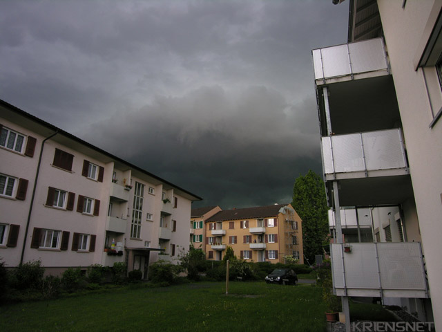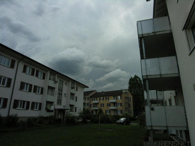 Kaum eine Viertelstunde, nachdem die Region vom Outflow erfasst wurde, wehte ein böiger, zuweilen stürmischer Nordwind. Ich fuhr von Dübendorf nach Fällanden und weiter Richtung Maur, um möglichst in den Kern des Gewitters zu gelangen.