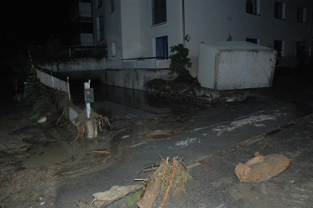 Langsam liess die Kraft nach und aus der angrenzenden Strasse wurde ein Bach (allerdings harmlos). Und schliesslich bemerkten wir noch, dass aus Schlitzen des direkt vor meinem Auto stehenden Mauerwerks immer mehr Wasser herausspritzte. Da wurde es langsam Zeit, den Ort zu verlassen..