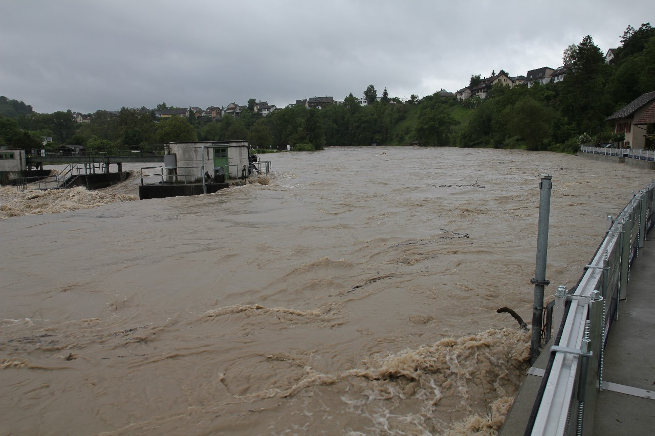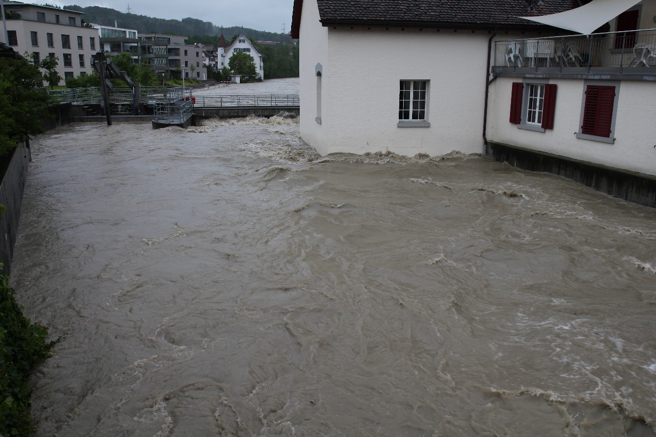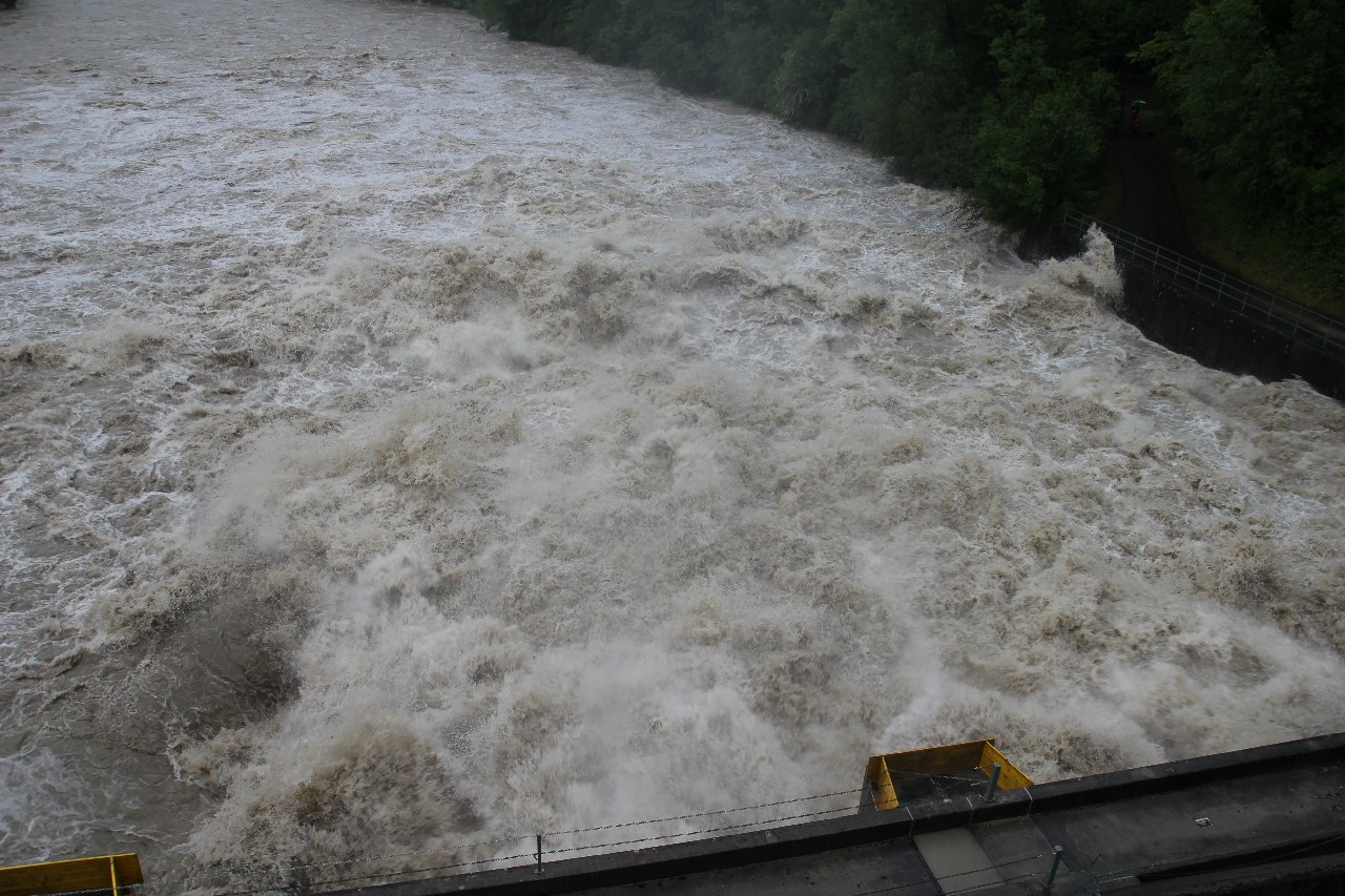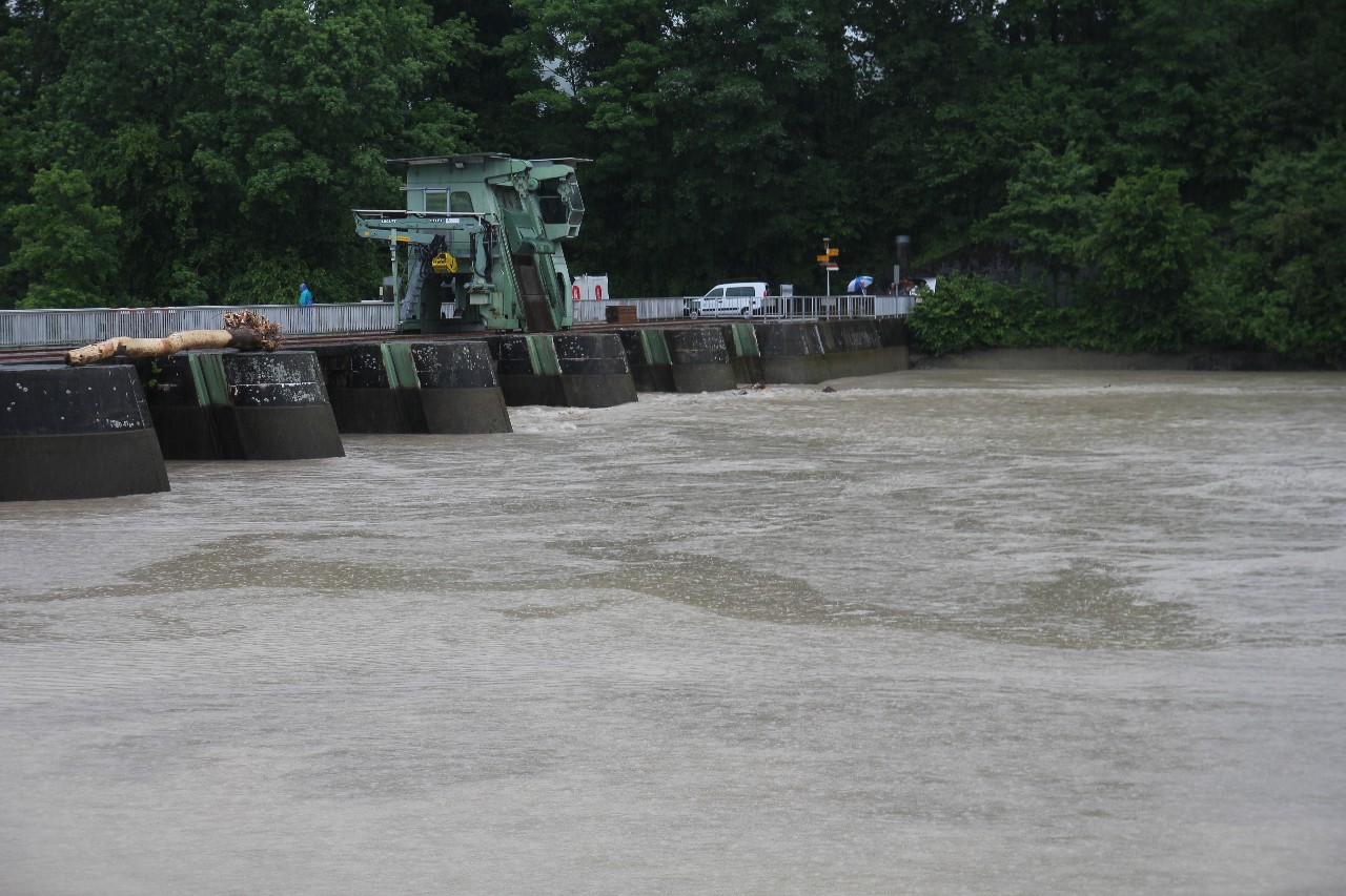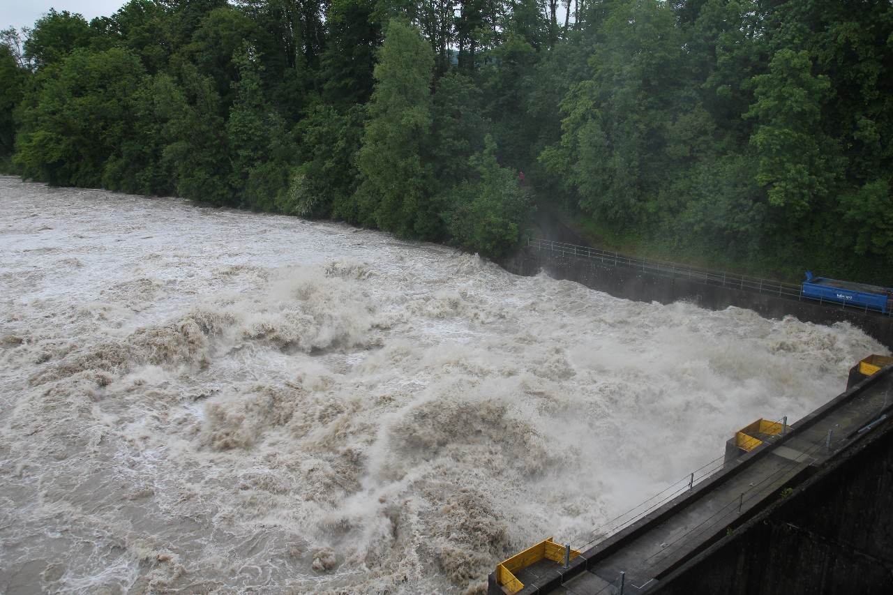 7/7: Reuss-Wehr bei Bremgarten um den Zeitpunkt des Höchststandes (17:00-18:30 Uhr) (Das kräftige Rauschen des Wassers hat eine sehr grosse Ähnlichkeit mit einem Tornado!)