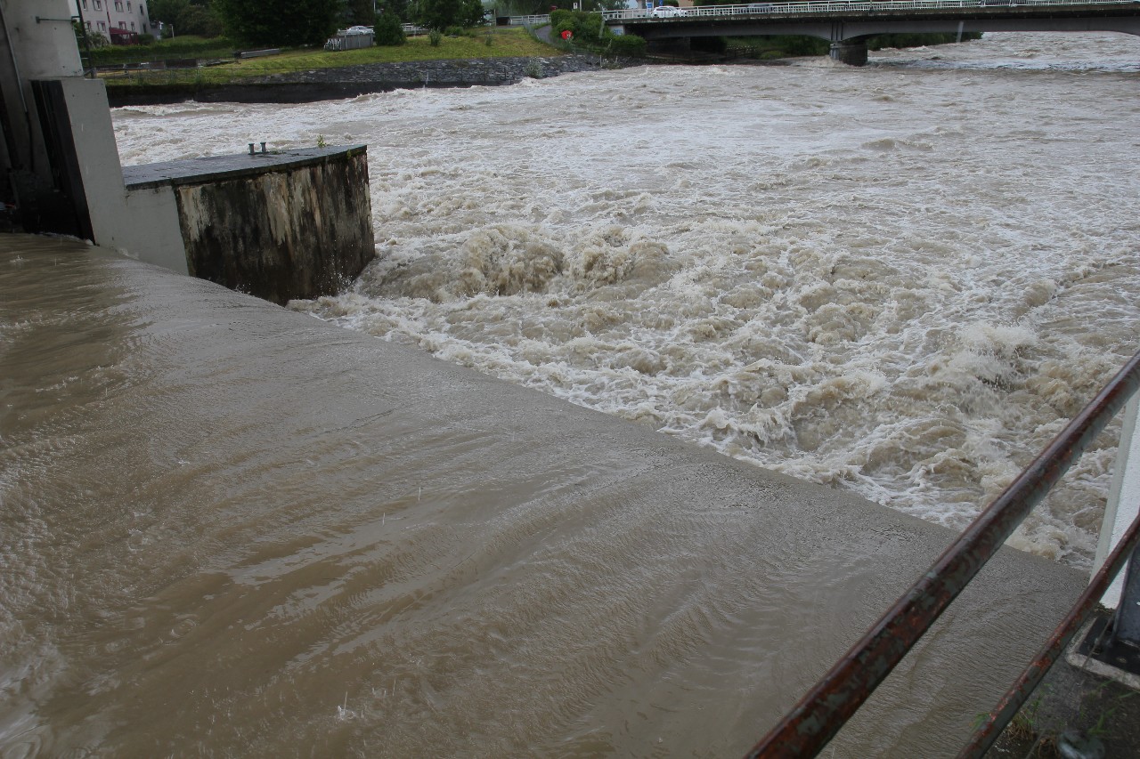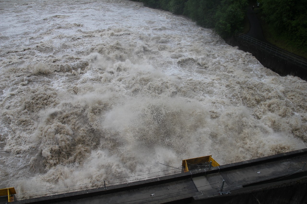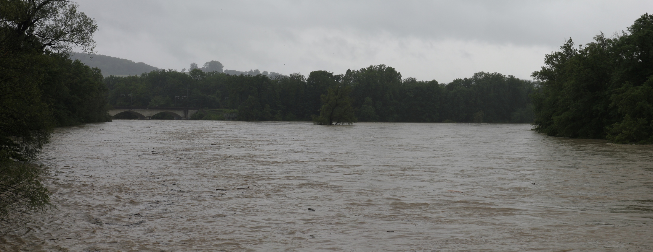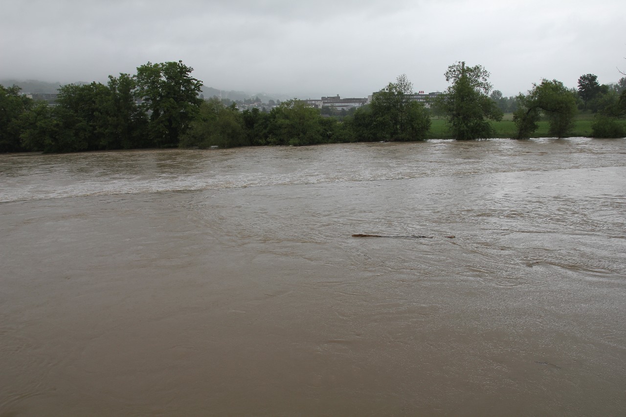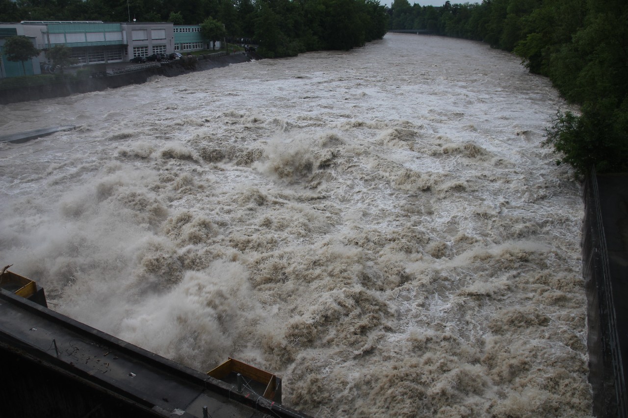 7/7: Reuss-Wehr bei Bremgarten um den Zeitpunkt des Höchststandes (17:00-18:30 Uhr) (Das kräftige Rauschen des Wassers hat eine sehr grosse Ähnlichkeit mit einem Tornado!)