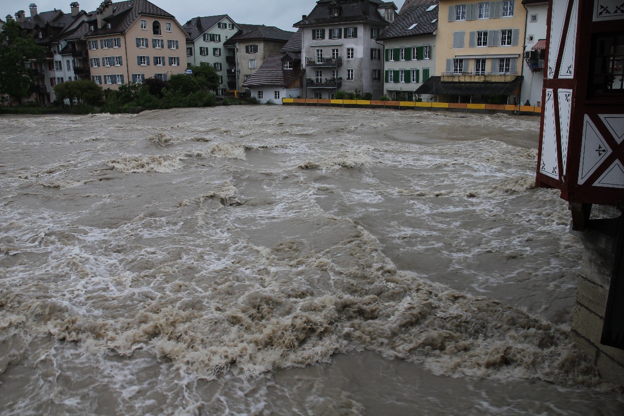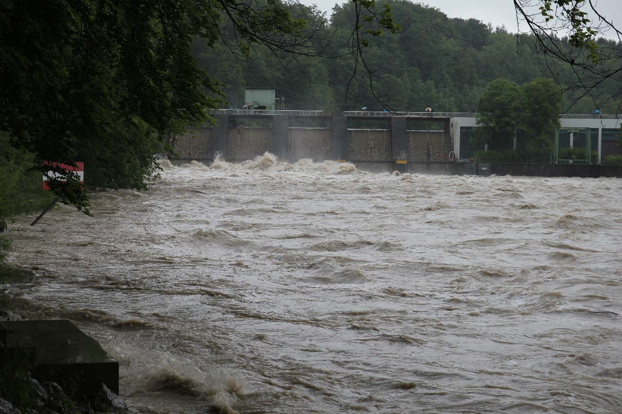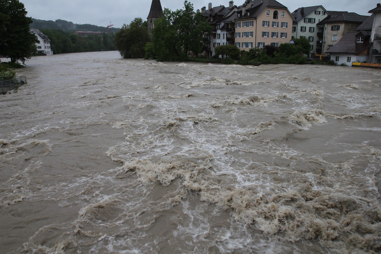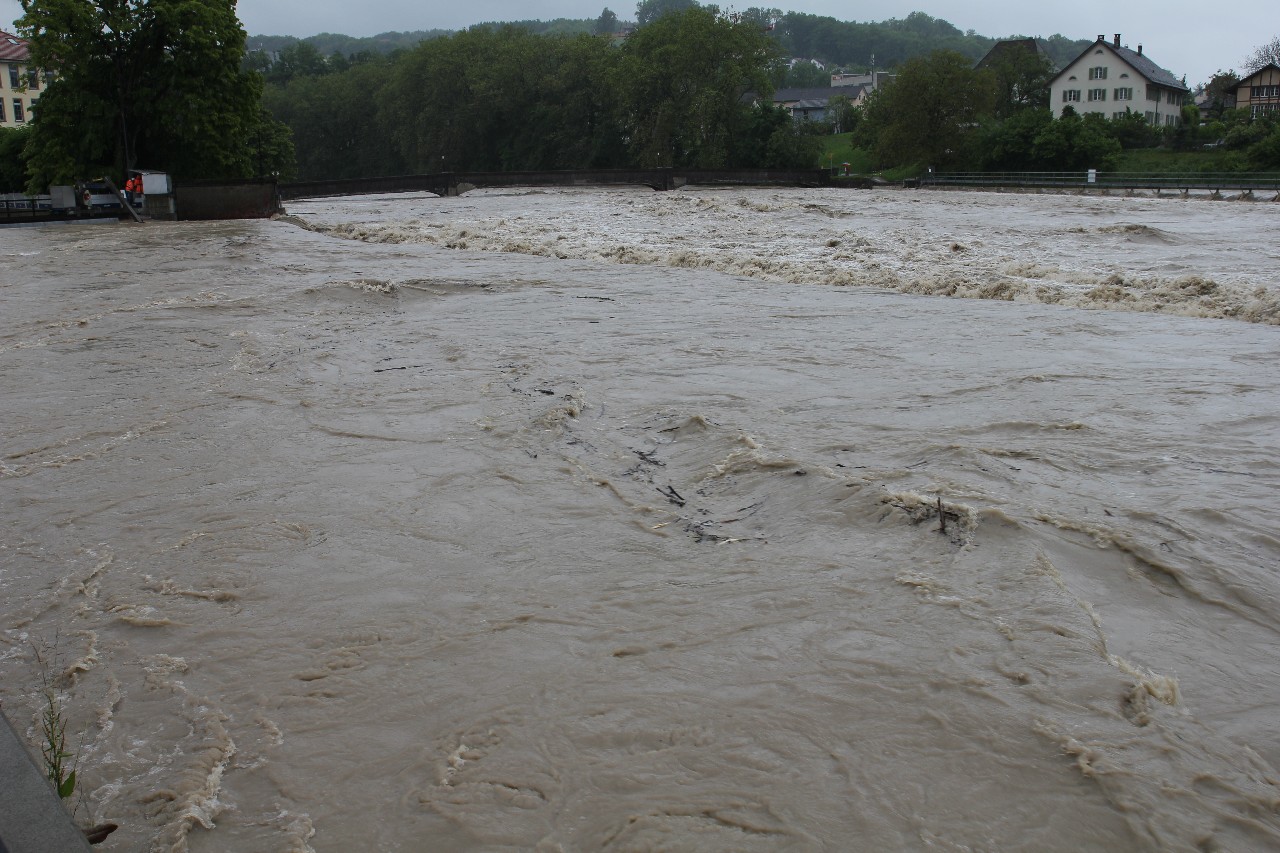 7/7: Reuss-Wehr bei Bremgarten um den Zeitpunkt des Höchststandes (17:00-18:30 Uhr) (Das kräftige Rauschen des Wassers hat eine sehr grosse Ähnlichkeit mit einem Tornado!)