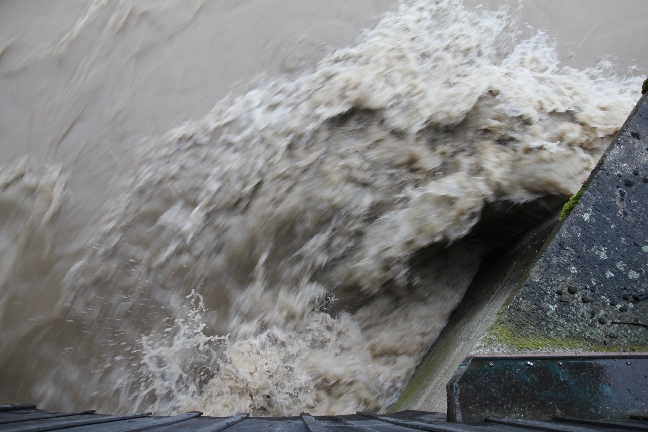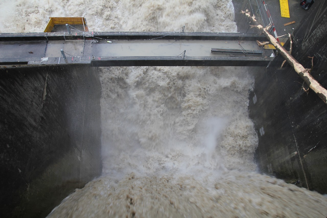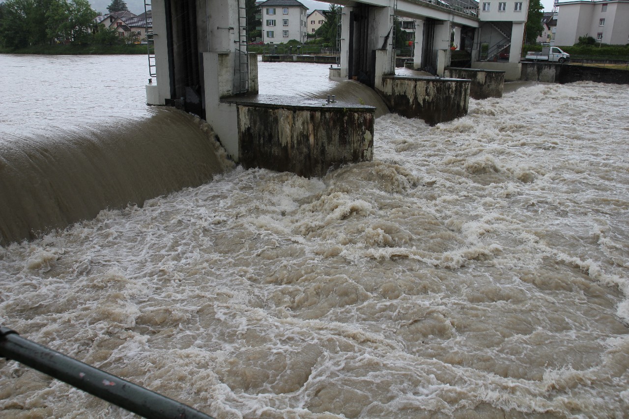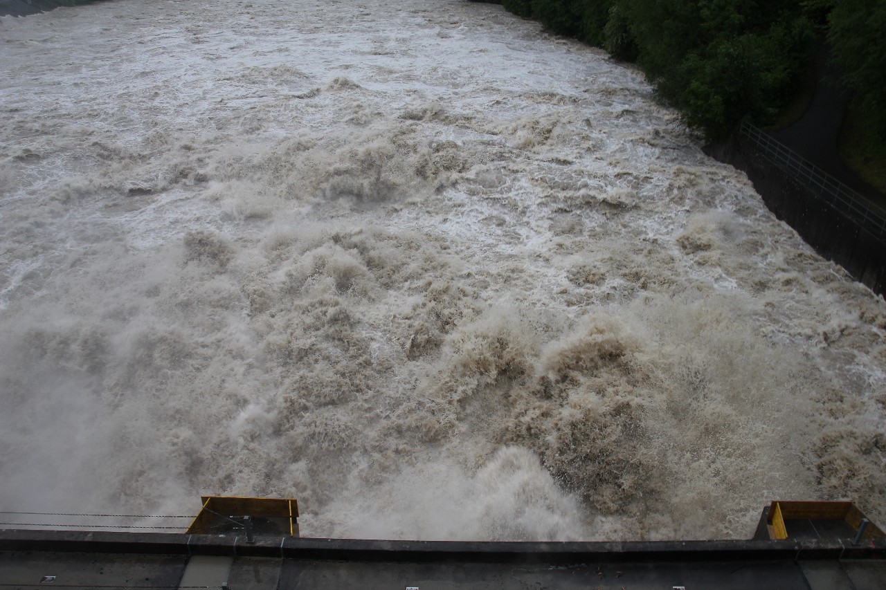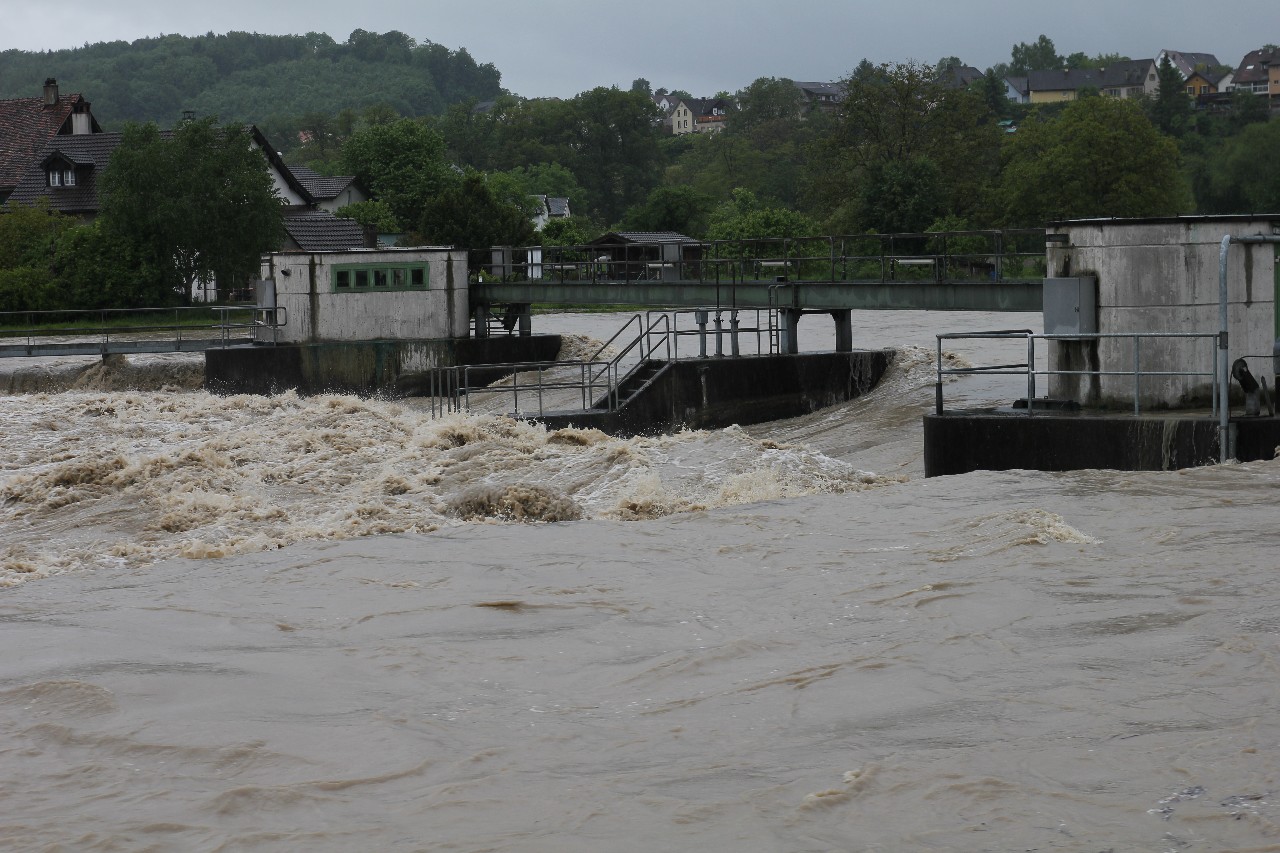 7/7: Reuss-Wehr bei Bremgarten um den Zeitpunkt des Höchststandes (17:00-18:30 Uhr) (Das kräftige Rauschen des Wassers hat eine sehr grosse Ähnlichkeit mit einem Tornado!)