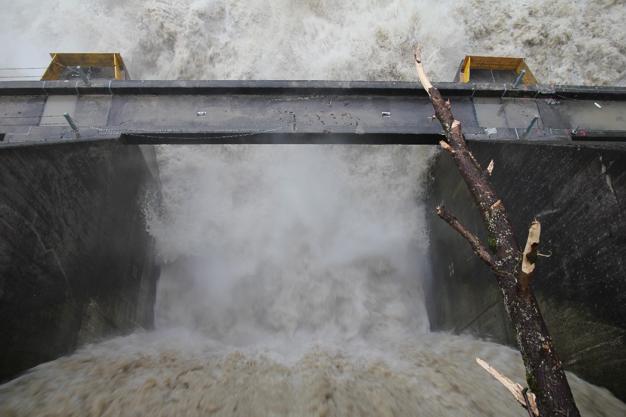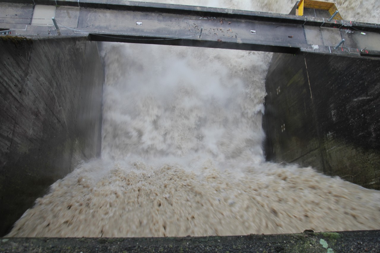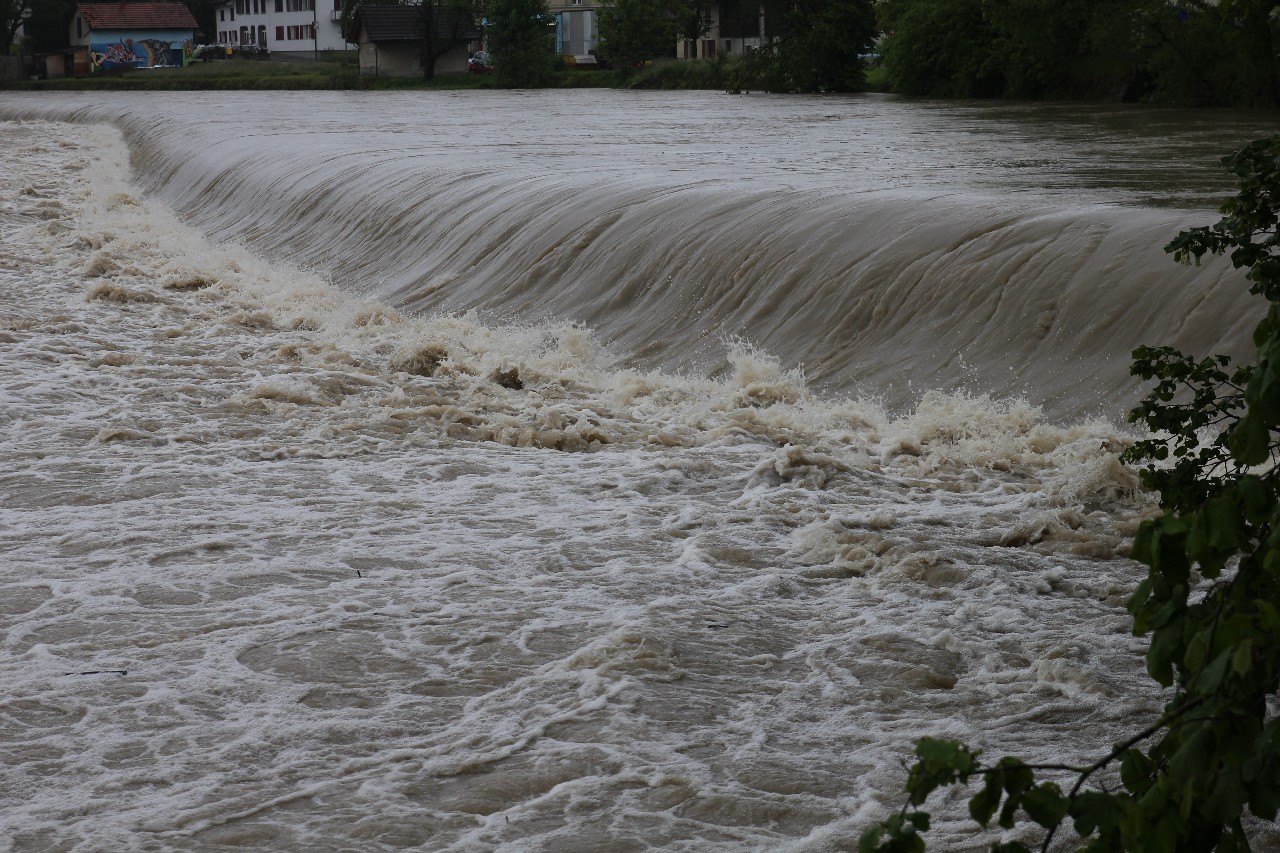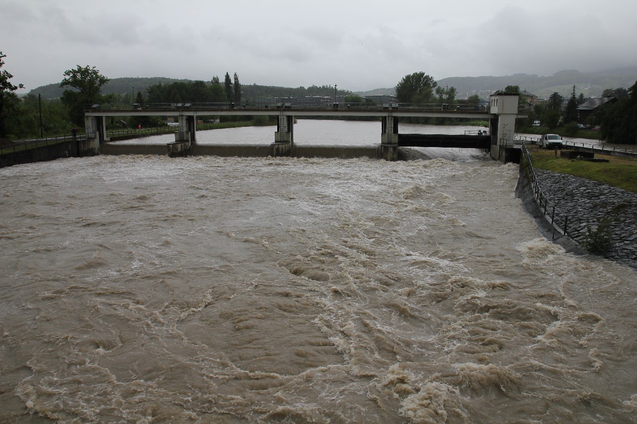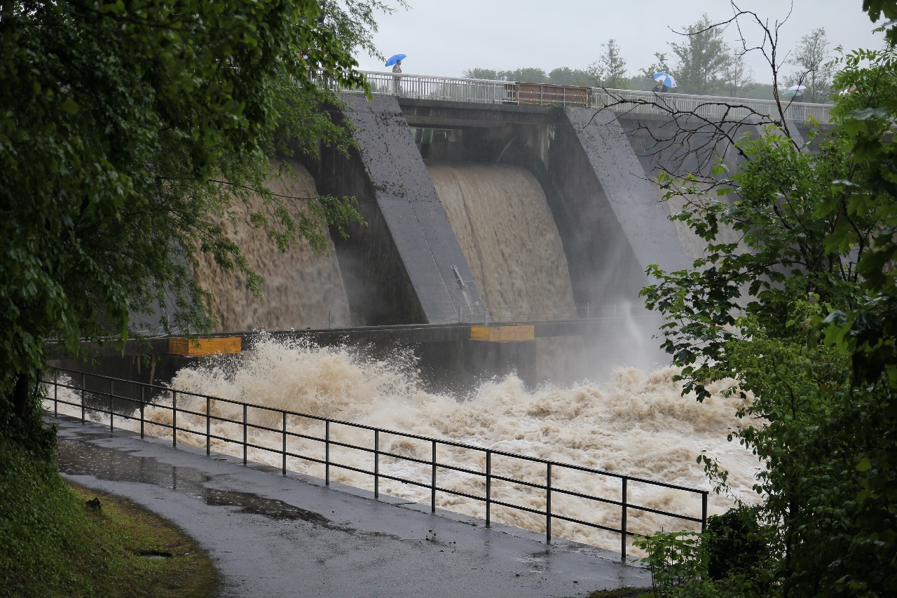 7/7: Reuss-Wehr bei Bremgarten um den Zeitpunkt des Höchststandes (17:00-18:30 Uhr) (Das kräftige Rauschen des Wassers hat eine sehr grosse Ähnlichkeit mit einem Tornado!)