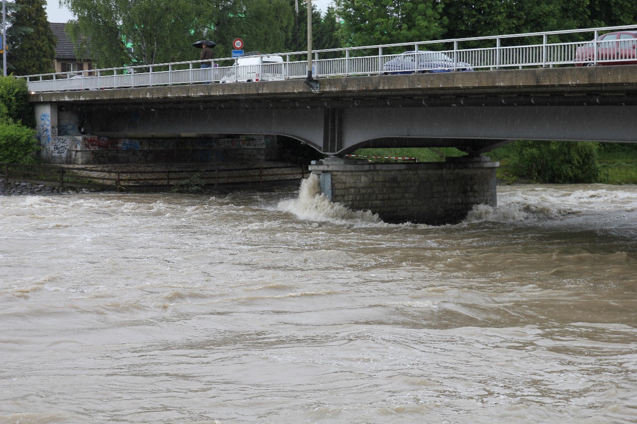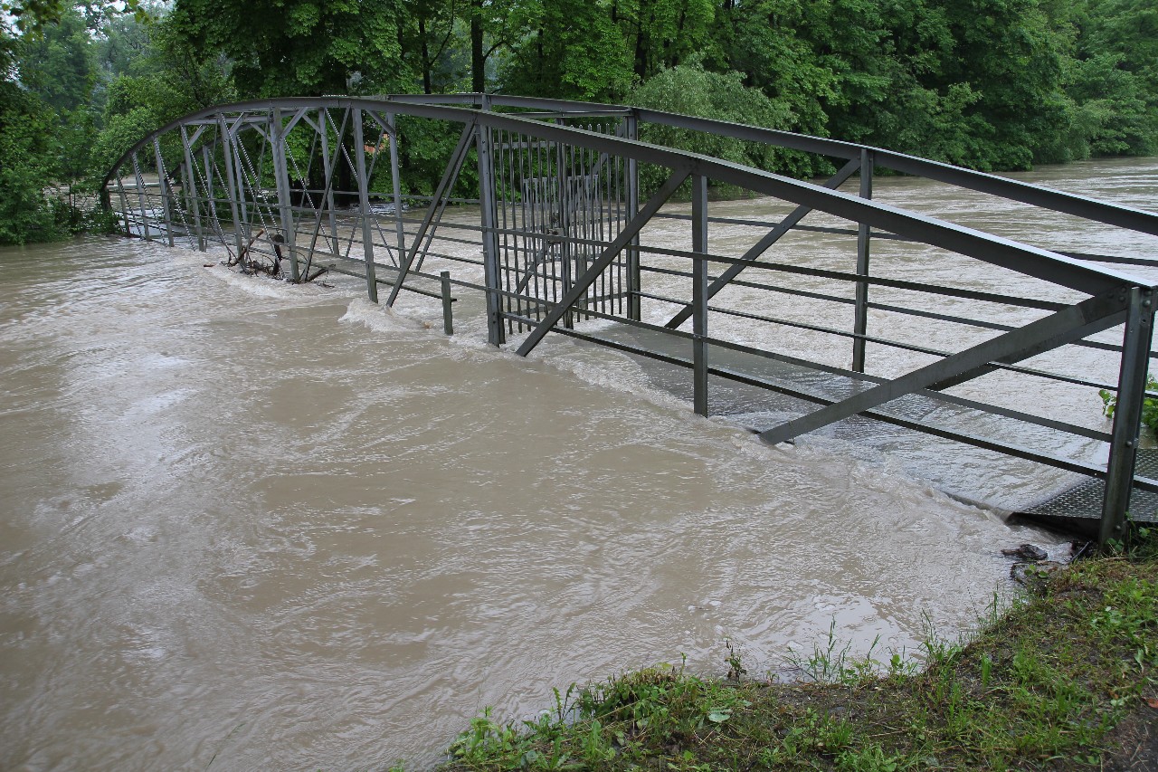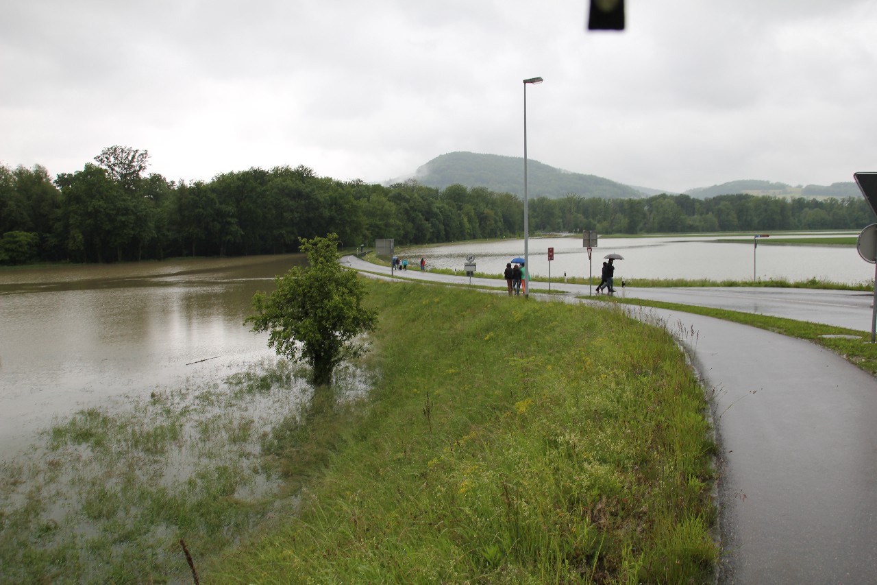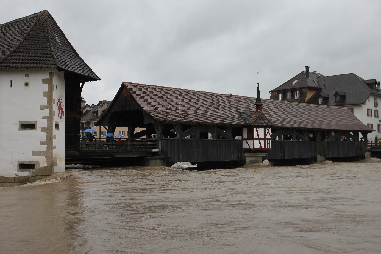 4/7: Die wegen dem Hochwasser für den Verkehr gesperrte Vogelsangbrücke. Zum Glück hatte ich die alten Militärstiefel angezogen und kann so trockenen Fusses durch das über die Strasse fliessende Wasser.