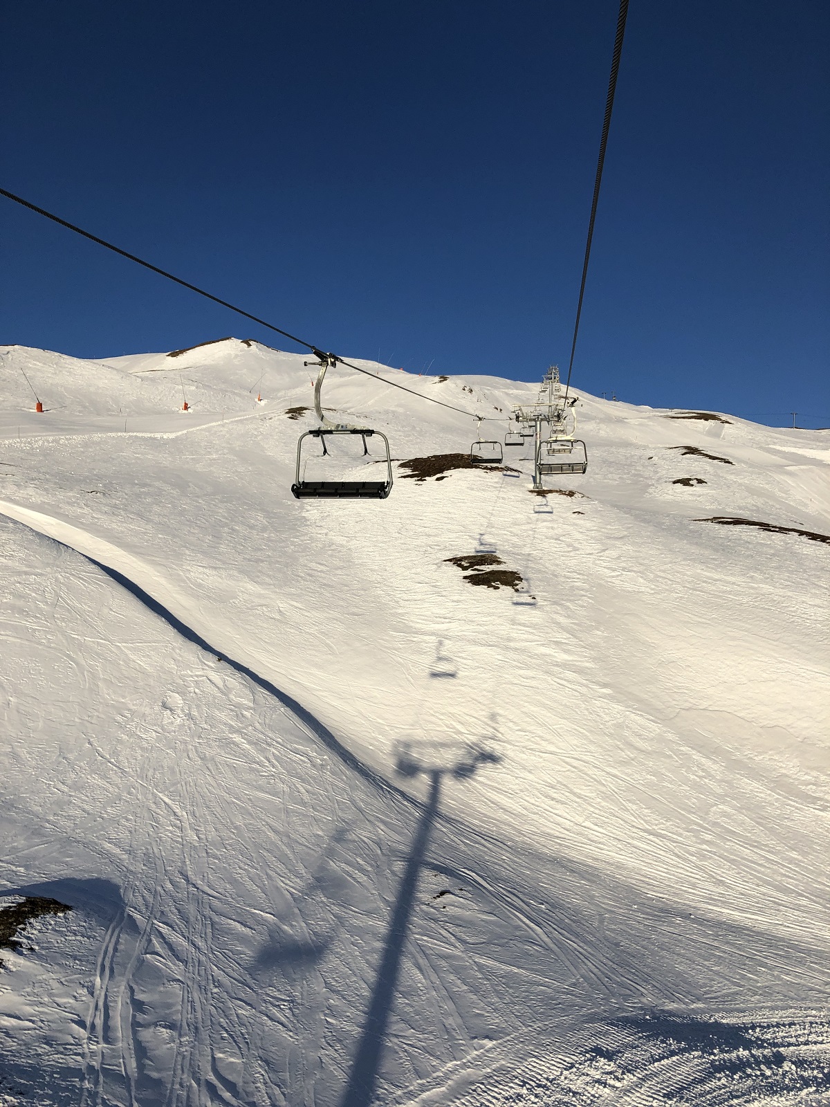 ...und später dann mehrheitlich strahlendes Blau. Und unten auch weiterhin ein markantes Braun am Südhang, durch das sich die die Kunstschnee-Talabfahrt schlängelt.