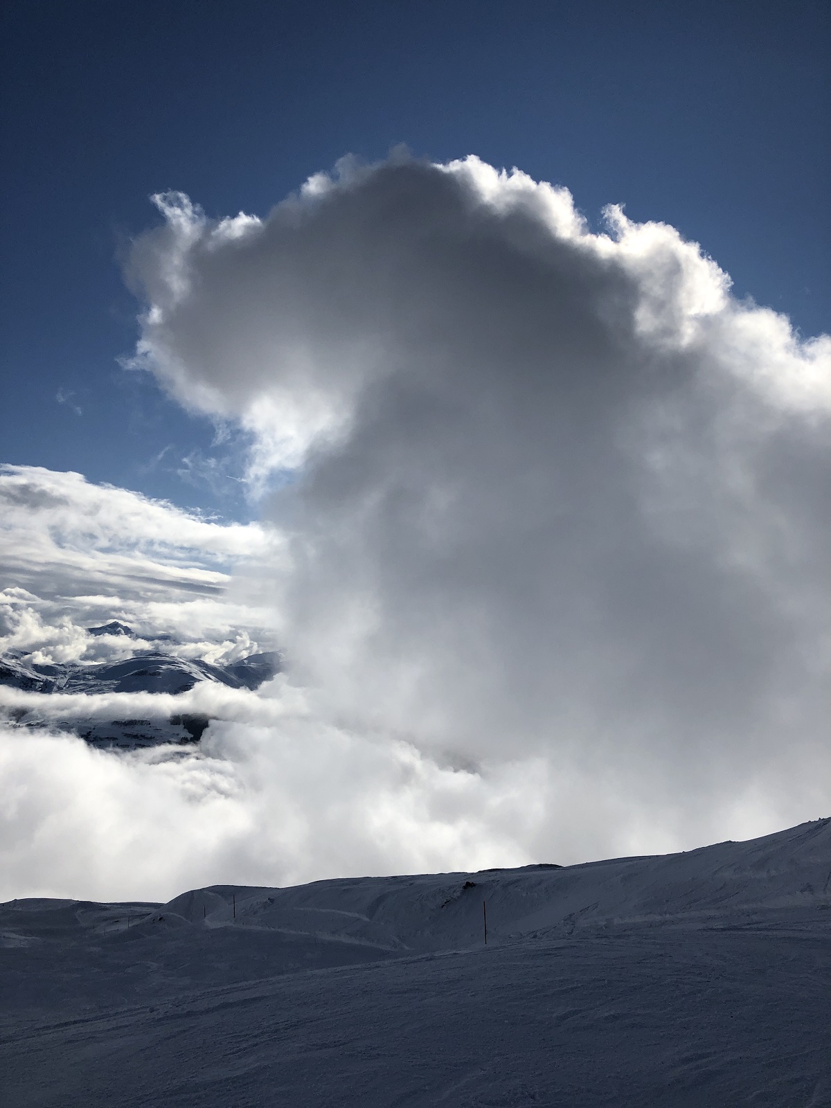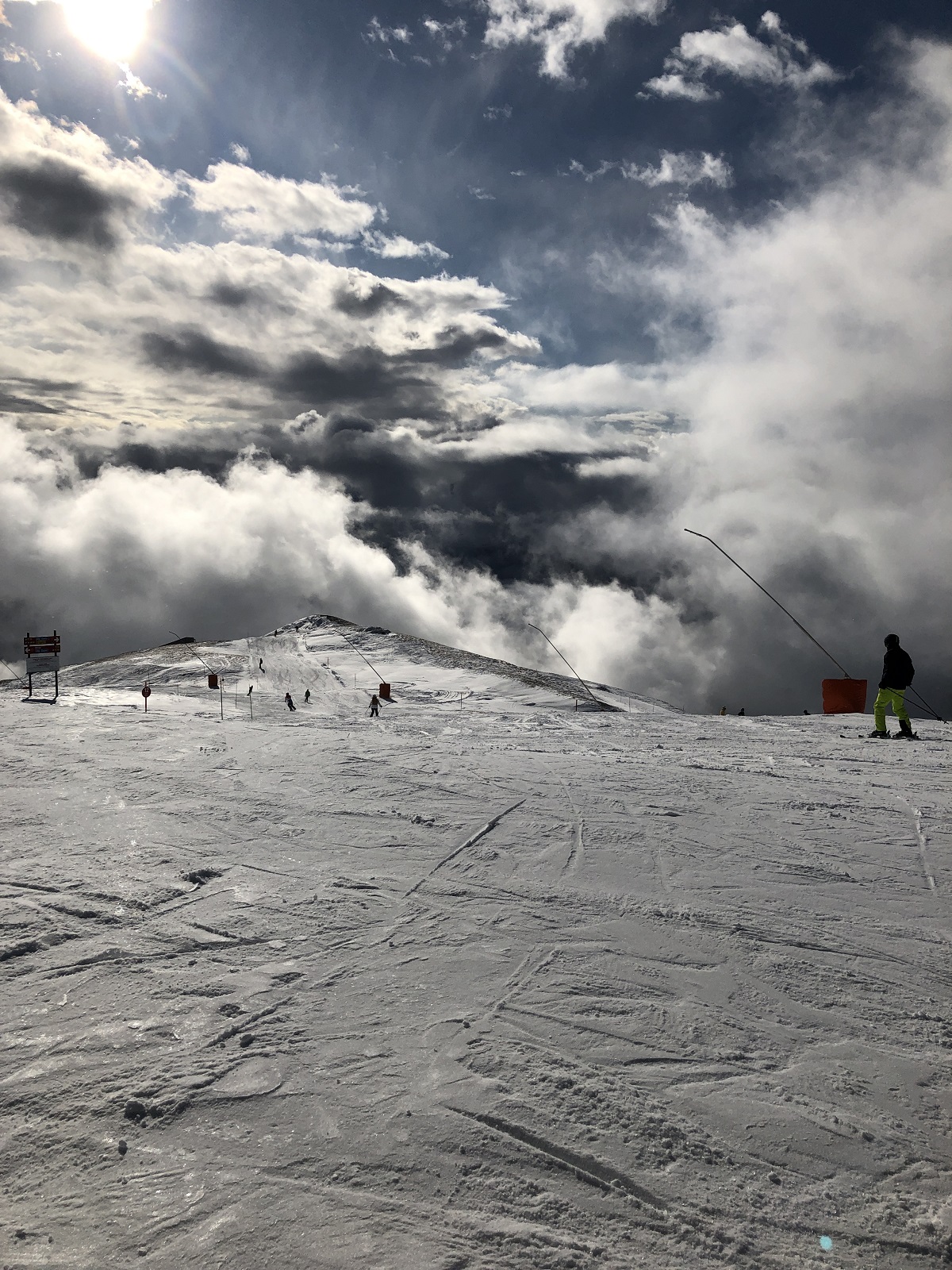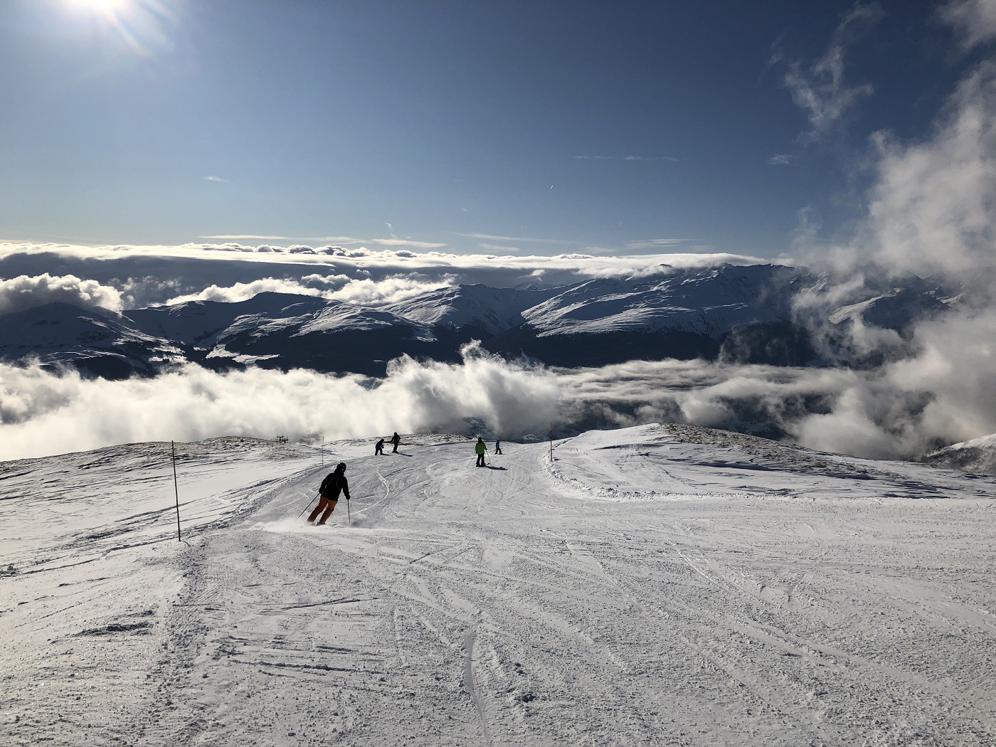 Der Sonntag war dann zu Beginn im Skigebiet völlig klar, wobei rundherum viele Wolken zu sehen waren. Im Verlaufe des Tages zogen dann in gewissen Höhen Wolken auch ins Skigebiet und es gab ein sehr kontrastreiches Panorama.