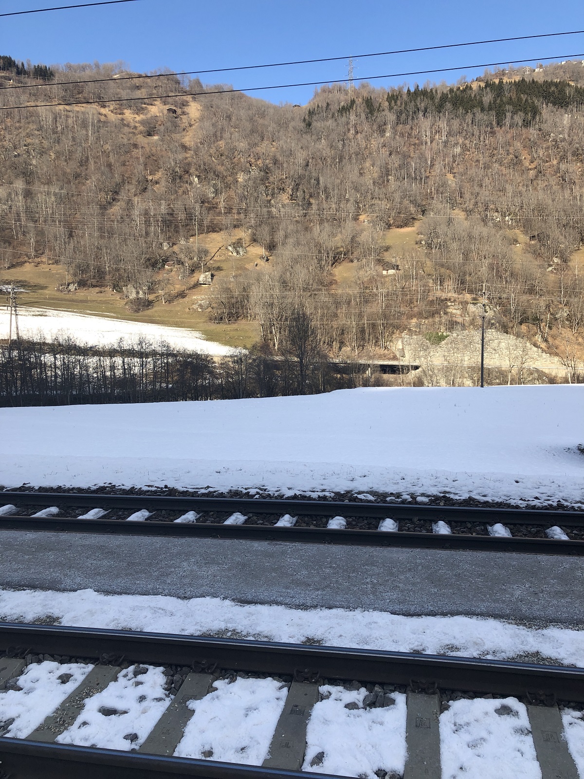 Auch ganz unten im Tal beim Bahnhof "Tavansa-Breil/Brigels" (ca. 790m) sieht man den Kontrast zwischen Südhang und (schattigem) Talgrund gut.
