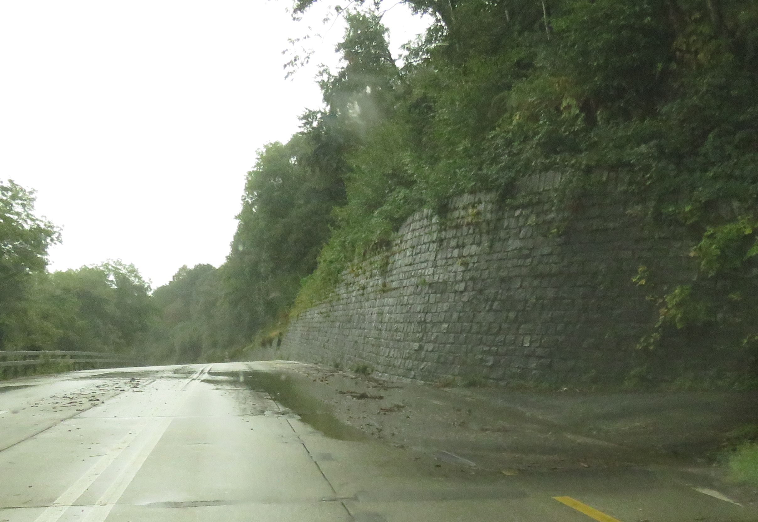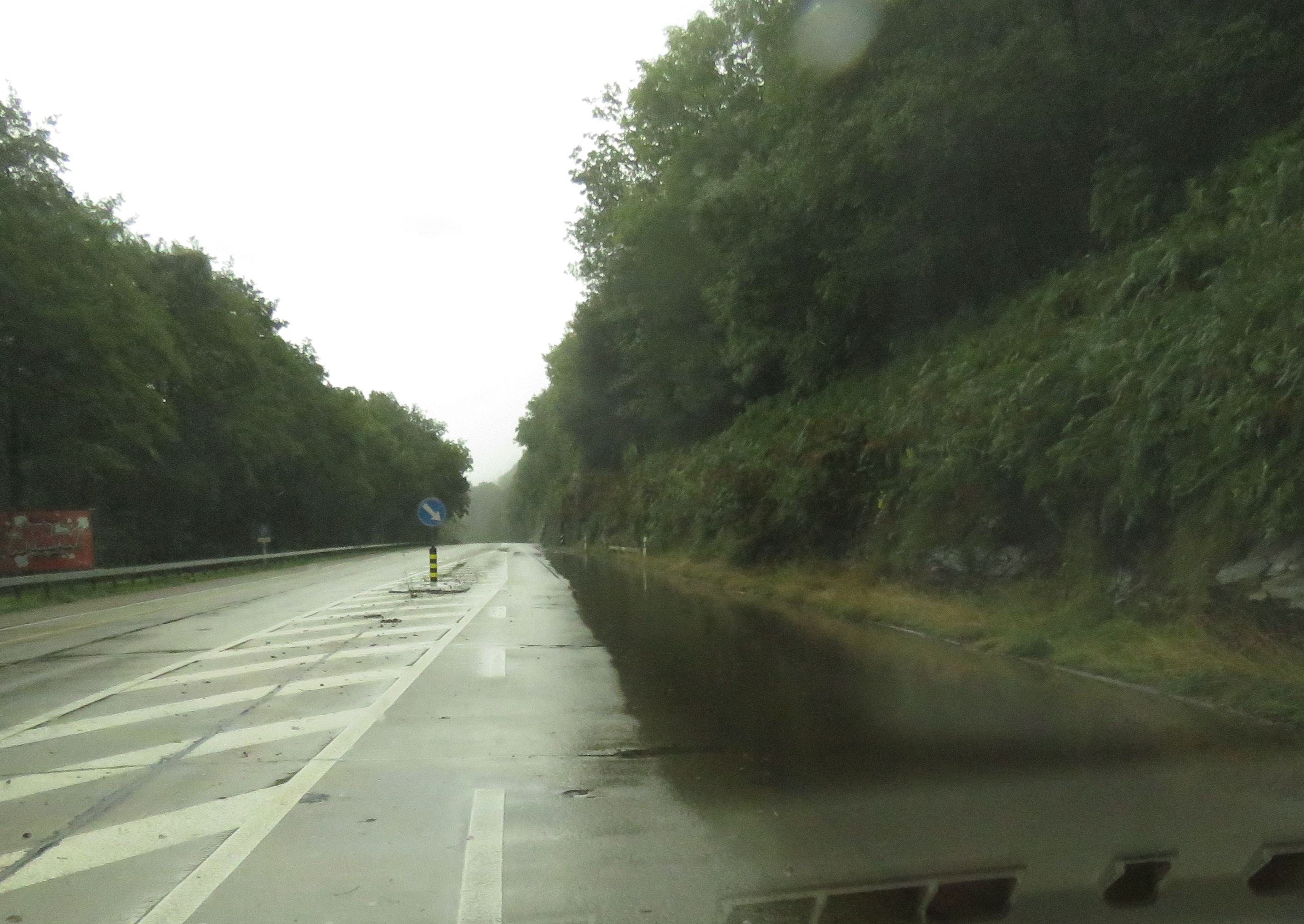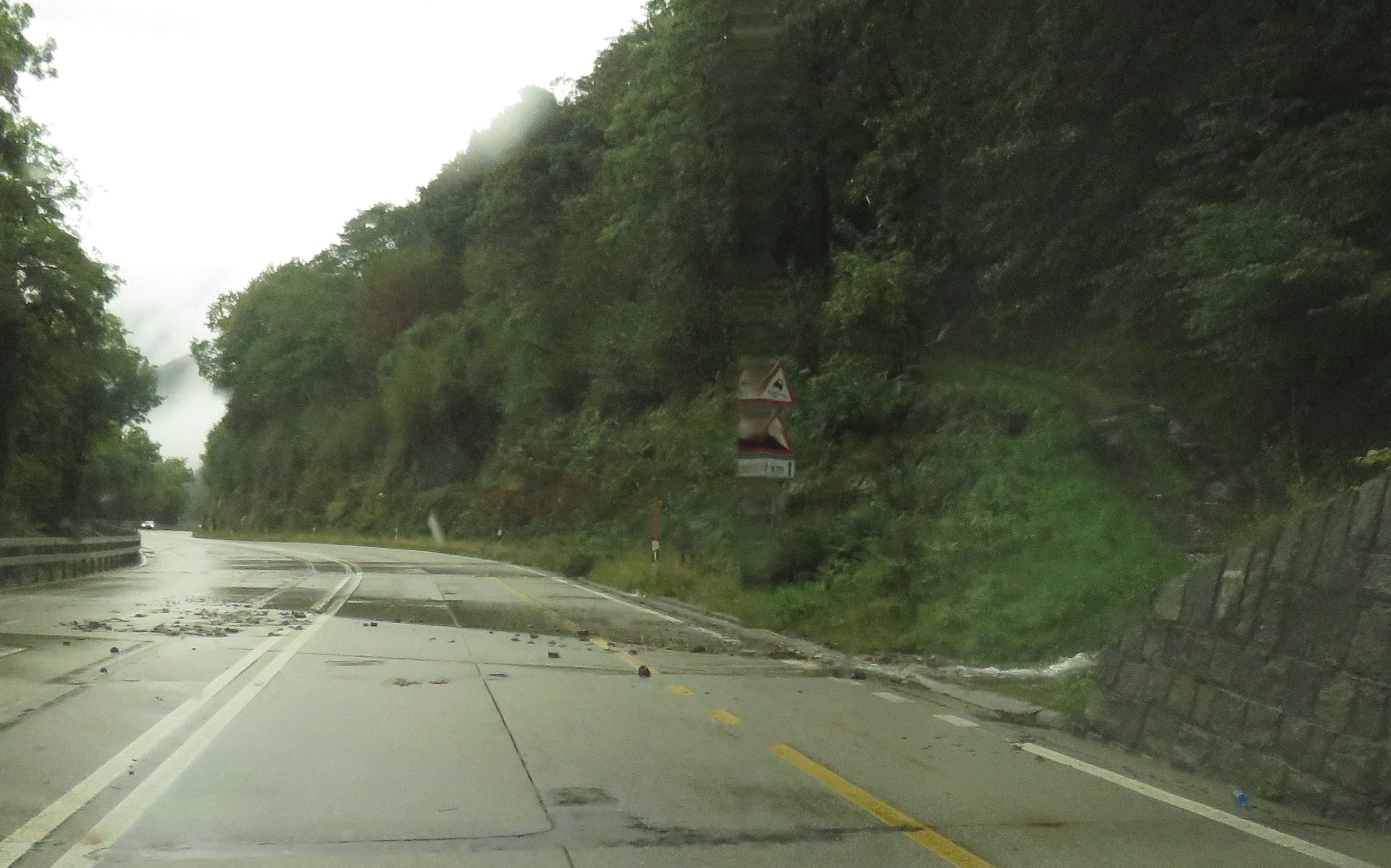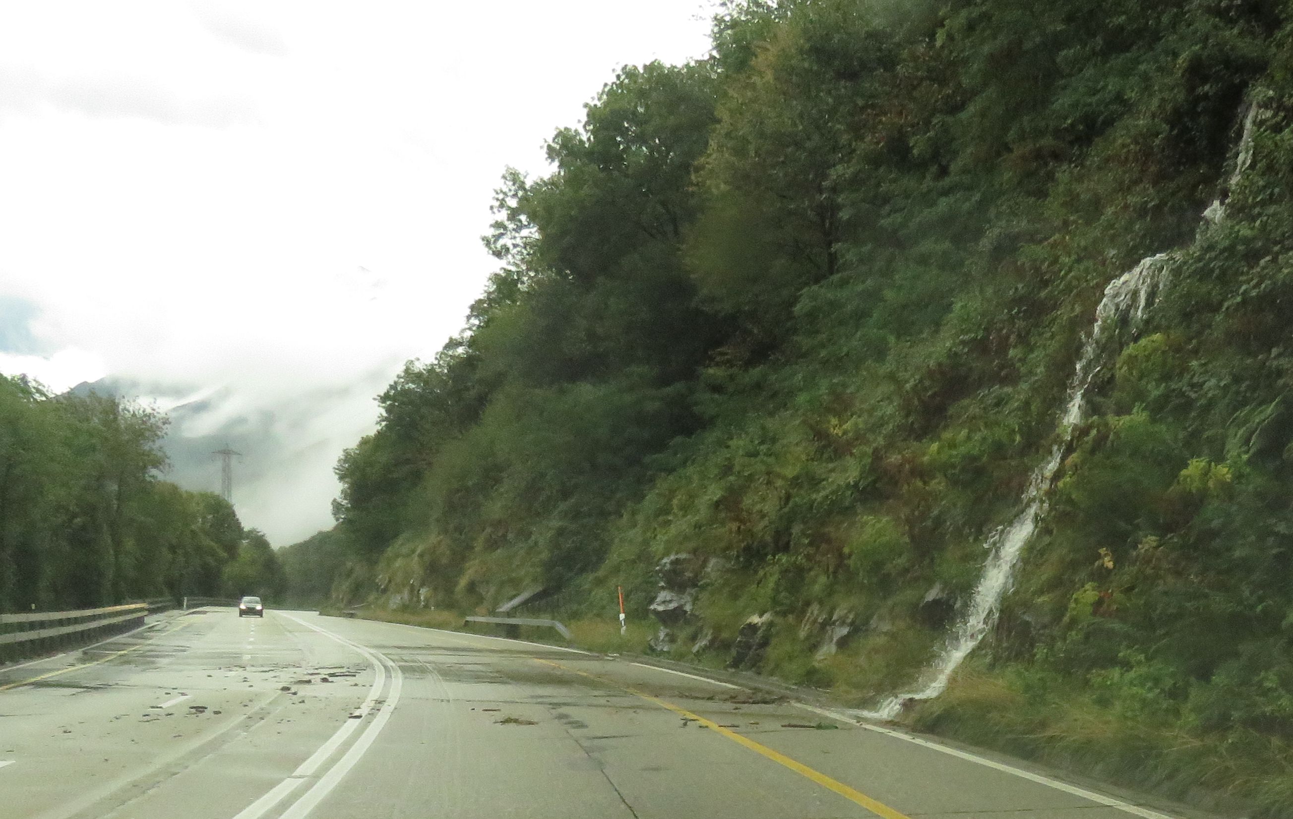 Danach gemäss Originalplan Verschiebung Richtung Centovalli. Auf der Fahrt konnte man einige Spuren des Gewitterregens erkennen, so zum Beispiel vereinzelt etwas Wasser und Geröll auf der Ceneri-Strasse: