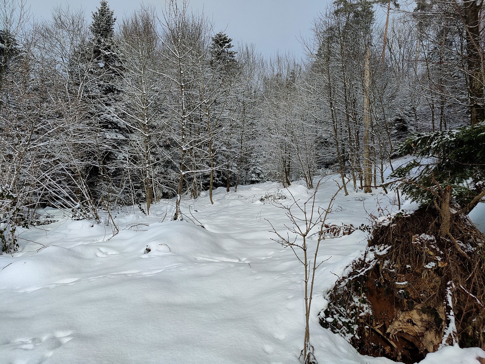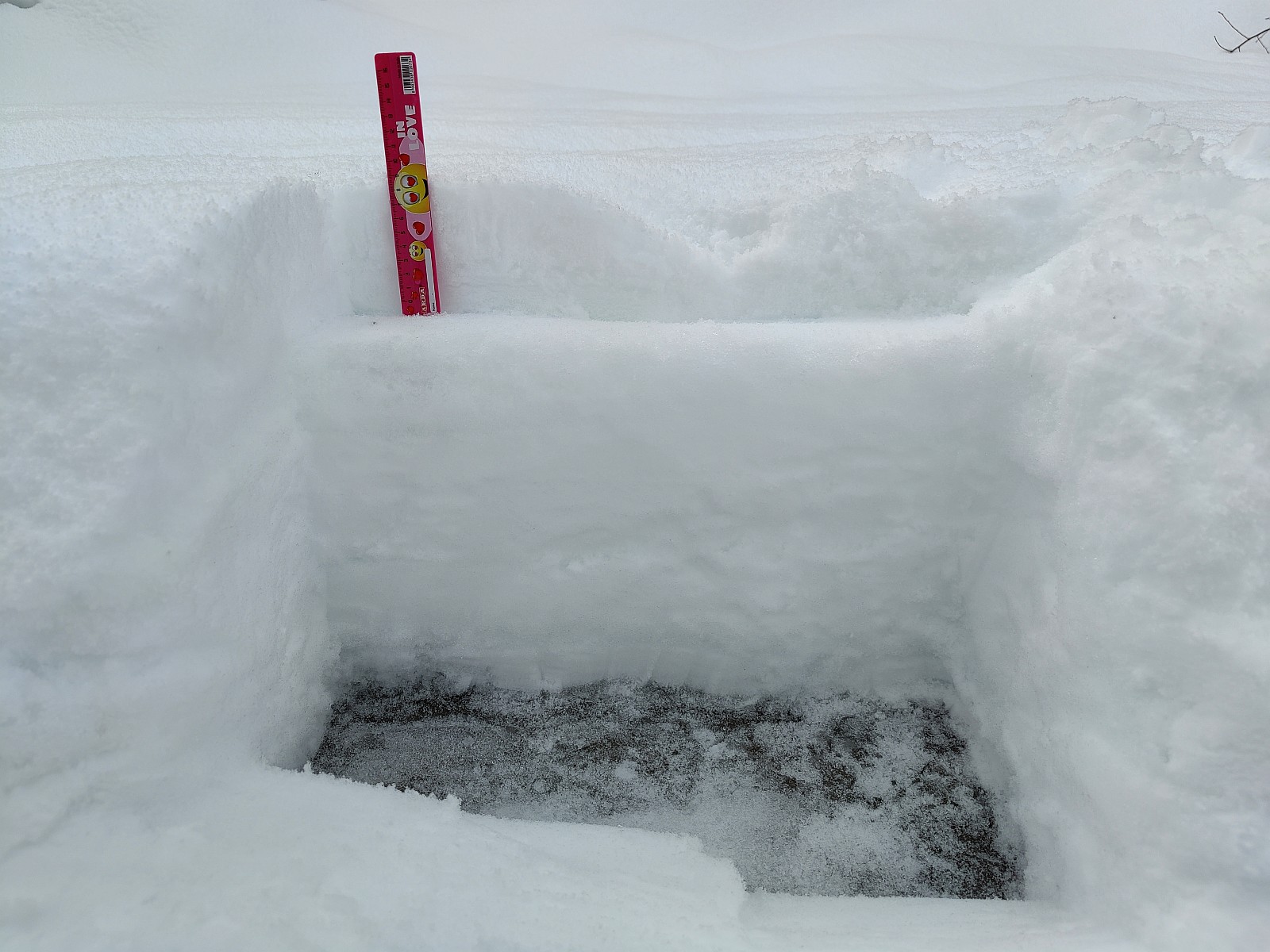 Beeindruckend ist die Gesamtschneehöhe, die in den geschützten Waldlichtungen noch so rumliegt. Ich habe zur Dokumentation den gesamten bickelharten Schnee mit einem Lineal "herausgesägt", um Alt- und Neuschnee zu messen. Total habe ich in einer Waldlichtung (auf dem Waldweg) auf 535 m ü.M. ca. 45 cm Gesamtschneehöhe gemessen, und dies trotz ziemlichem Verlust letzte Woche mit dem Tauwetter!