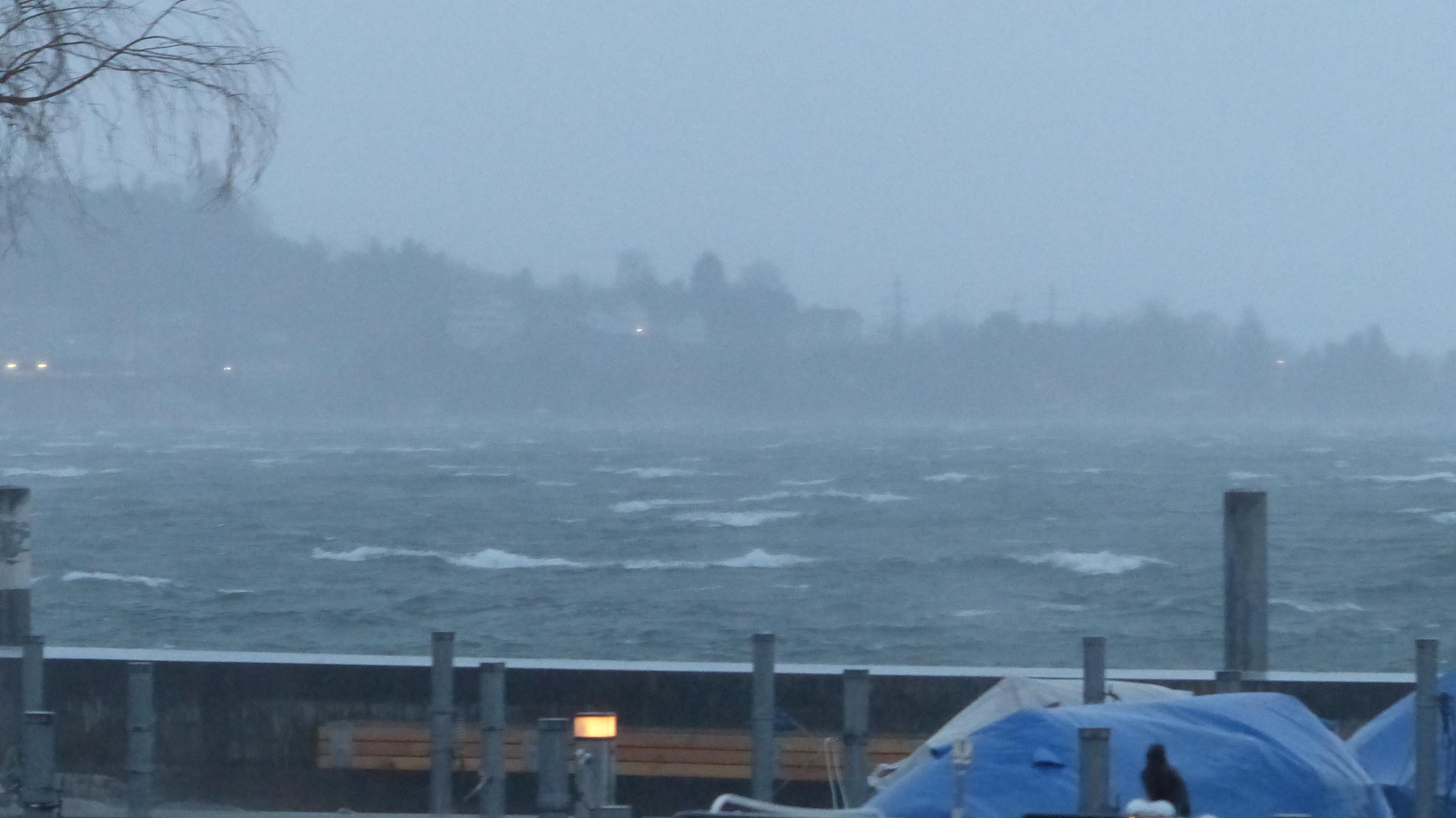An meiner Station in Hittnau Böen bis maximal 50 km/h, an exponierten Stellen wahrscheinlich 10 bis 20 km/h mehr. Temperatur sank innerhalb einer Stunde von 7.6ºC auf 1.8ºC. Sogar einige dicke Schneeflocken mischen sich nun in den Regen.