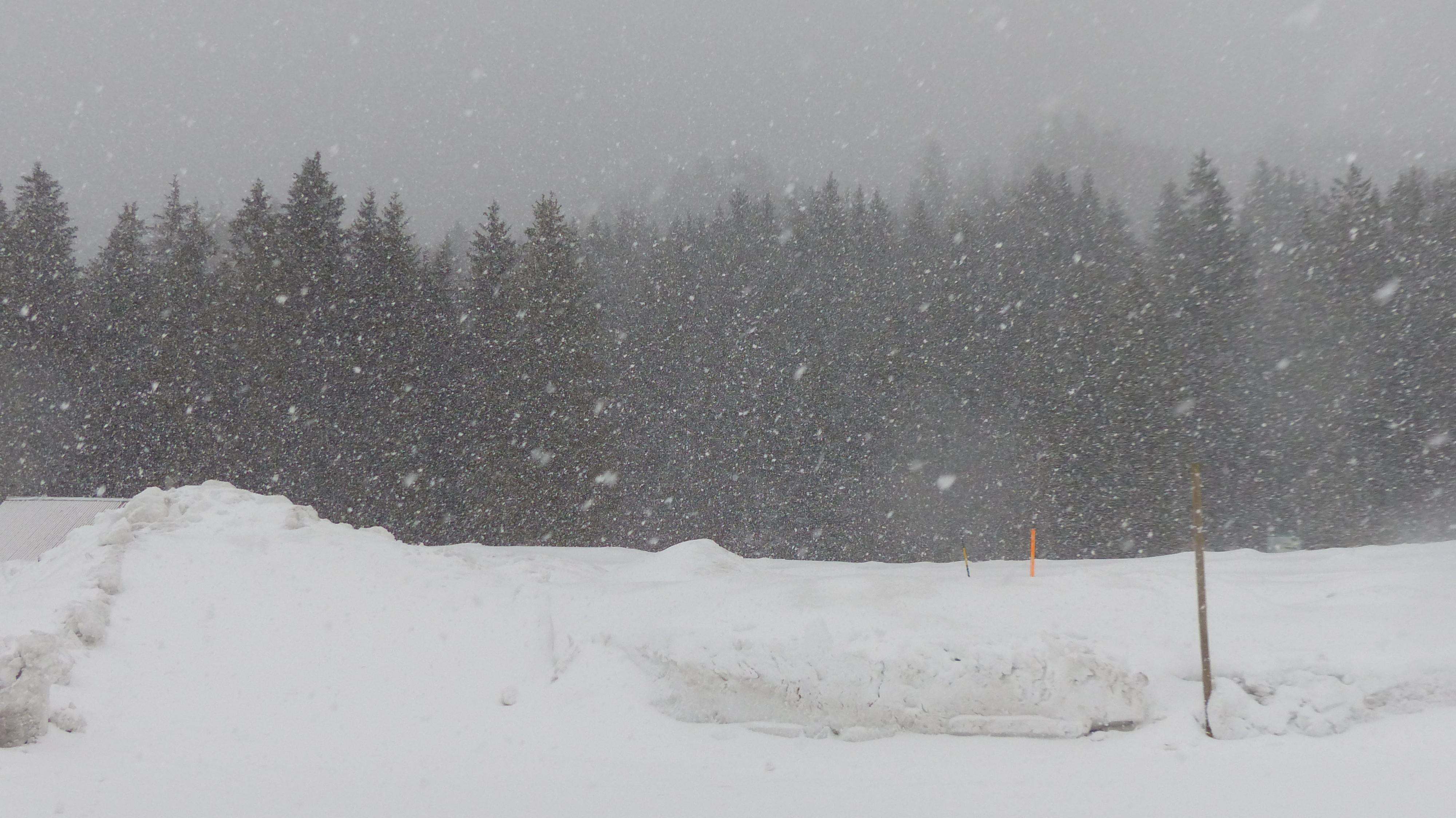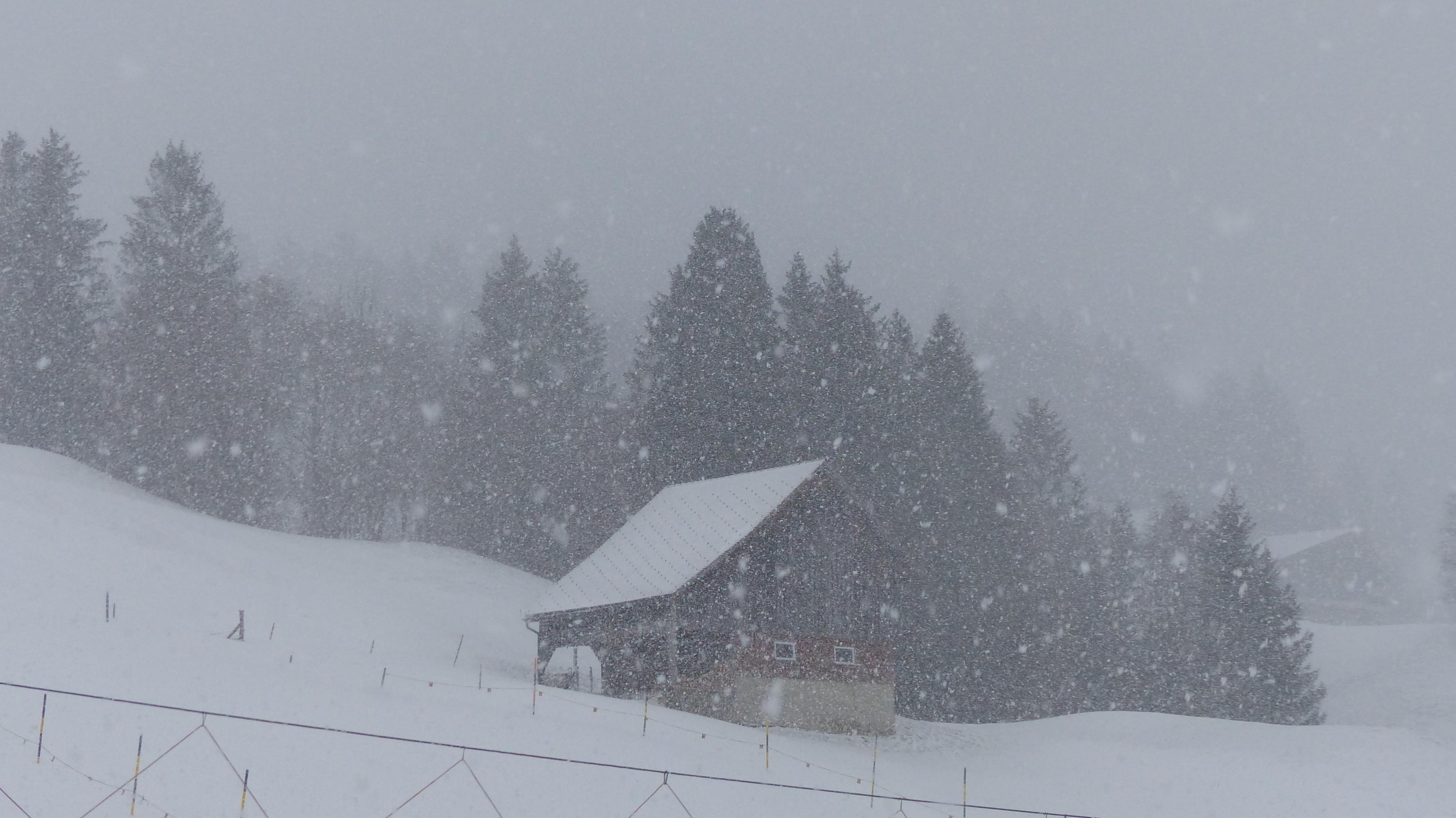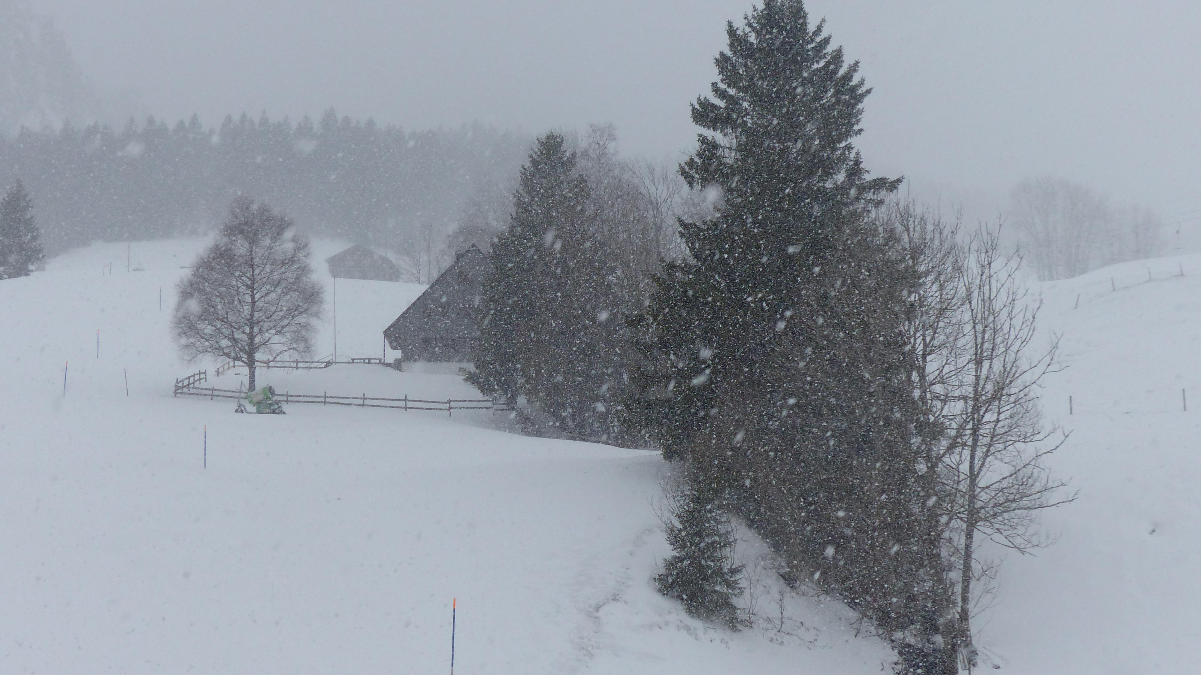 Dort gibt es allenfalls etwas intensivere Schneeschauer wenn welche daherkommen. Ich spazierte am Rande einer Schipiste etwas den Berg hoch. Begleitet wurde ich von einem mässigen Graupelschauer. Dazwischen zogen moderate Böen über die Piste und das Dorf Brunni, die mit dem Schnee spielten. Das könnt ihr im Video anschauen. Um halb Fünf kam ein relativ intensiver Schneeschauer. In flüssiger Form wäre die Intensität des Schauers auf dem Niederschlagsradar im dunkelgrünen Bereich. Hier ein paar Bilder davon.