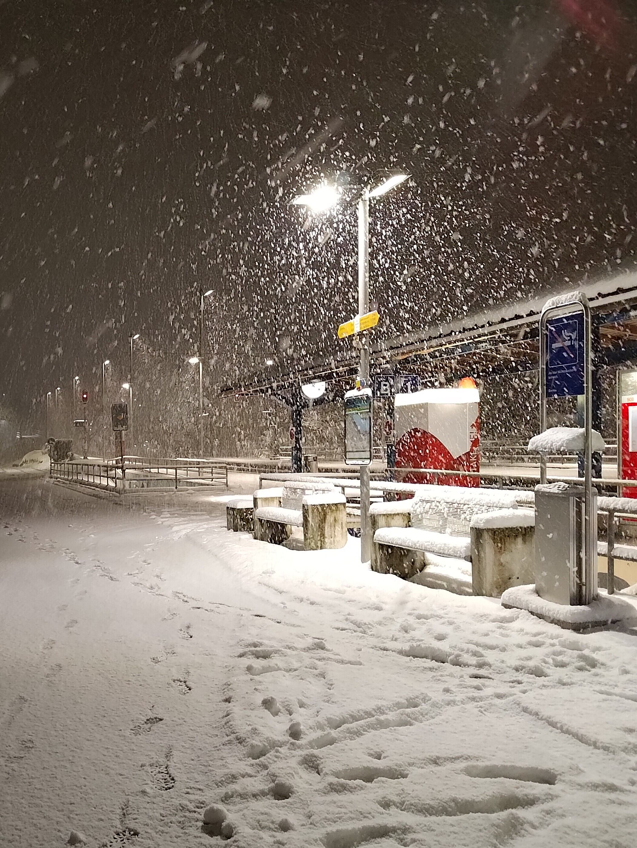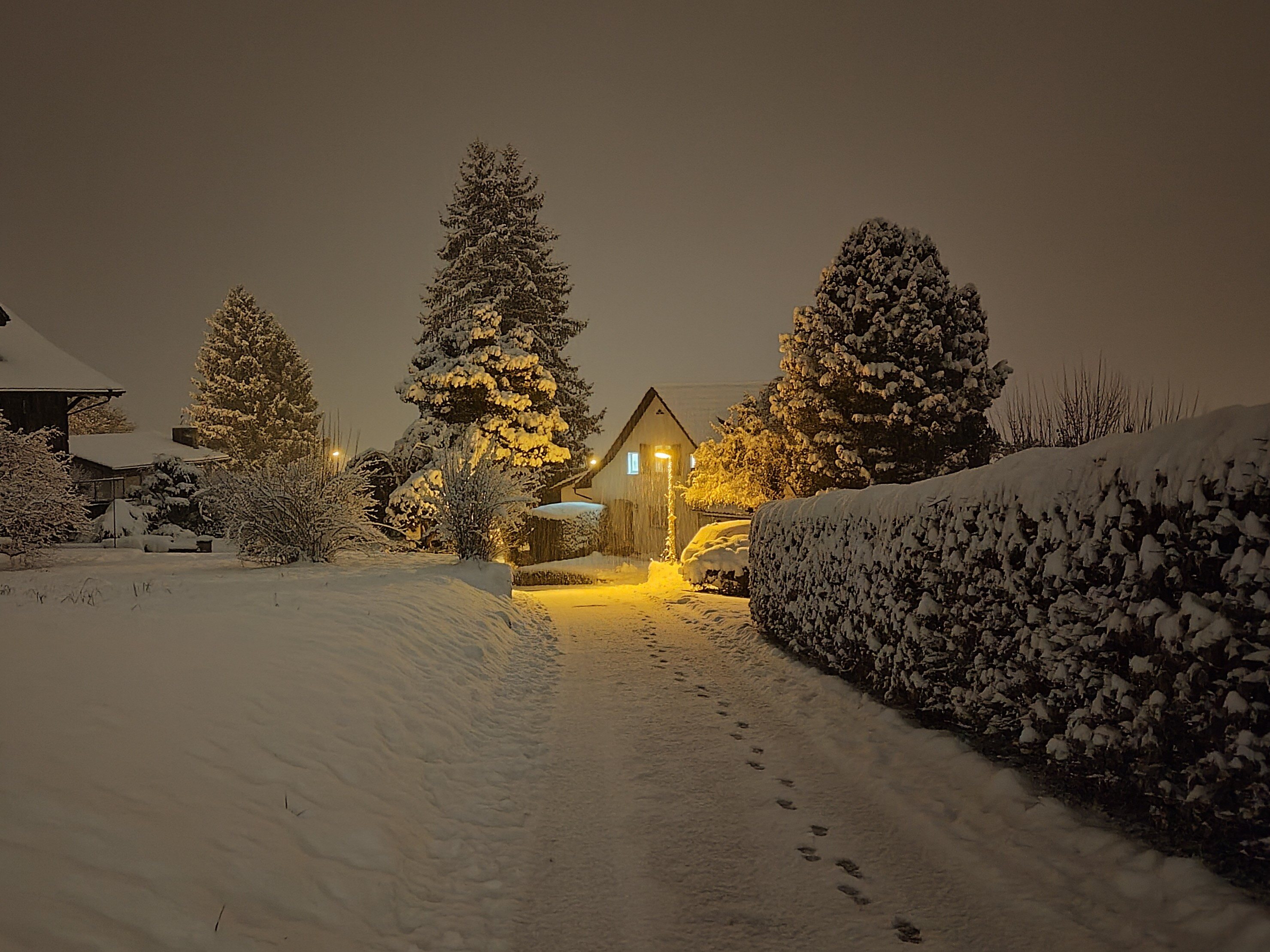 ), nahm ab etwa Wichtrach der Schneefall auf einen Schlag zu. Es haute richtig runter und ich fühlte mich im Dunkeln mit den Lichtern und den trotz viel Verkehr richtig weissen, dick eingeschneiten Strassen wie irgendwo in Skandinavien.