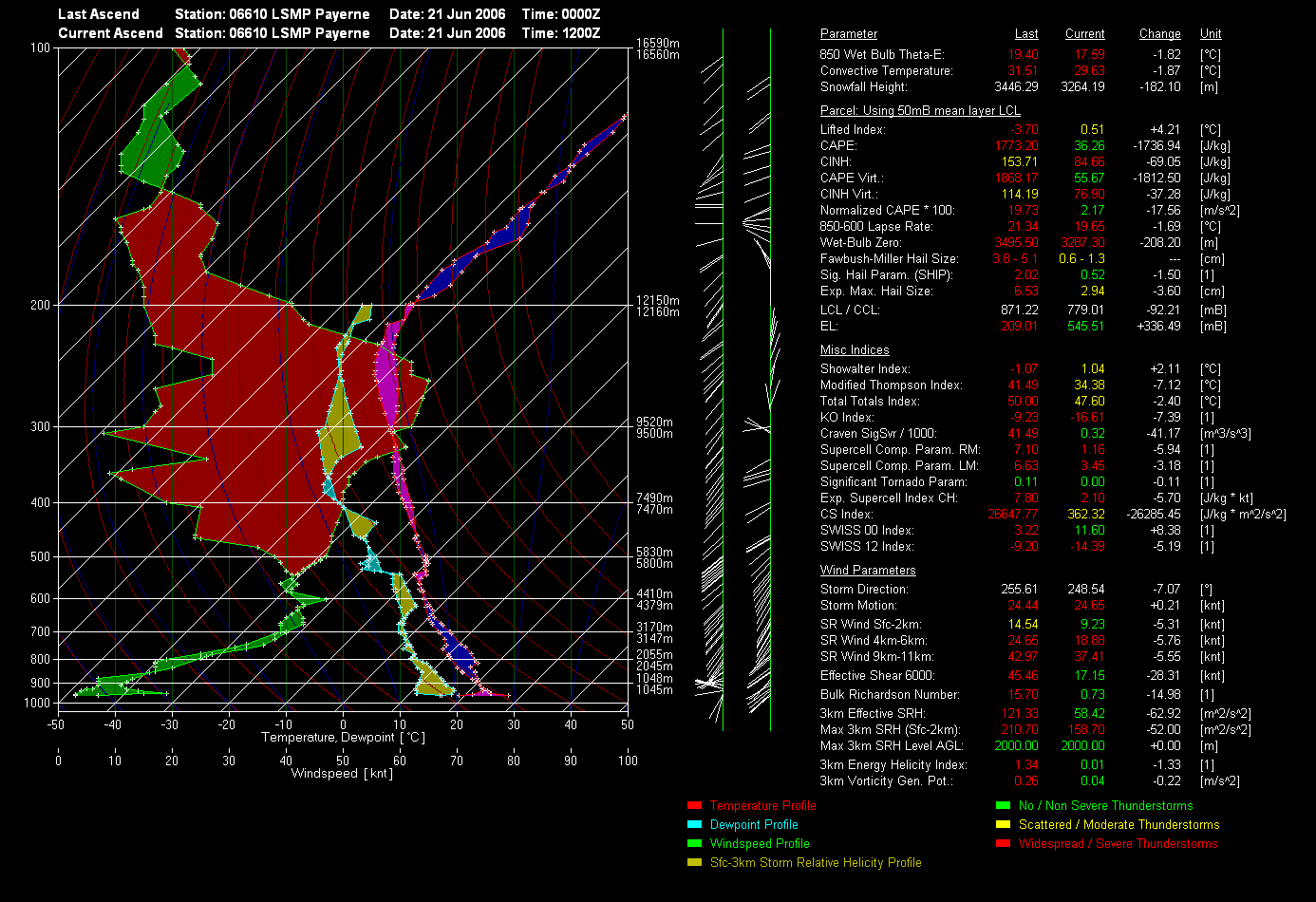 Eine Frage: Inwiefern kann man 00Z und 12Z Sondierungen überhaupt miteinander vergleichen? Bei Wind- und Feuchtewerten dürfte dies unproblematisch sein im Gegensatz zu Temperaturwerten (und Parametern, wo diese Werte miteinfliessen), welche ja auch (v.a. in den untersten Schichten) vom Tagesgang abhängig sind. Jedenfalls stelle ich mir das so vor.