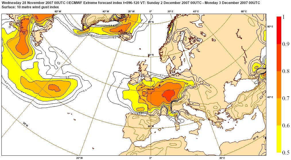 Kurz, ich habe ich es so verstanden: Der Extrem Forecast Index EFI beschreibt die Ausserordentlichkeit eines vorausgesagten Ereignisses, nicht nur mit möglichen Messwerten (zB Niederschlag oder Wind) sondern auch mit der Häufigkeit, das eine solche Lage in einer Modellwelt gerechnet wird. Ein gerechneter Messwert kann an einem Ort unterschätz werden, die Lage als solche wird aber sehr selten gerechnet, was den EFI erhöht.