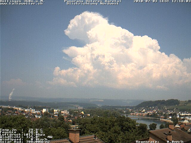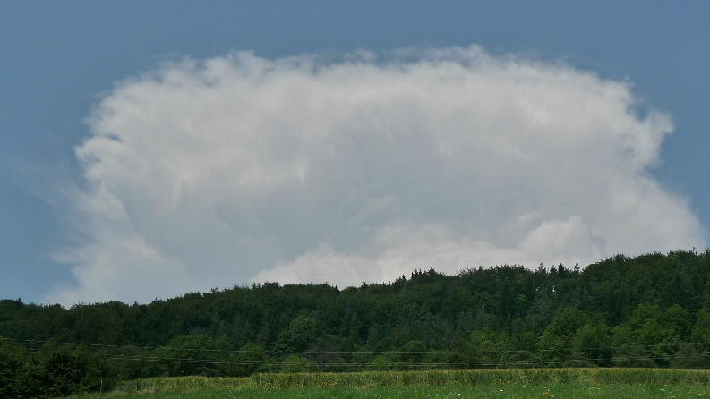 Hier von Allschwil aus sehe ich eine Zelle über den Vogesen. Genaueres kann ich dazu leider nicht sagen, da noch einige Bäume davorstehen. Mittlerweile ist die Zelle aber so hoch, dass sie über die Baumwipfel reicht ;)