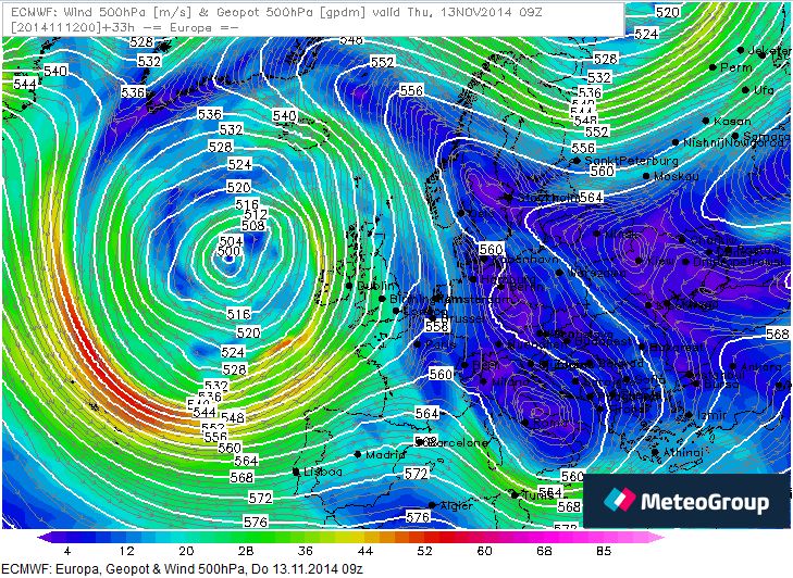 Seine volle Kraft wird es voraussichtlich am Donnerstag, irgendwann zwischen 09 UTC und 12 UTC erreichen. Die Dimensionen sind schlichtweg enorm. Bildhaft ausgedrückt liegt seine Trockrückseite zu diesem Zeitpunkt vor der Küste Neufundlands, seine Achse zielt auf die subtropischen Gewässer nördlich der Kanaren und seine Trogvorderseite liegt über Westfrankreich! Das Tief umfasst eine Fläche, die grösser ist als ganz Westeuropa (gehts überhaupt noch grösser?).