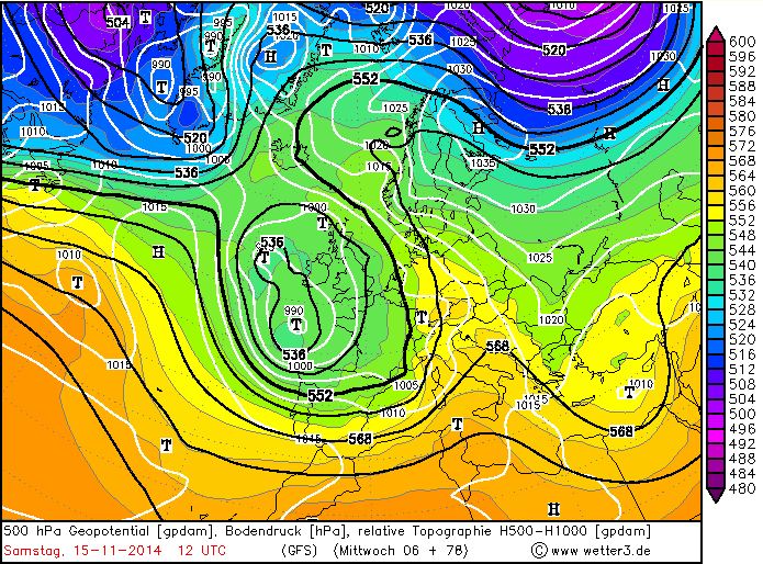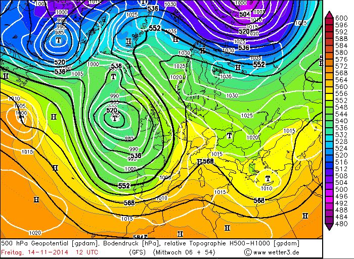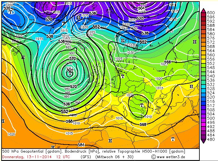 Es sieht tatsächlich so aus, als ob die Alpensüdseite auch in den nächsten Tagen nicht zur Ruhe kommen wird. Während alle noch wie gebannt auf die Unwetterlage blicken, formiert sich über dem Atlantik (ja,ja, nicht über dem schneebedecktem Sibirien ) bereits das nächste Tiefdruckgebiet, welches das Wetter in West- und Zentraleuropa über das Wochenende hinaus massgeblich beeinflussen wird. EZ wie auch GFS markieren die Bildung eines - rein von den Ausmassen her - gewaltigen Zentraltiefs, welches zumindest den Synoptik-Interessierten mit der Zunge schnalzen lässt.