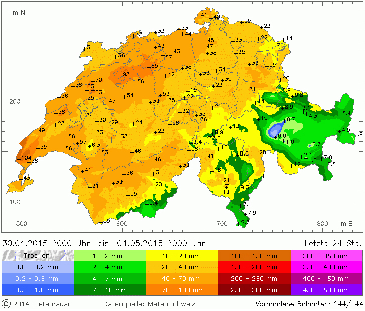 Und das haben die Radom(F), MeteoSchweiz und Meteogroup Stationen die letzten 24h gemessen: