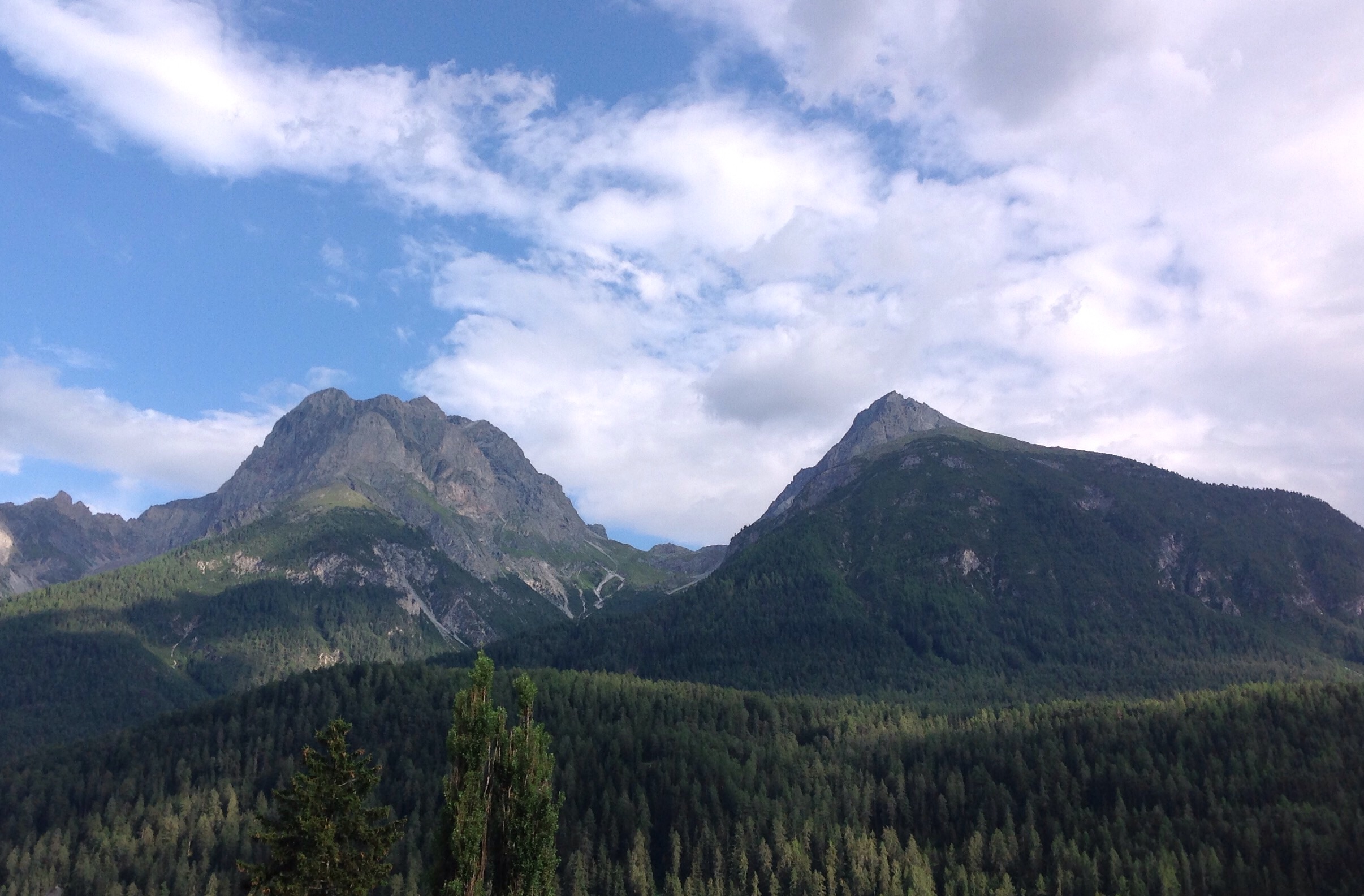 Blick von Scuol Richtung Sesvennagruppe. Interessant hier: Die Sesvenner ( links der Lischana mit 3105 m.ü.m) sind eigentlich auch im Sommer im Gipfelbereich meistens mit Schneefeldern bedeckt. Nicht so in diesem Sommer. Die aussergewöhnliche Hitze hat hier ganze Arbeit geleistet. Die zwischen 3000 und 3400 m.ü.m erreichenden Sesvenner sind nahezu schneefrei. Ich kann jedenfalls keine, auch noch so winzigen Schneefeldern erkennen.