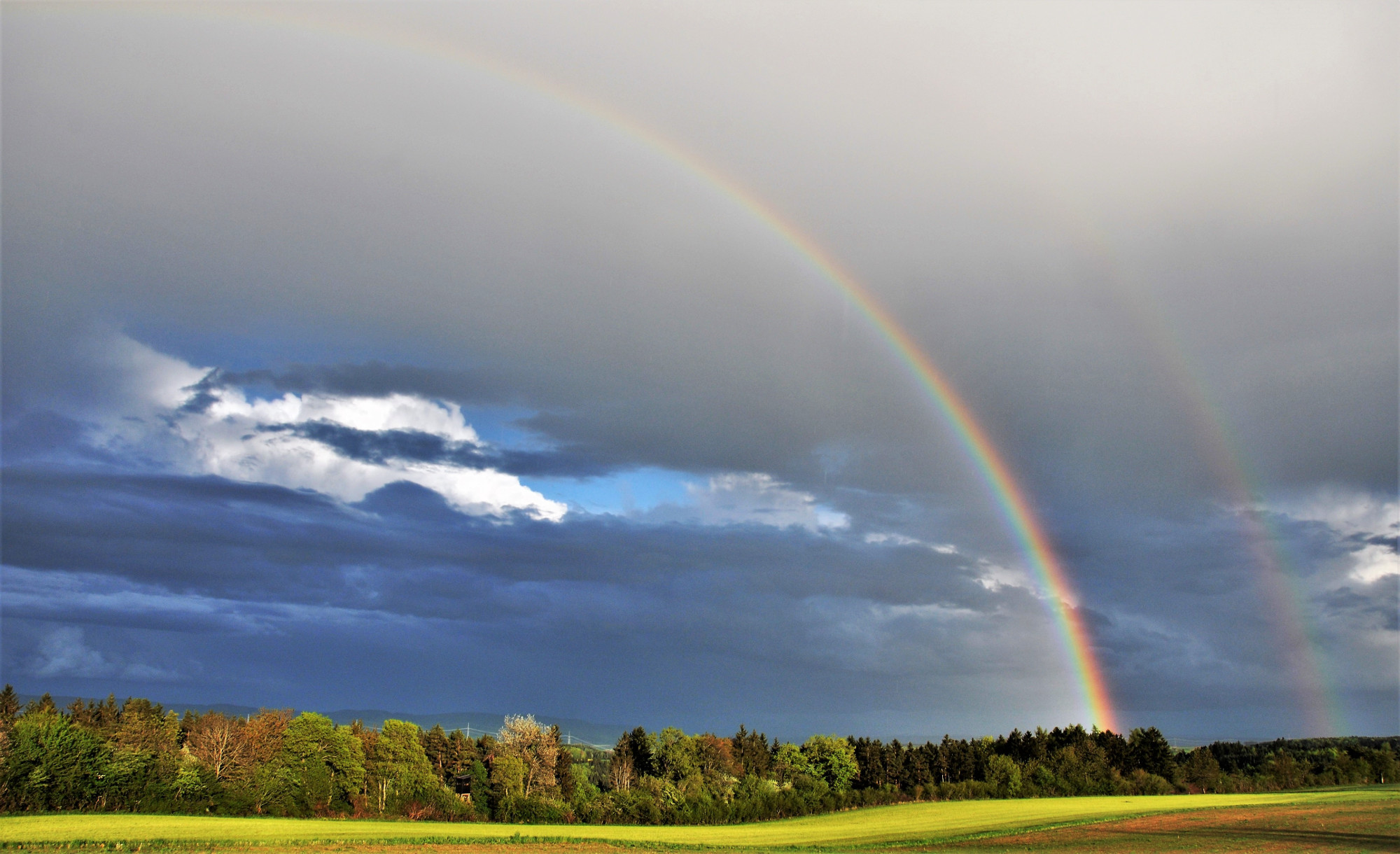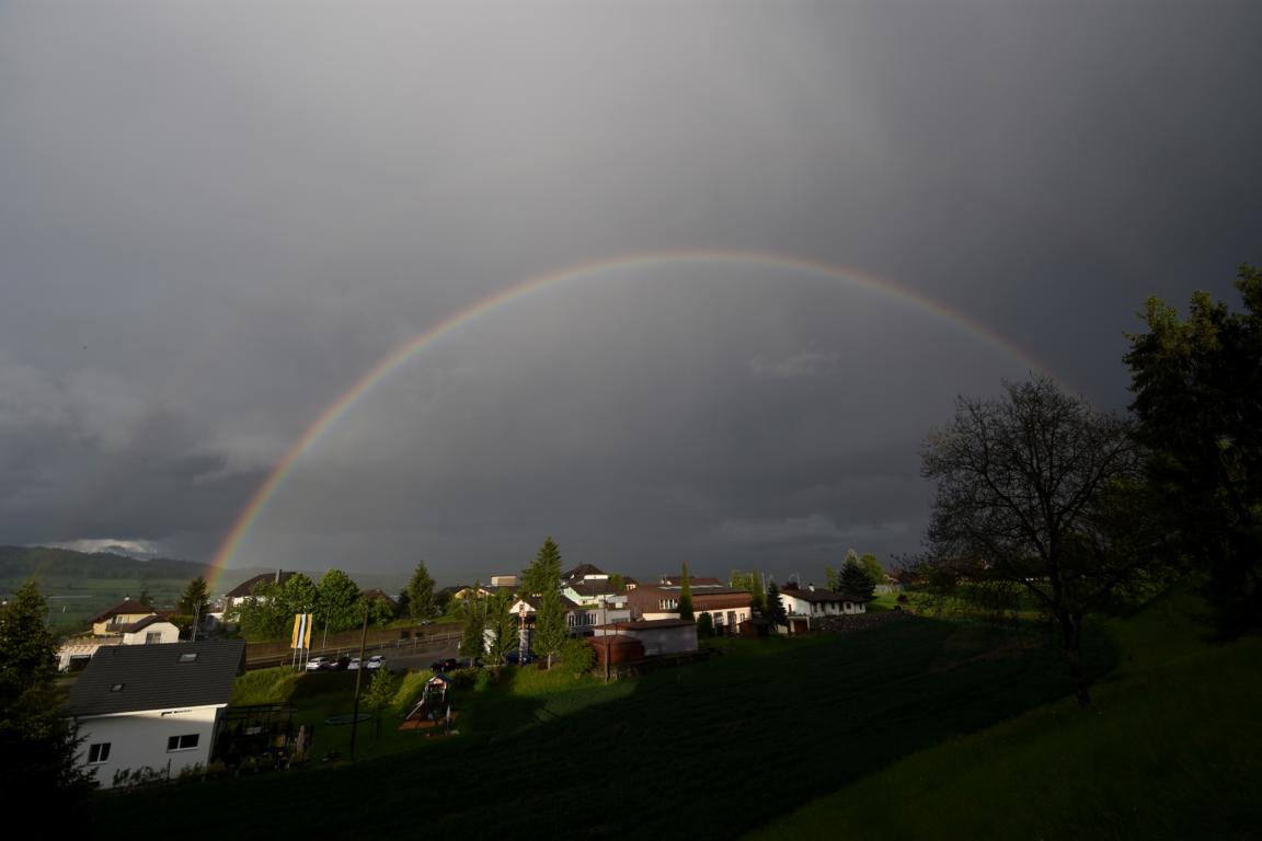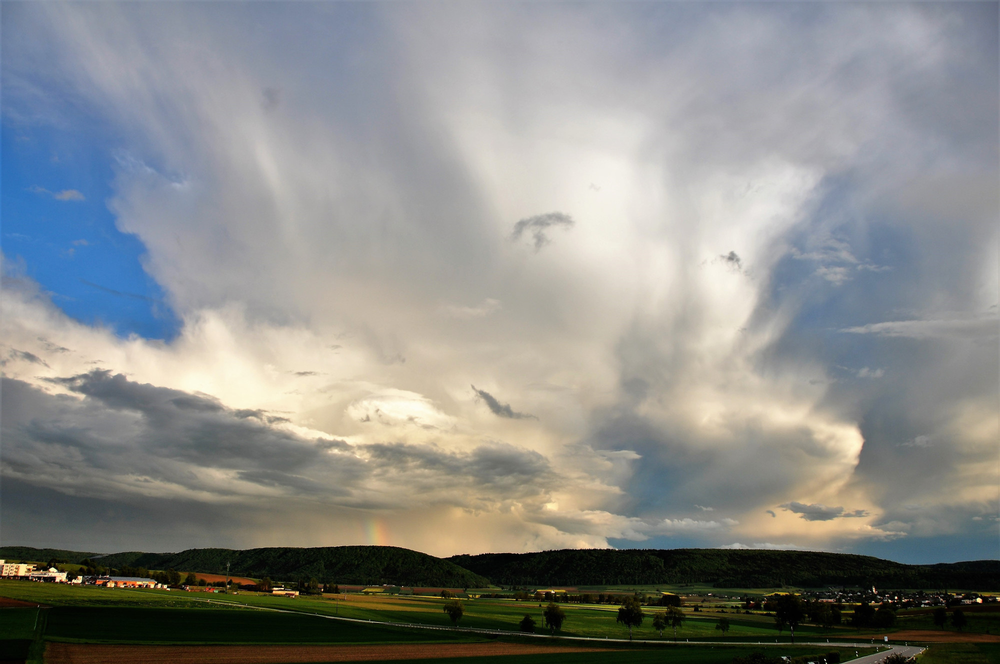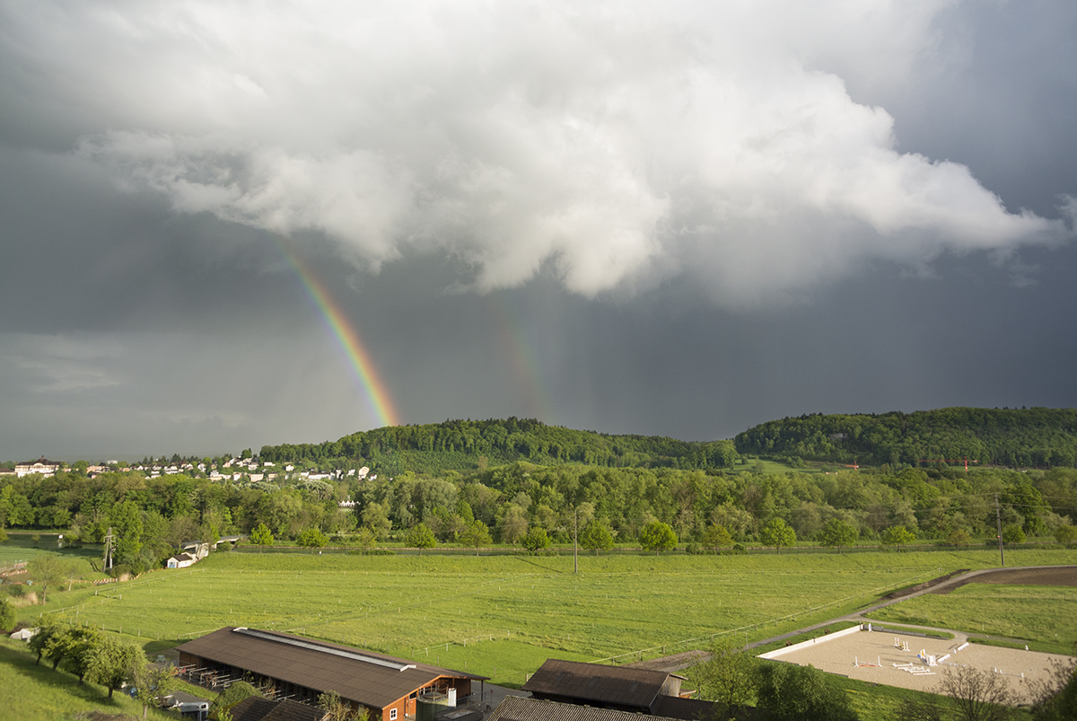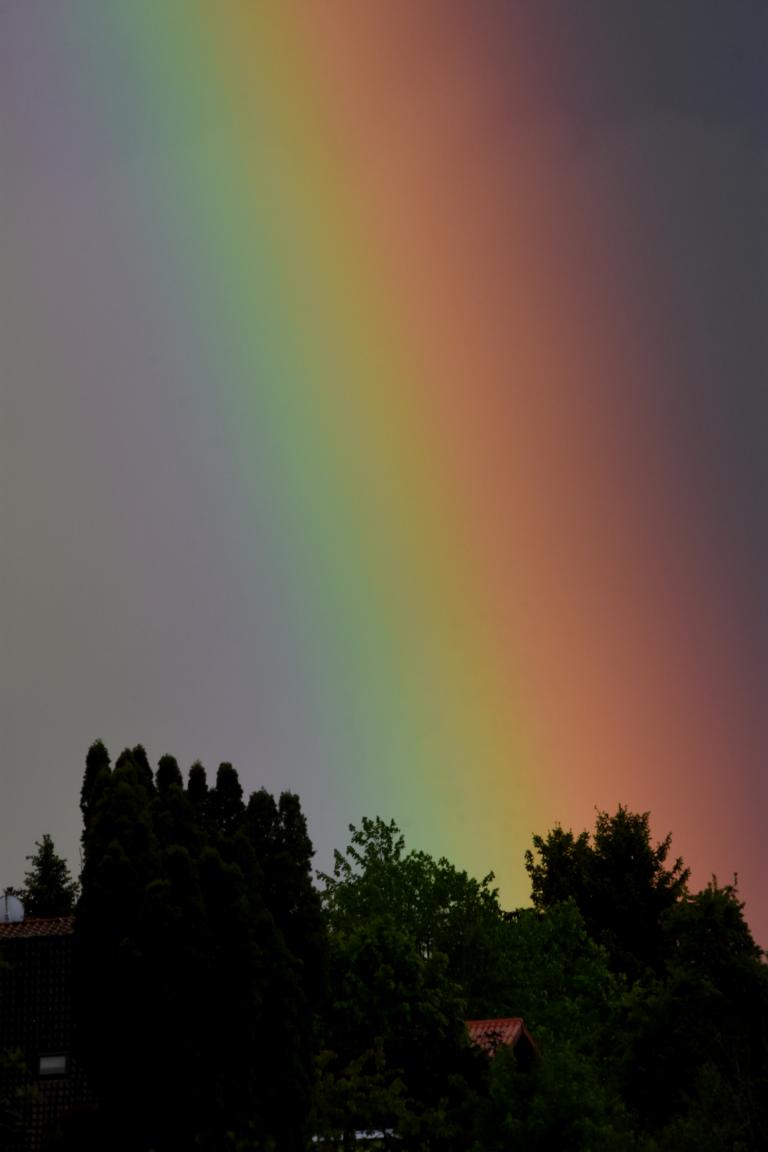 Rückseite von Zelle Nr. 7 mit Regenbogen (da ich kein Superweitwinkel habe ist nur ein Teil drauf). Bonndorf Ost, mit Blickrichtung Osten, etwa rd. 50 Meter vom Ort entfernt, wo im Mai 2015 (vor zwei Jahren) der Tornado vorbeirauschte.