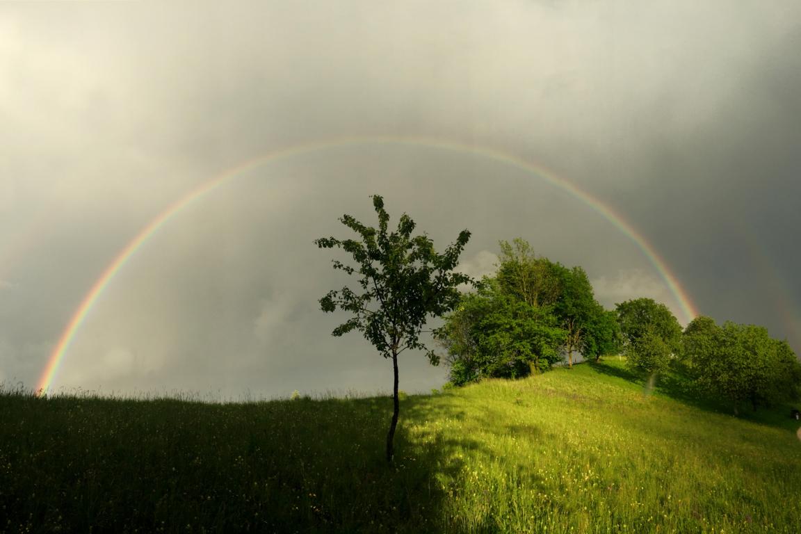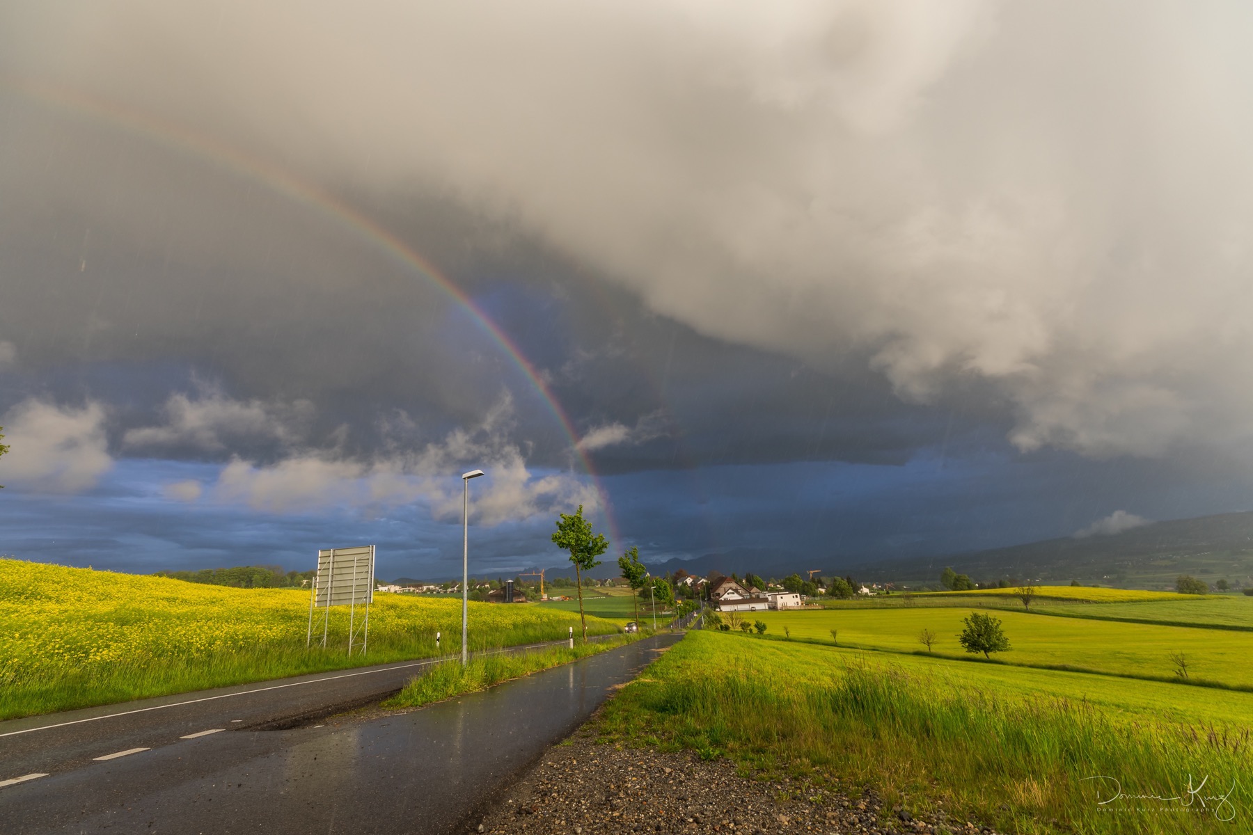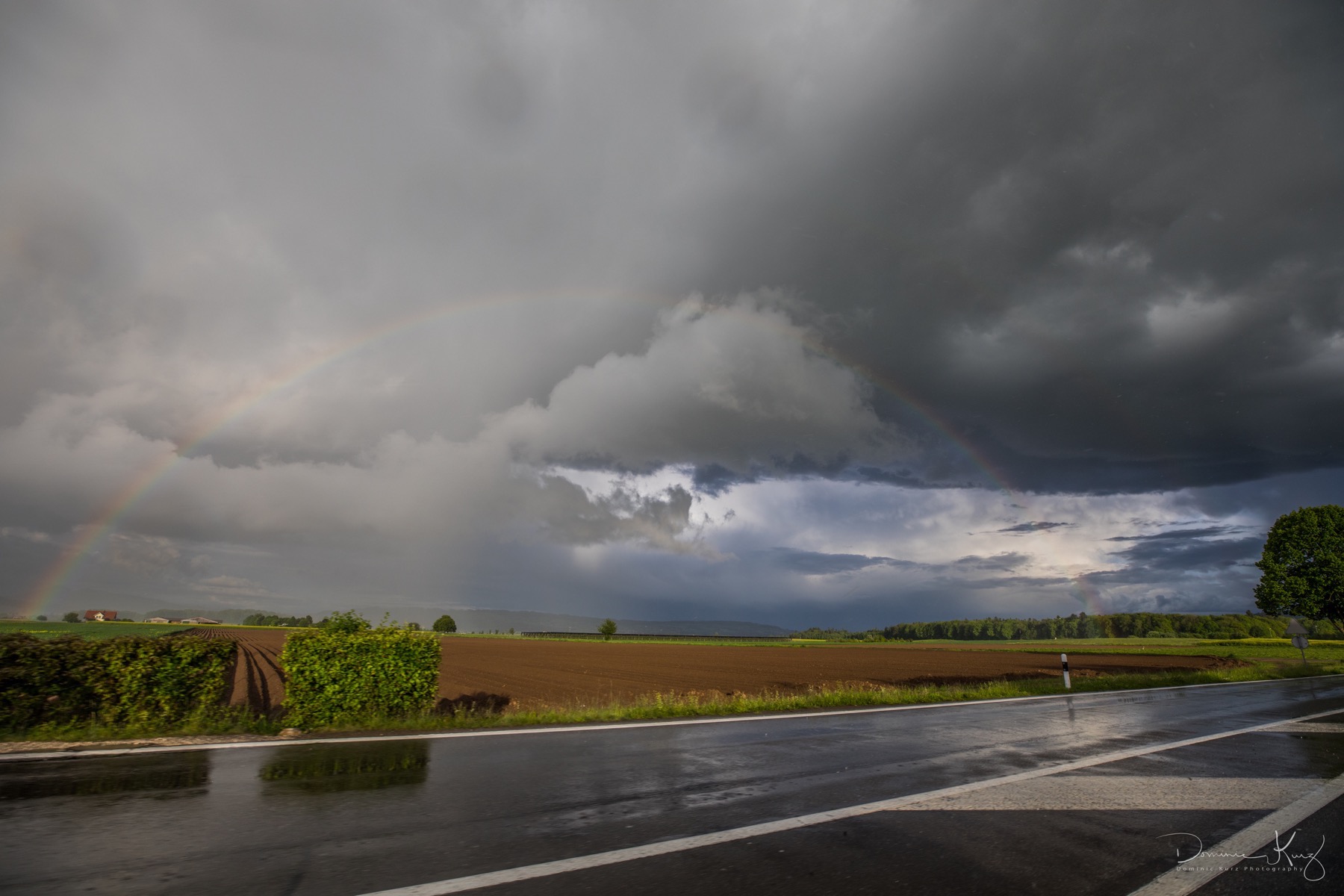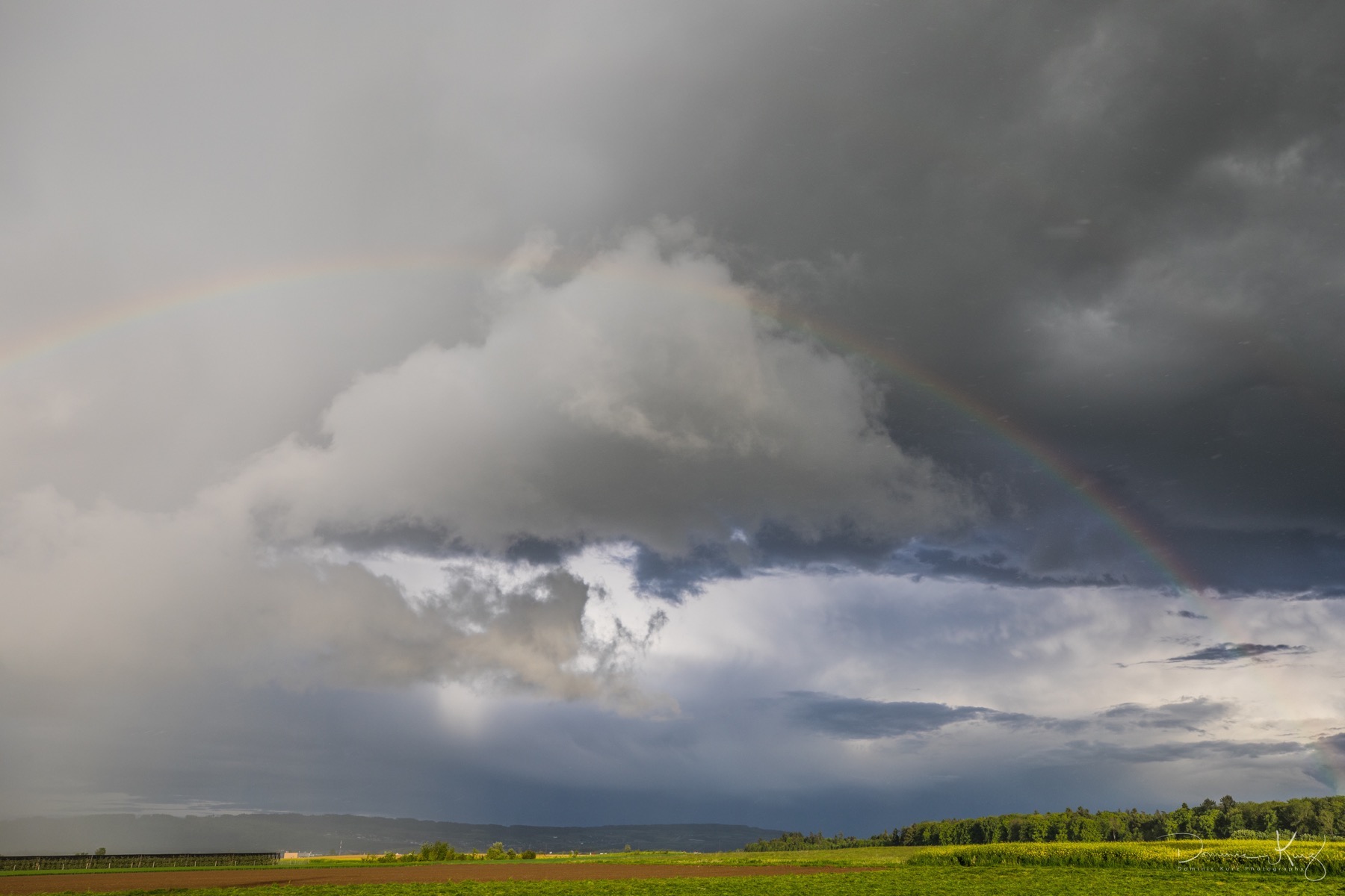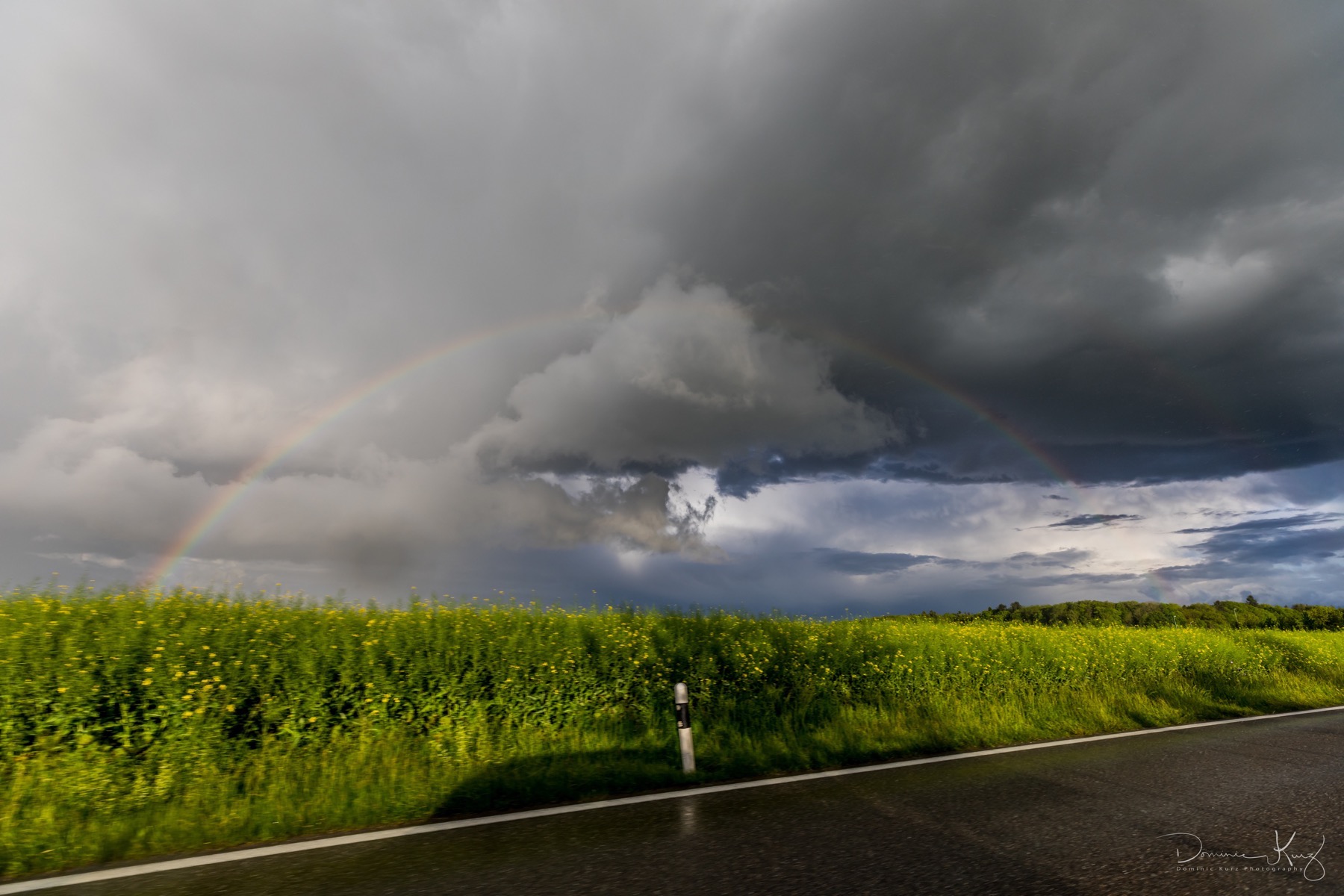 Rückseite von Zelle Nr. 7 mit Regenbogen (da ich kein Superweitwinkel habe ist nur ein Teil drauf). Bonndorf Ost, mit Blickrichtung Osten, etwa rd. 50 Meter vom Ort entfernt, wo im Mai 2015 (vor zwei Jahren) der Tornado vorbeirauschte.
