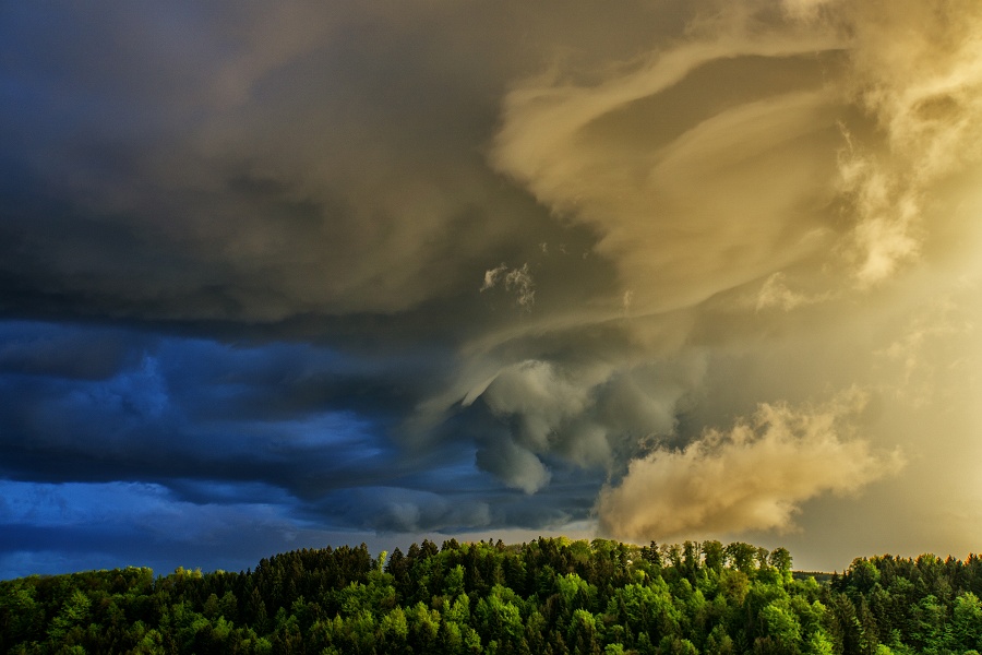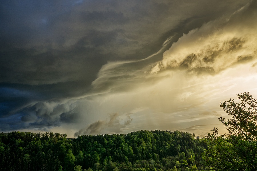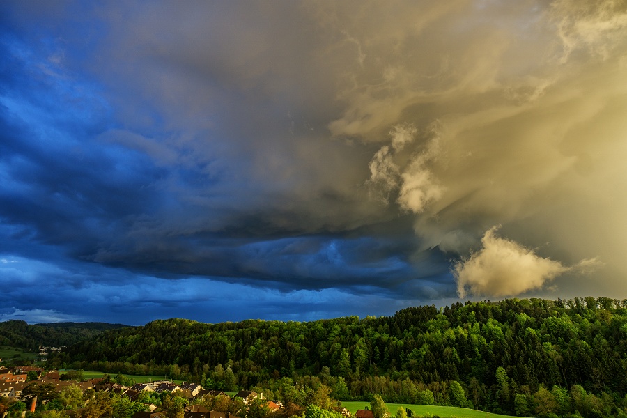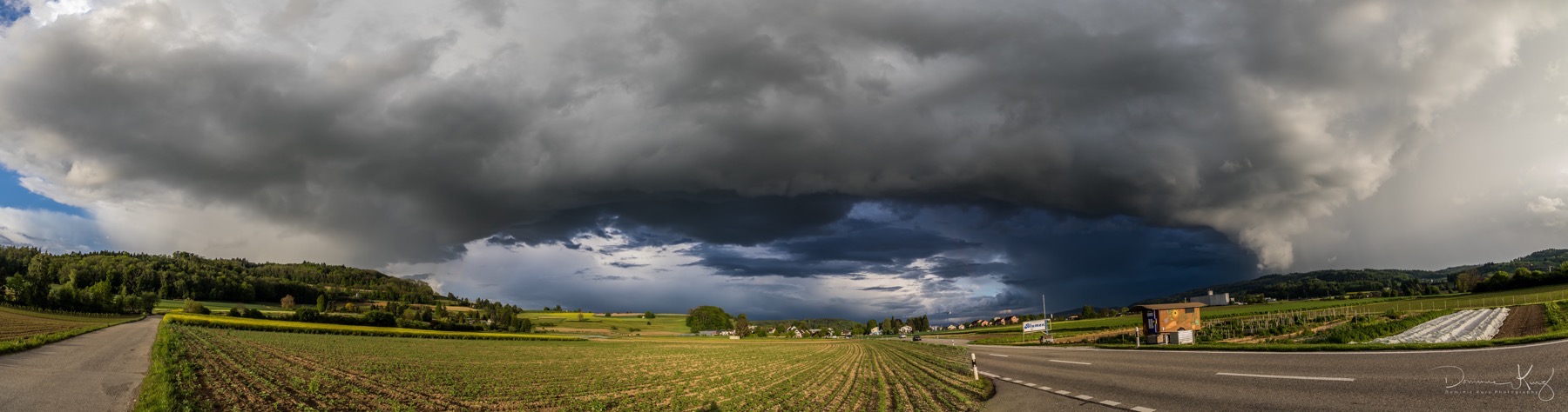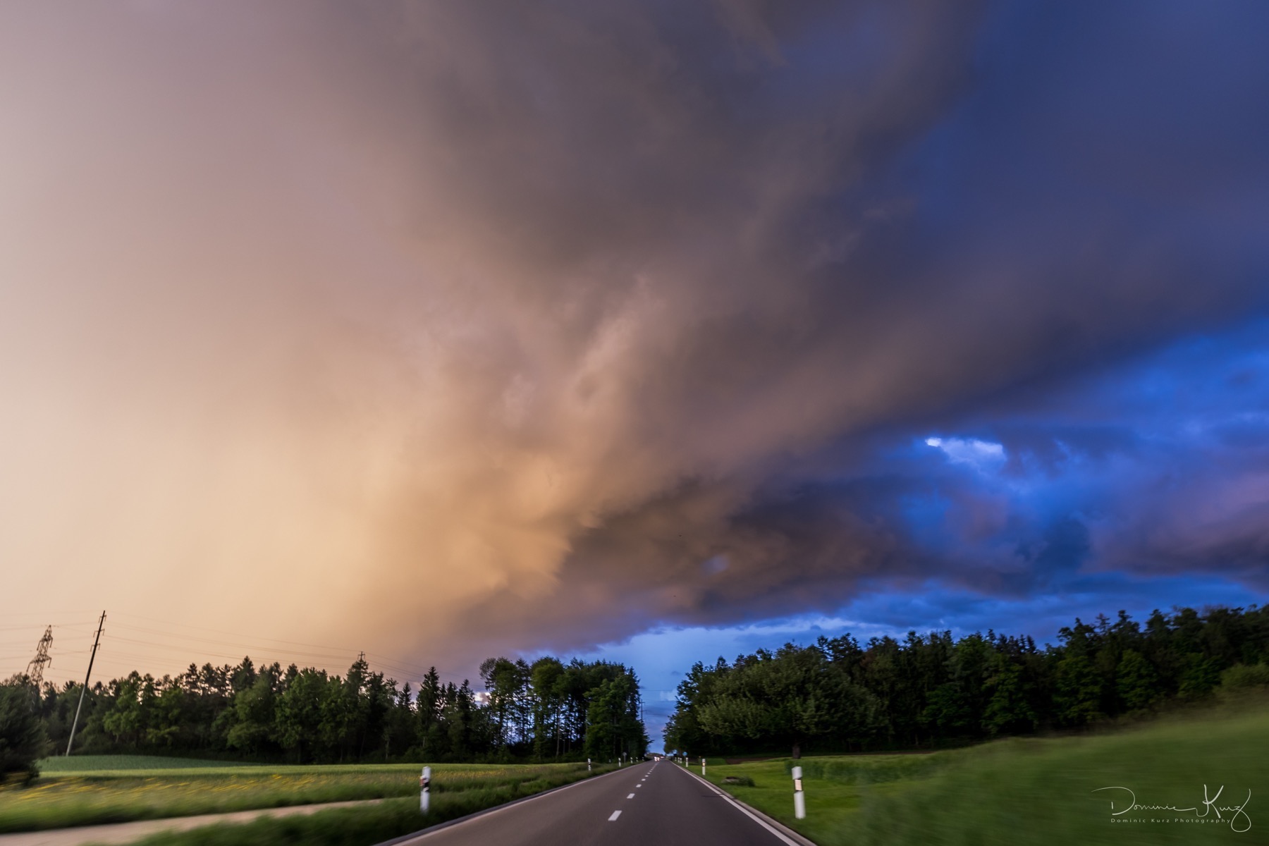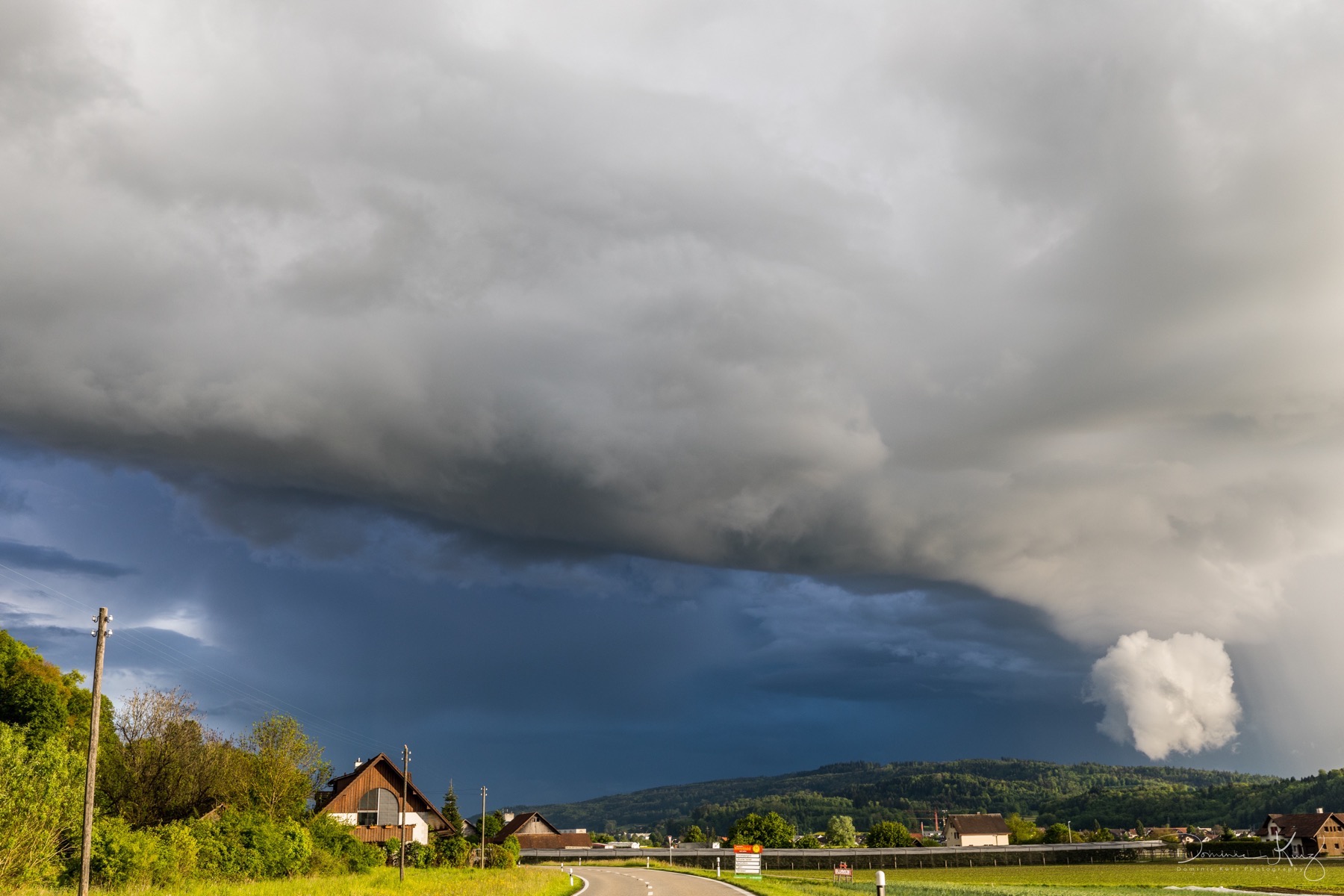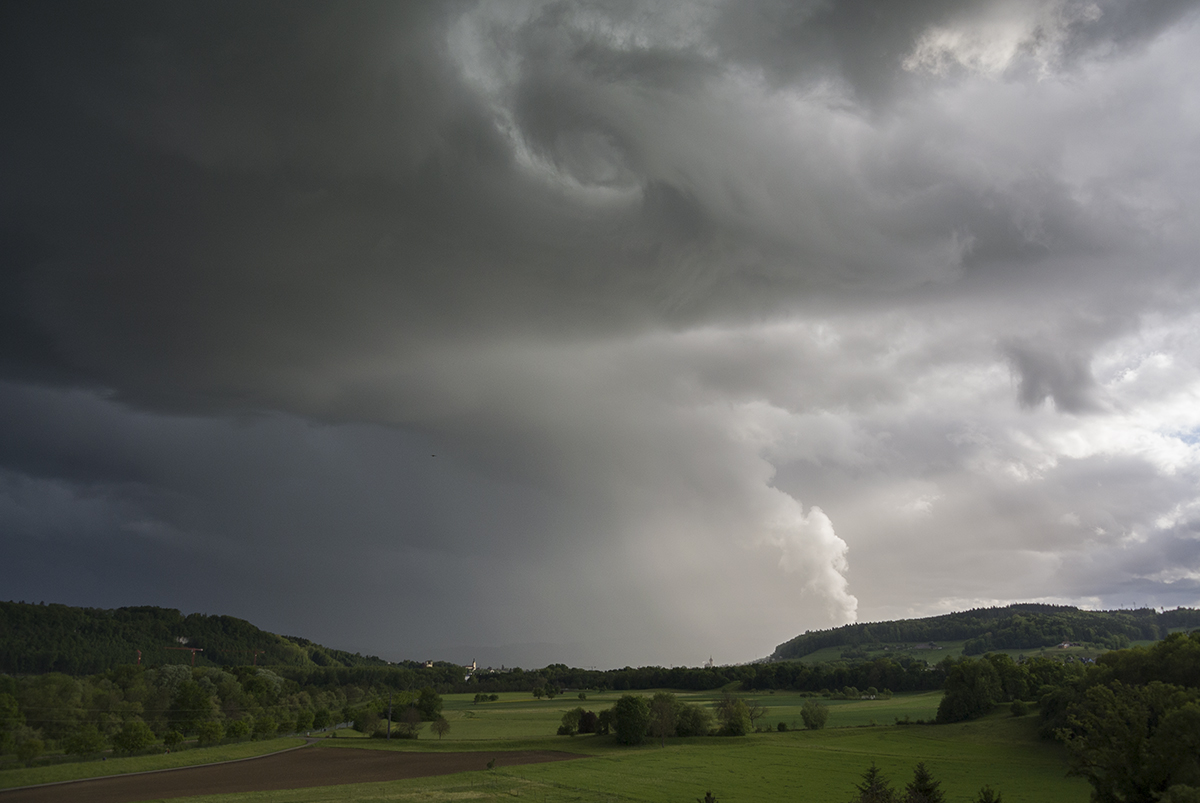 Die Zelle vom Aargau (die Bernhard beschrieb und von welcher er den ZR machte) drehte plötzlich nach rechts ab (habe ich erst ein, zwei Mal so extrem erlebt). Zum Glück fuhr ich nicht auf den Sunnebühl wie üblich, sondern nach Brütten und war näher dran. Die Blitzrate war nicht besonders hoch, aber der Anteil der CGs schon, die man sehr gut sehen und vor allem hören konnte. Die Zelle zog (unter Abschwächung) über Kyburg irgendwo in Richtung Aadorf. Ich überholte sie auf der Autobahn in Richtung St. Gallen, wobei sie eine Zeit lang keine Blitze mehr produzierte. Ich fand bei Münchwilen (TG) einen sehr schönen Spotterplatz, der genau auf der berechneten Zugbahn lag. Diese erste Zelle ging in Landregen über, während in Richtung Voralpen (Süden) eine neue Zelle entstand, mit sehr schönen Blitzen. Plötzlich entstand Richtung Norden eine dritte Zelle, inkl. Donner und kurze Zeit später zuckten in weniger als 3 km die ersten CGs aus einer vierten Zelle im Osten. Doch diese war eigentlich die Zelle Nr. 01 von Brütten, die mich überhüpft hatte, sich wieder neu formierte und schliesslich zur St. Galler-Hagelzelle mit Core in Arbon wurde. Statt diese Zelle zu jagen, fuhr ich wieder zurück, um die Entwicklung bei Waldshut zu beobachten (Zelle Nr. 5) und positionierte mich bei Weiach. Diese klappte aber wieder zusammen, während eine blitzaktive Zelle Nr. 6 bei Freiburg i. Br. den westlichen Schwarzwald hochkrabbelte. Die dürfte bis Donaueschingen durchhalten (dachte ich zumindest...) und so fuhr ich bei Bargen über die Grenze. Der Nordteil ging aber ein und südlich baute sie an. Zudem war sie auf einem direkten Ostkurs. Planänderung: ich fuhr über Fützen und Blumberg (Wutachtal) nach Bonndorf (Zufahrt von Osten her). Doch die Zelle drehte noch etwas nach Süden ab; sie war aber sehr schön strukturiert. Von Bonndorf aus sah ich im Osten schöne, frische und rasante Quellungen wie im Zeitraffer mit schönen Blitzen und tollem Sound. Auf dem Donnerradar sah ich eine zunächst kleine, rot blinkende Zelle...... bei Bargen!!!
