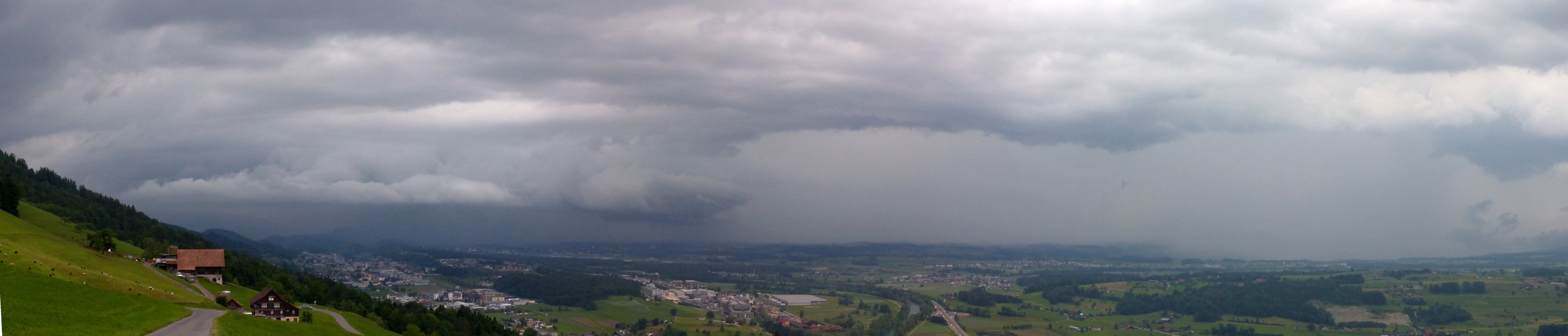 Hier ein Panorama-Bild des Gewitters über Luzern am 20:01 Uhr. Mein Standort ist an der Strasse von Michaelskreuz hoch über Root. Rechts im Bild seht ihr Ebikon und davor Dierikon. Darüber verschwindet der Sonnenberg hinter dem Regenvorhang. In der Bildmitte unten ist die Papierfabrik Perlen und die Renergia. Etwas rechts über der Autobahn und der Reuss ist Inwil und dahinter Ballwil. Rechts im Bild steht eine weitere Zelle über dem Seetal.