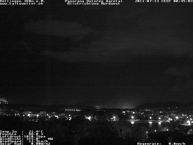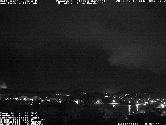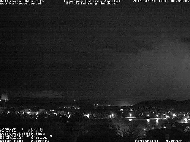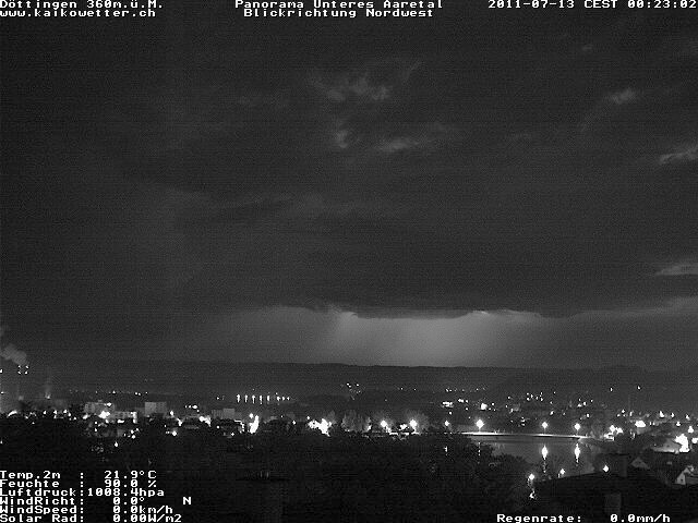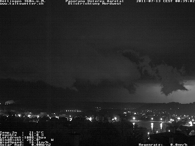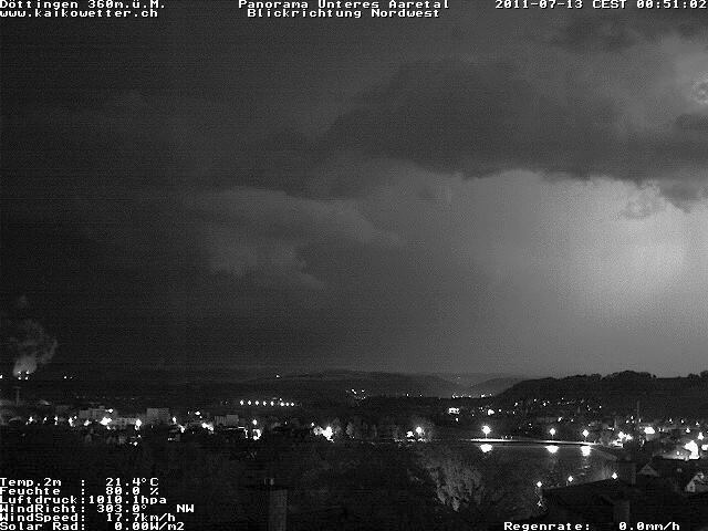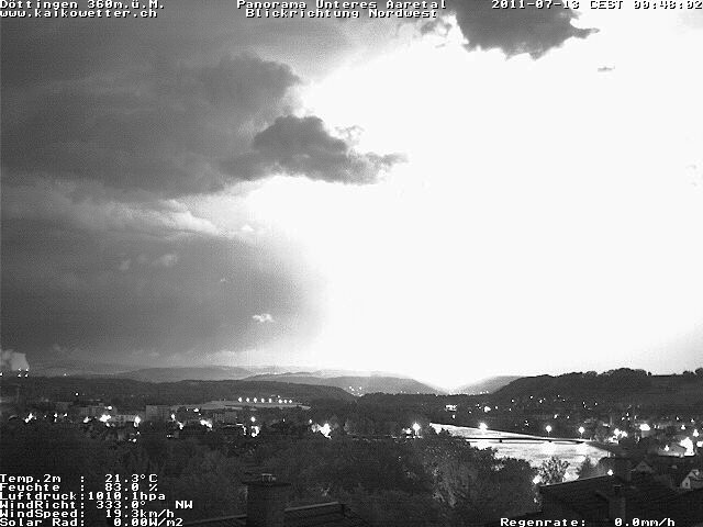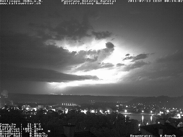 Ich Telefonierte noch mit Gregy und wir beschlossen zum Schloss Lenzburg zu fahren. gegen 0.45 war ich dan in Lenzburg und wir beobachteten wie die Zelle mit der Extremen Blitzfrequenz auf uns zuzog. Kurz nach 1.00 setzten kräftige Böen ein und kurze Zeit später gabs einen kurzen Mäsigen Downburst, danach gabs noch gut 10min Starkniderschlag bevor die Zelle abzog.