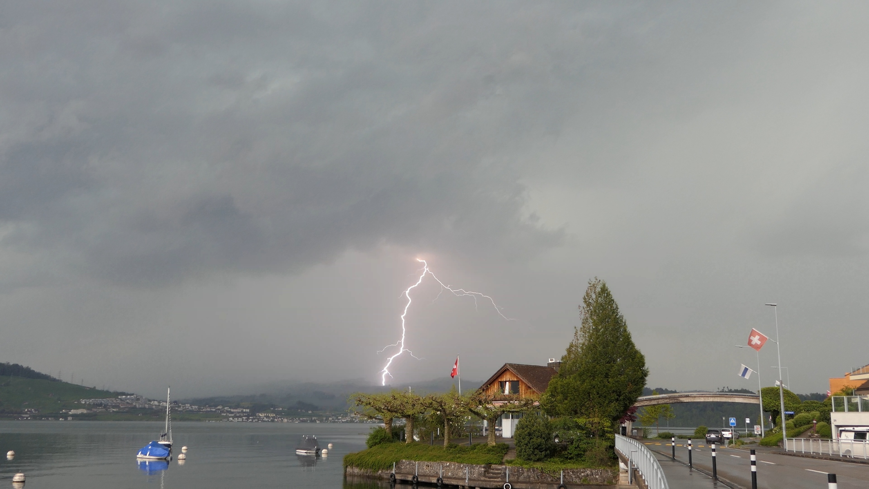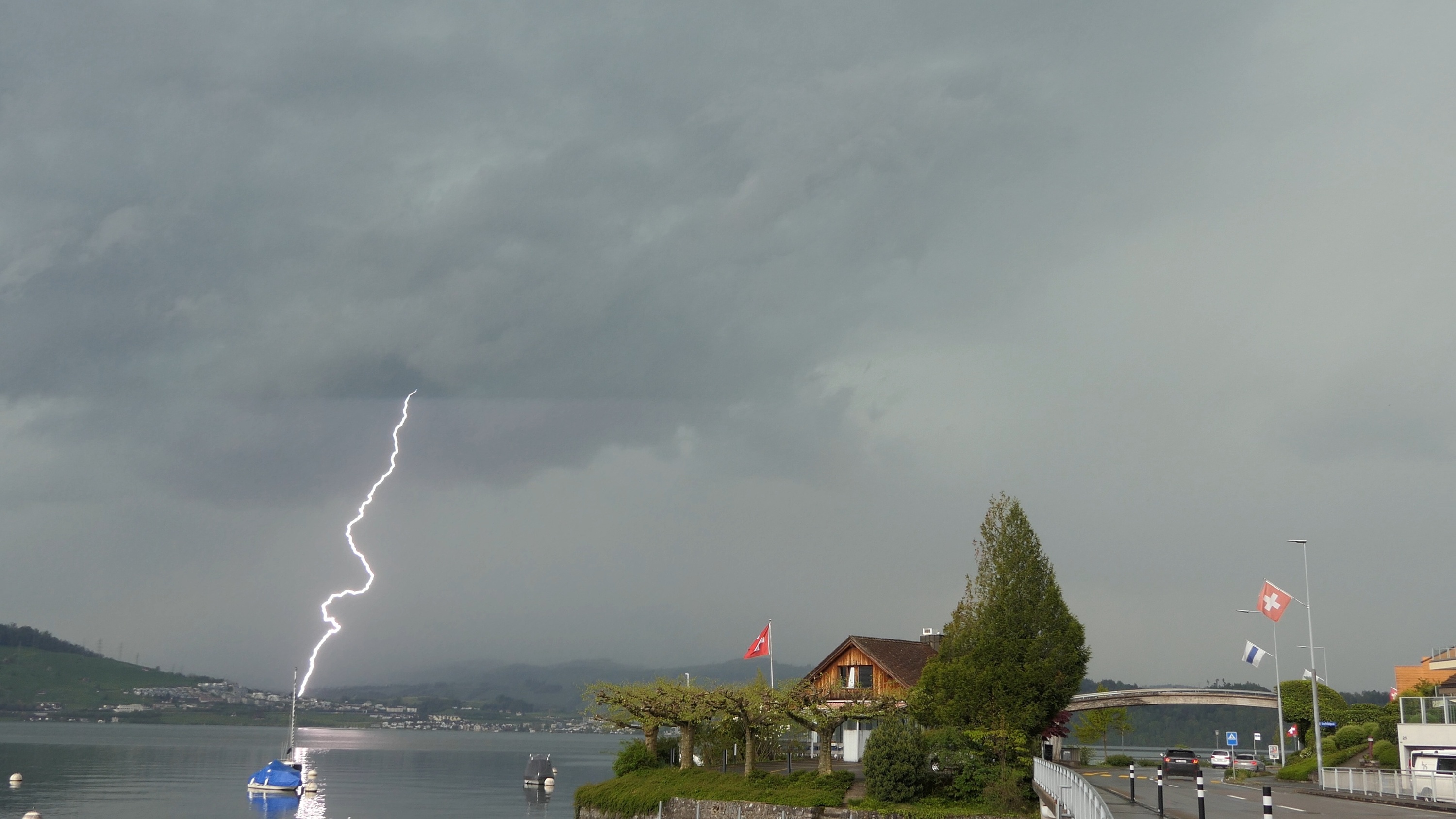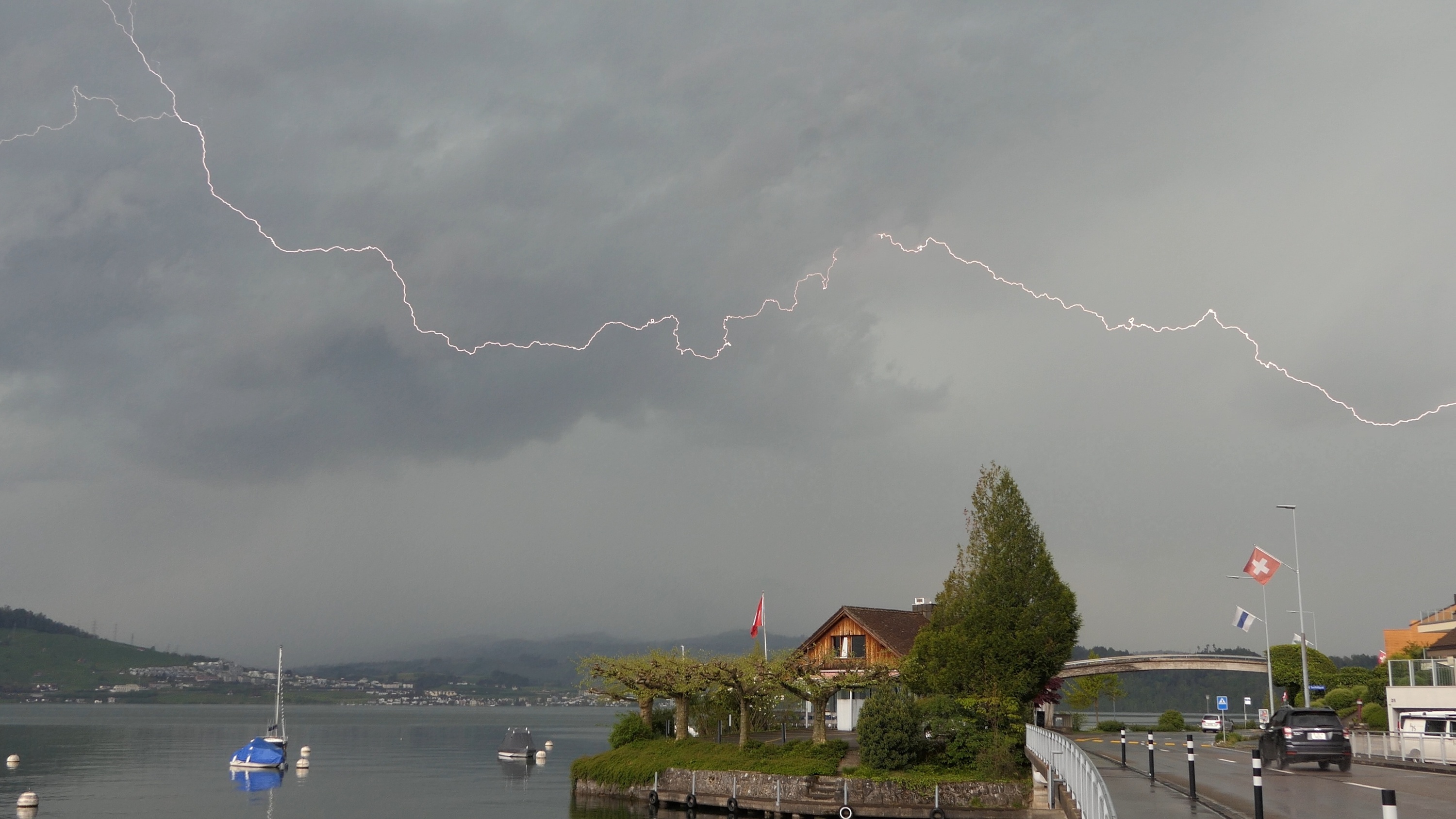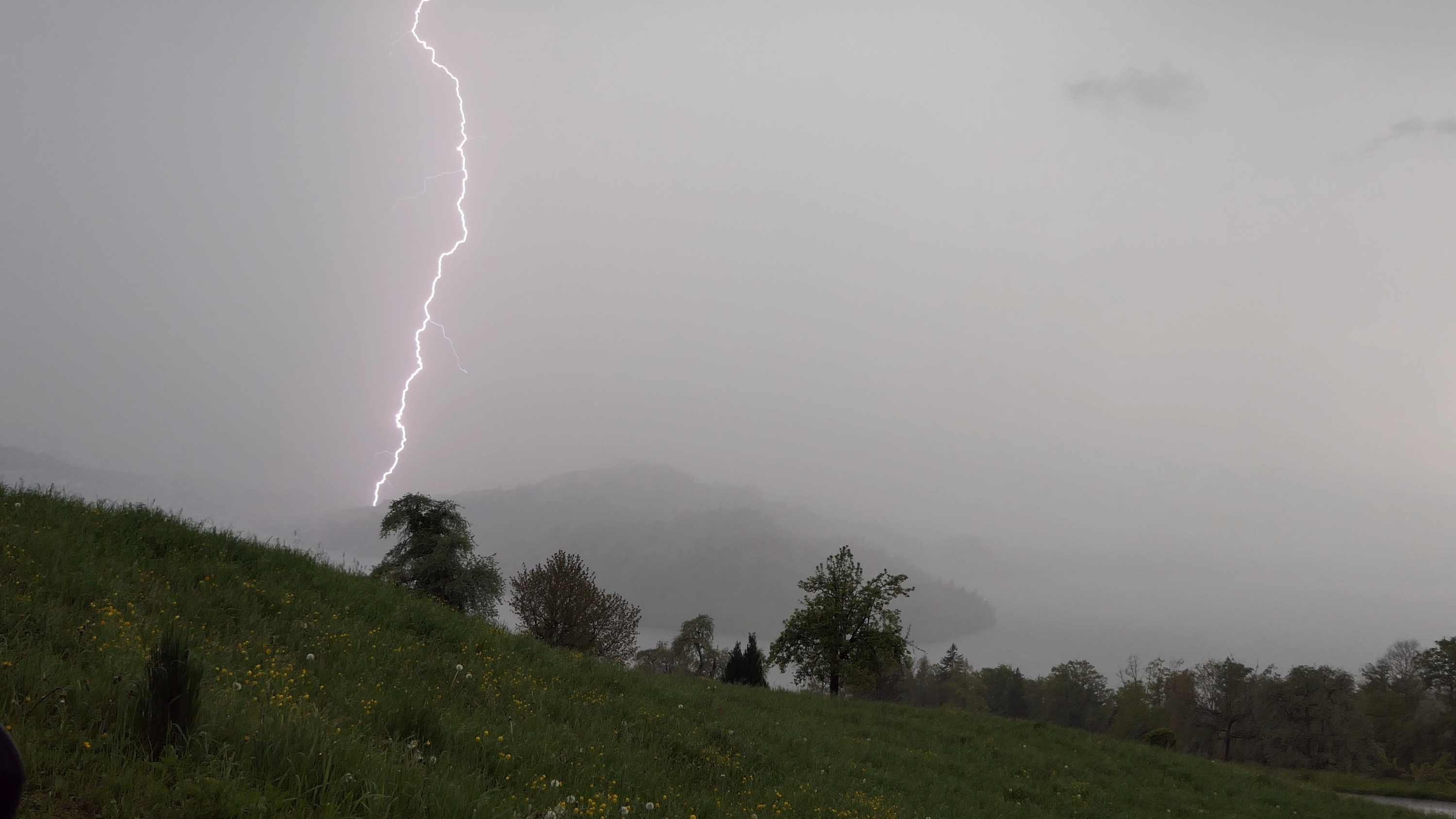 Die nachfolgende Zelle produzierte vor dem Niederschlag viele Erdblitze auf breiter Front, teils aus dem Amboss heraus (folgen im Video).