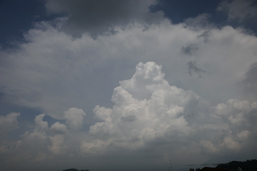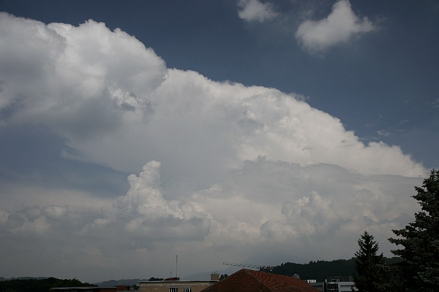 Nun steht auch ein Cb über dem Emmental. Dieser ist dank der Inversion auf dem 600hPa Niveau doppelstöckig. Bisher konnte ich noch keinen Donner hören. Übrigens, meinem Eindruck nach ist die vorhande CAPE jeweils schnell aufgebraucht, wenn es einmal losgegangen ist: Die Zellen in der Ostschweiz scheinen jedenfalls gemäss Radar bereits wieder zu sterben. Mal sehen, wie lange es die Emmental-Zelle aushalten wird.