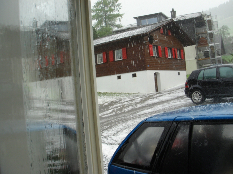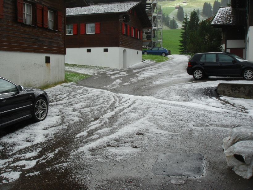 Ich fuhr vorhin über die Ybergeregg und dort hinterliess die Superzelle eine leicht Weisse Landschafft und Hagelbrocken von bis zu 5cm :O