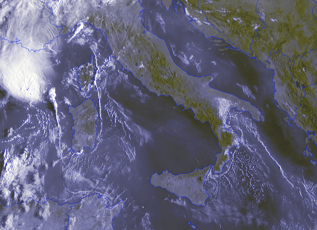 Teile von Italien "Umgarnt" von feinen Wolkenbändern (Ausgeprägt bei Sardienen, etwas schwächer an der Sohle des Stiefels und an der Adria).
