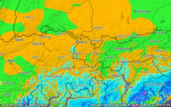 Die erste Karte (bergfex) ist aber von der räumlich unterschiedlichen Schneehöhenverteilung schon sehr merkwürdig. Bsp. die Ausdehnung des 10-15cm Gebietes (orange): Woher stammt die komische Zunge im Rheingraben (Freiburg-wetswärts), oder die (sowieso absolut unglaubwürdige) Ausdehnung über Bern-Süd? In den Alpen sieht es hingegen plausibel aus, aber sonst riecht mir das etwas nach Zufall...