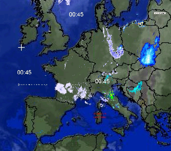 Hier ein Bild 0045 Uhr Meteox und noch etwas mehr Europa ( Italien Nord /Mitte, Sizilien, Schweiz, Kroatien, Polen). Zeit ca. innerhalb einer Stunde rückwärts.(0045 Uhr)