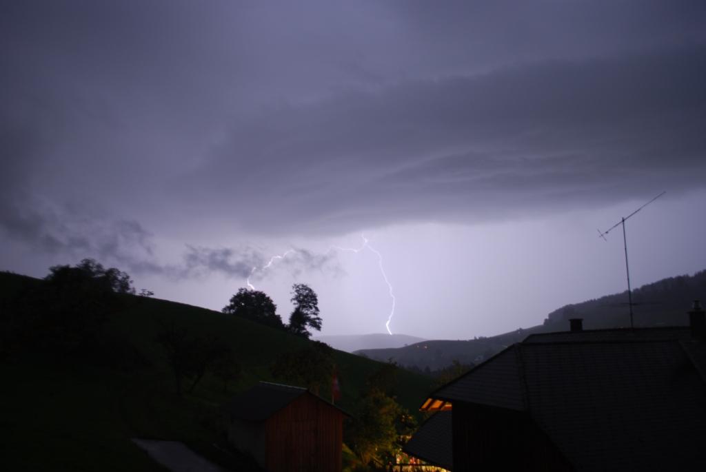Die Saison ist gerettet =). Es ist doch nicht bei den zwei nächtlichen Blitzbildern geblieben. Zwar war die Kaltfrontpassage vorhin belichtungstechnisch alles andere als anspruchslos, doch hat's zumindest einige Male aufgeleuchetet . Zwischendurch blitzte es im 5s / Takt mal dort, mal da und mal hier. Zweimal habe ich ganz schön den Kopf eingezogen, als ich zwischen Blitz und Househaker nicht einmal auf zwei zählen konnte. Der nächste war ebenfalls derjenige, der auf dem zweiten Bild zu sehen ist. Man beachte den Schattenwurf (bzw. DIE?) des Kamins: