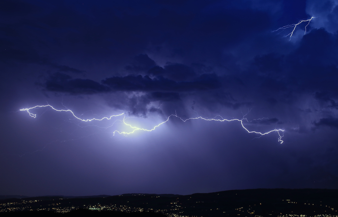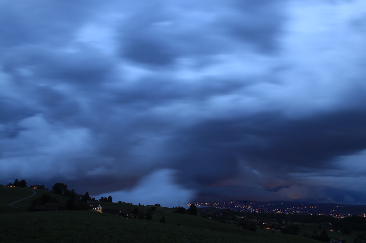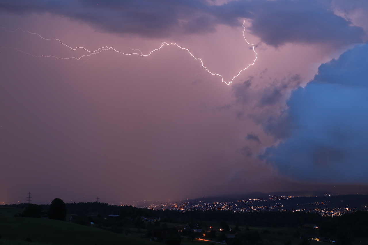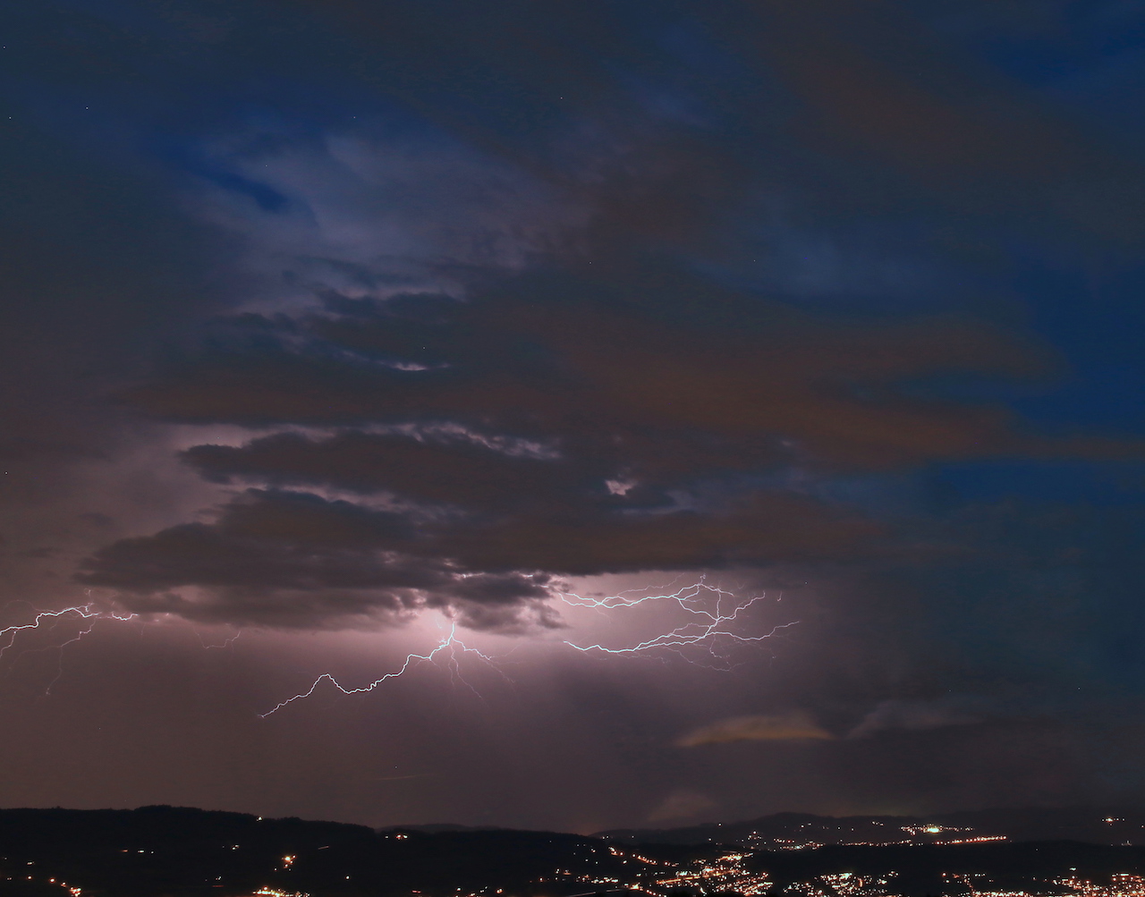 Ich kann noch ein paar Blitzbilder beisteuern. Alles roh und unbearbeitet. Erstes Bild am Abend in Thalwil. Die anderen vom Hirzel aus mit Blick Richtung N und NE auf die Zürcher Zelle: