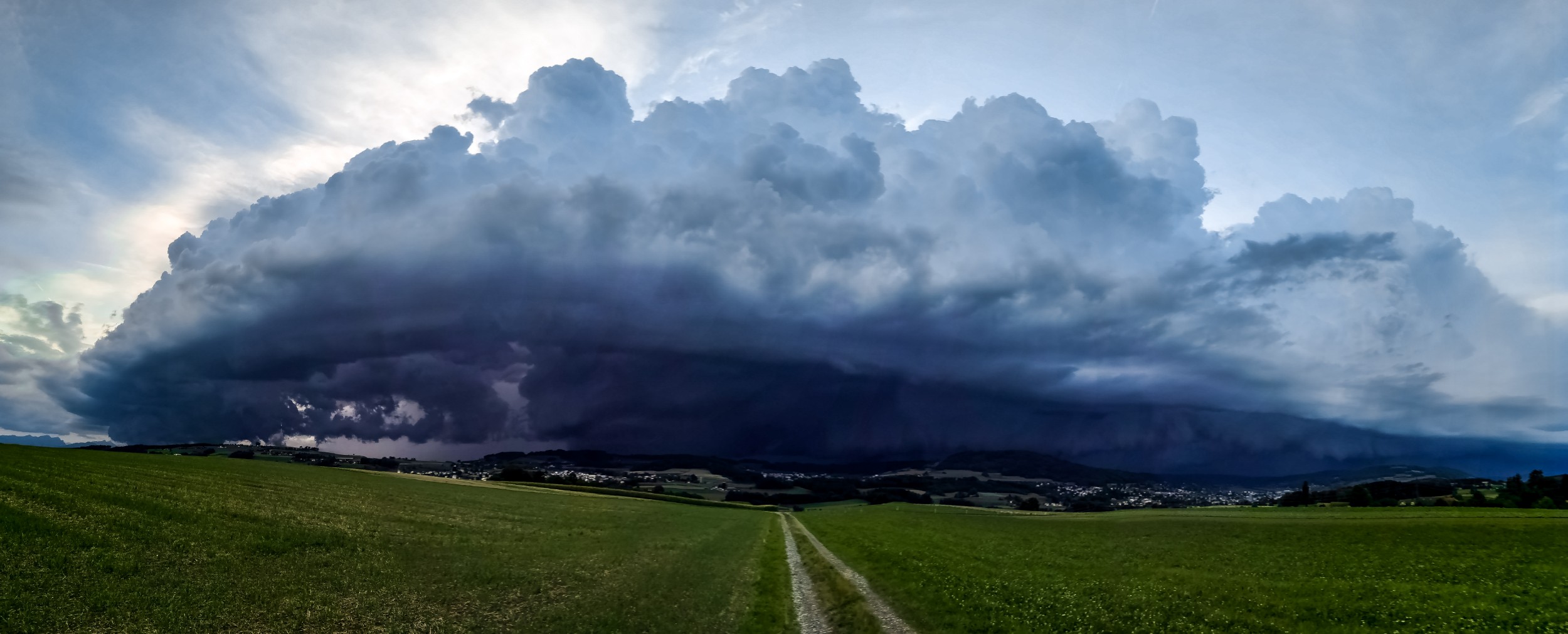 Auch in Sellenbüren war der Aufzug der 2. Linie beeindruckend. Beim Näherkommen flackerte es nicht nur in Bodennähe, sondern teils auch hoch oben in den Wolkentürmen. Anbei ein paar Schnappschüsse, teils Handy-Panoramas.