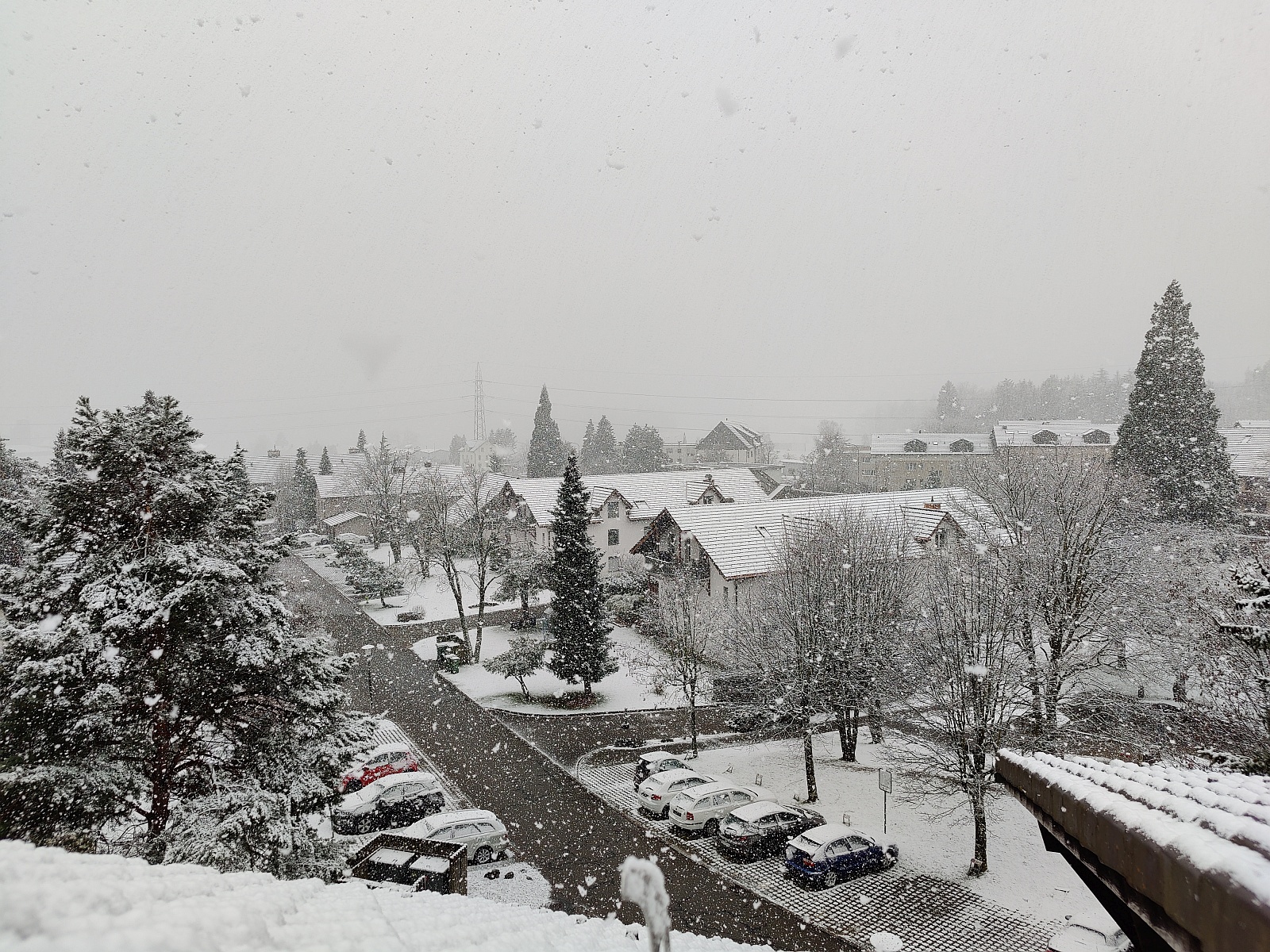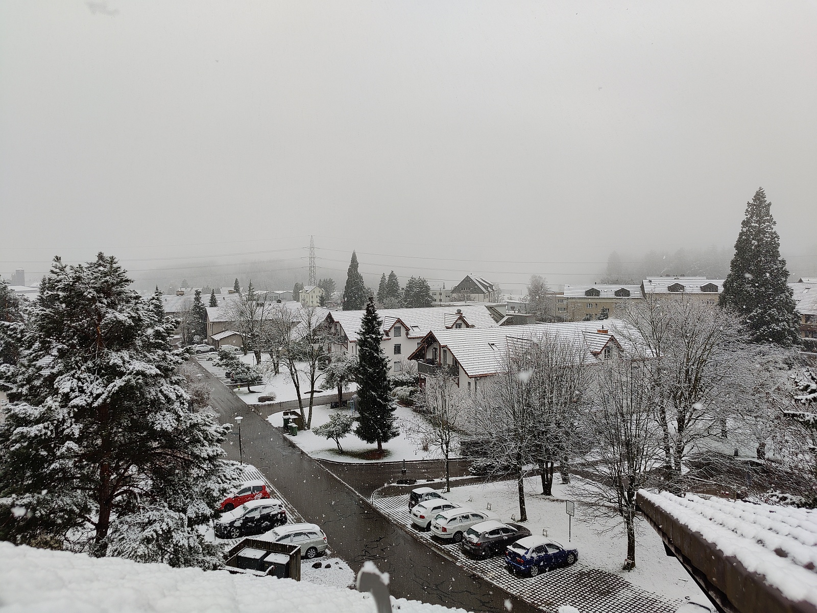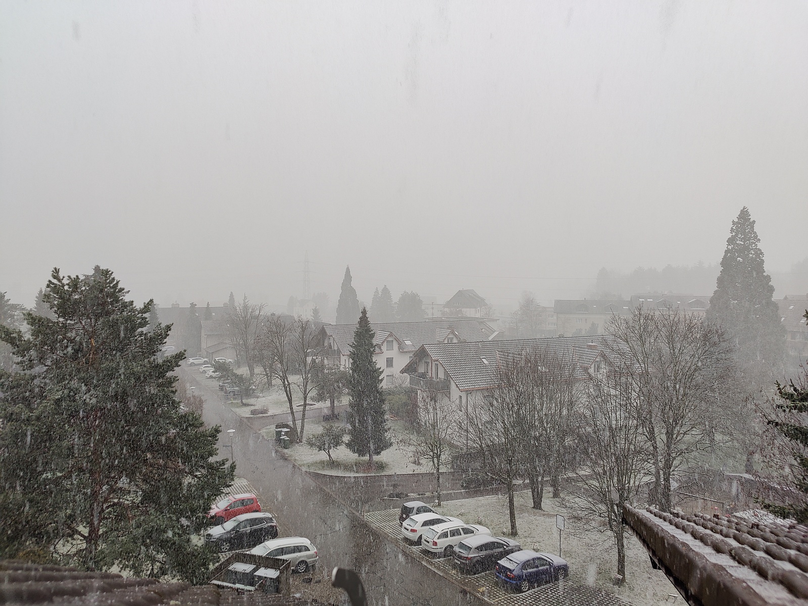 Nach dem Schneeschauer der ca. eine halbe Stunde gedauert hat, war Küssnacht mit einer leichten Schneedecke überzuckert. Auf der Strasse lag etwa 2cm Pflotsch.
