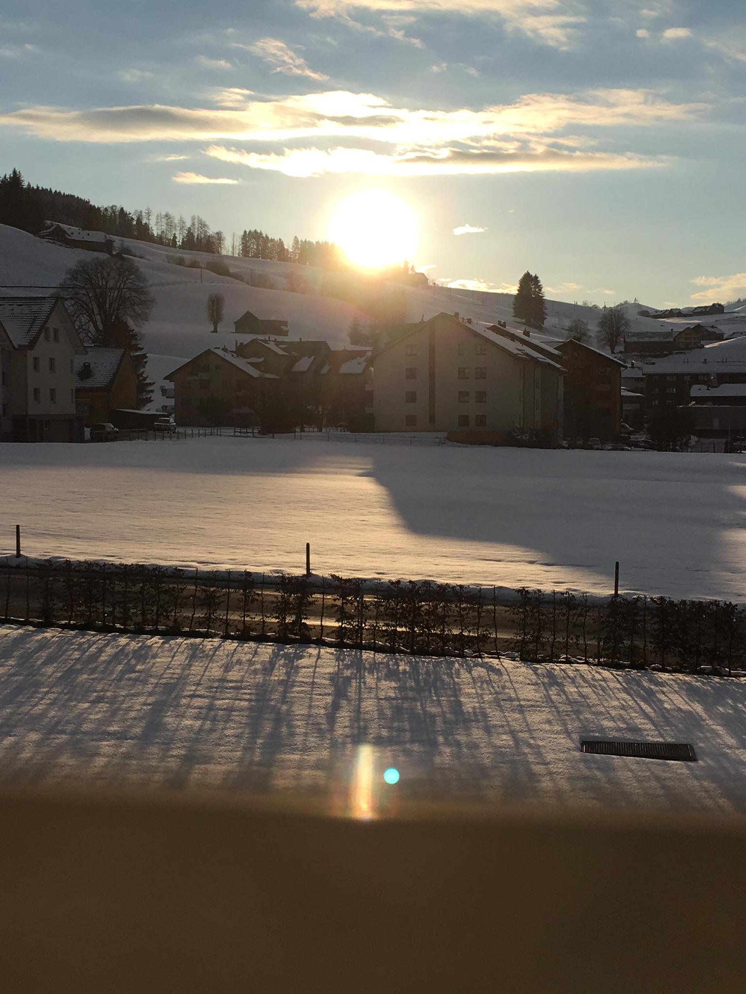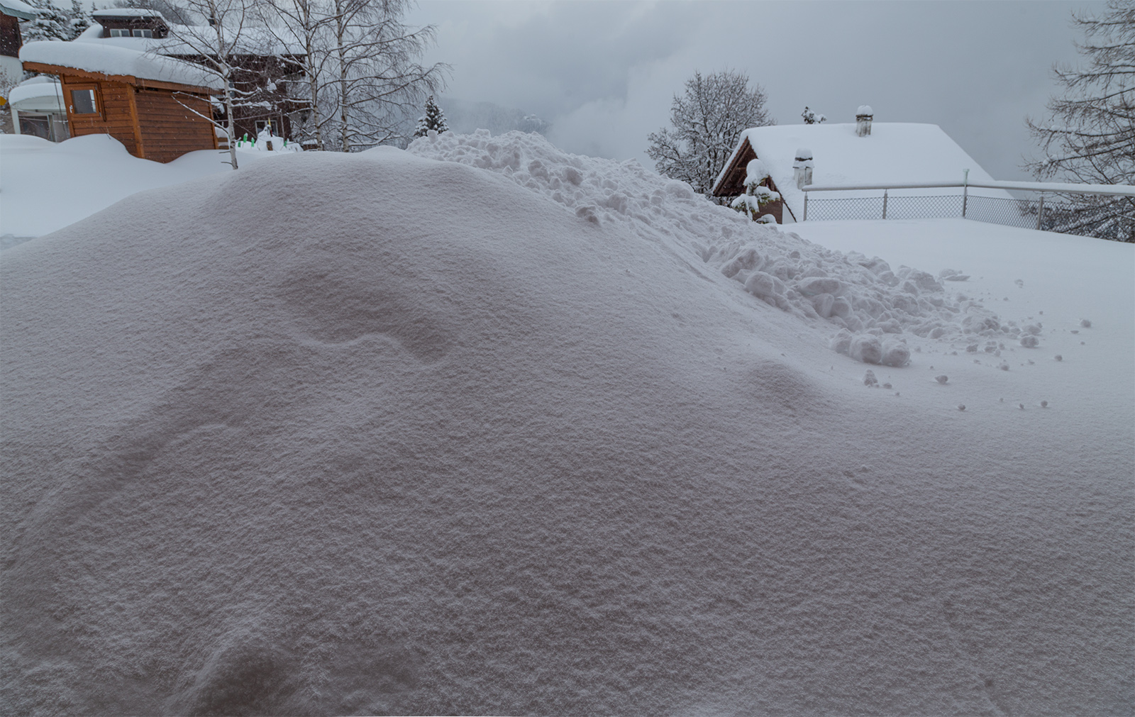 Auf den Dächern liegt relativ wenig Schnee, da viel Wind und Pulverschnee im Spiel waren. Den Schneehöhenzuwachs sieht man am besten beim Geländer, wo der Landi-Regenmesser befestigt ist, in der Ecke vom Geländer.
